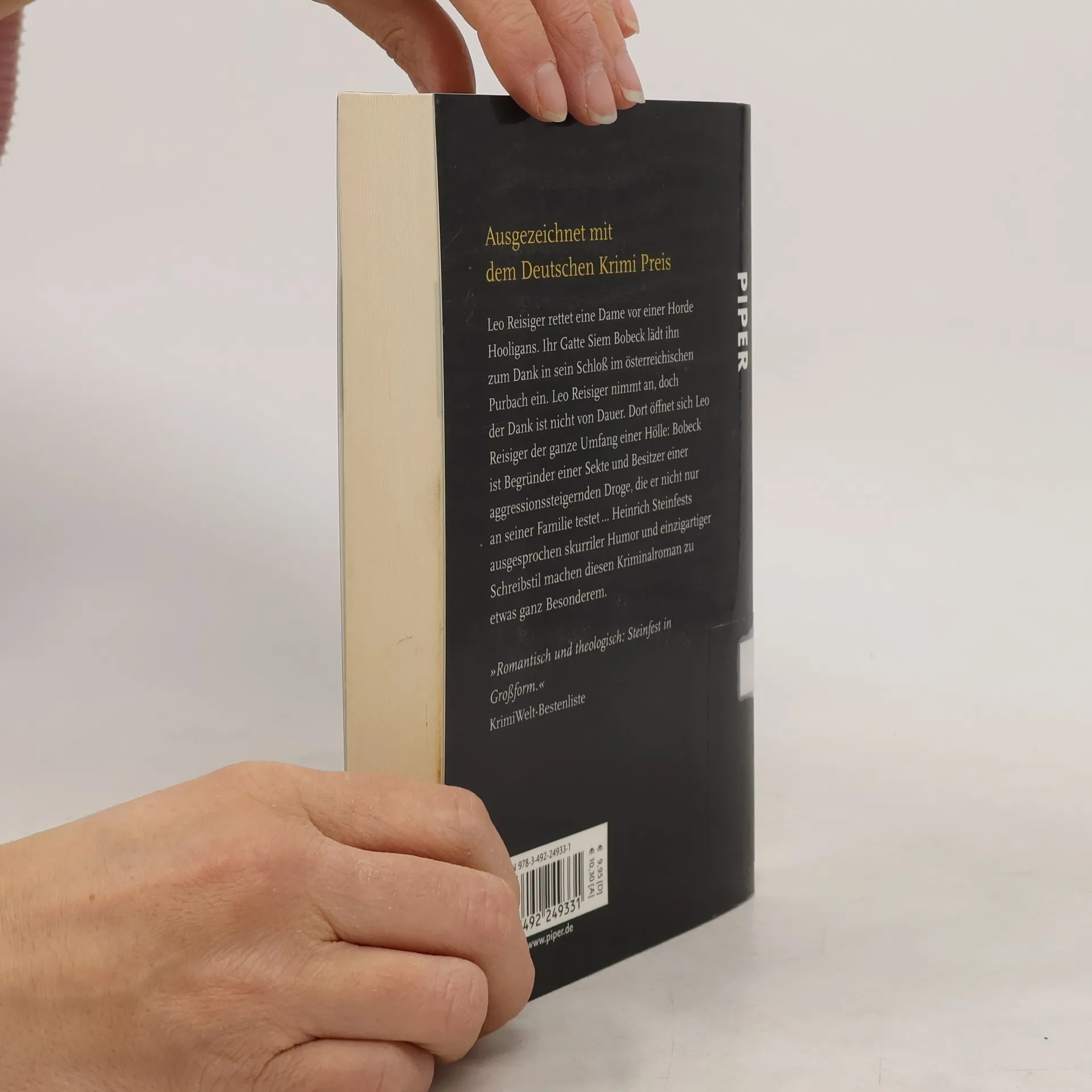 Leo Reisiger rettet eine Dame vor einer Horde Hooligans. Ihr Gatte Siem Bobeck lädt ihn zum Dank in sein Schloss im österreichischen Purbach ein. Reisiger nimmt an, doch der Dank ist nicht von Dauer. Dort öffnet sich Reisiger der ganze Umfang einer Hölle: Bobeck ist Begründer einer Sekte und auf der Suche nach einem legendären mittelalterlichen Buch. Als Reisiger aus der Hölle entlassen wird, sitzt er im Rollstuhl, und Bobeck lebt immer noch … Heinrich Steinfests ausgesprochen skurriler Humor und einzigartiger Schreibstil machen diesen Kriminalroman zu etwas ganz Besonderem.
