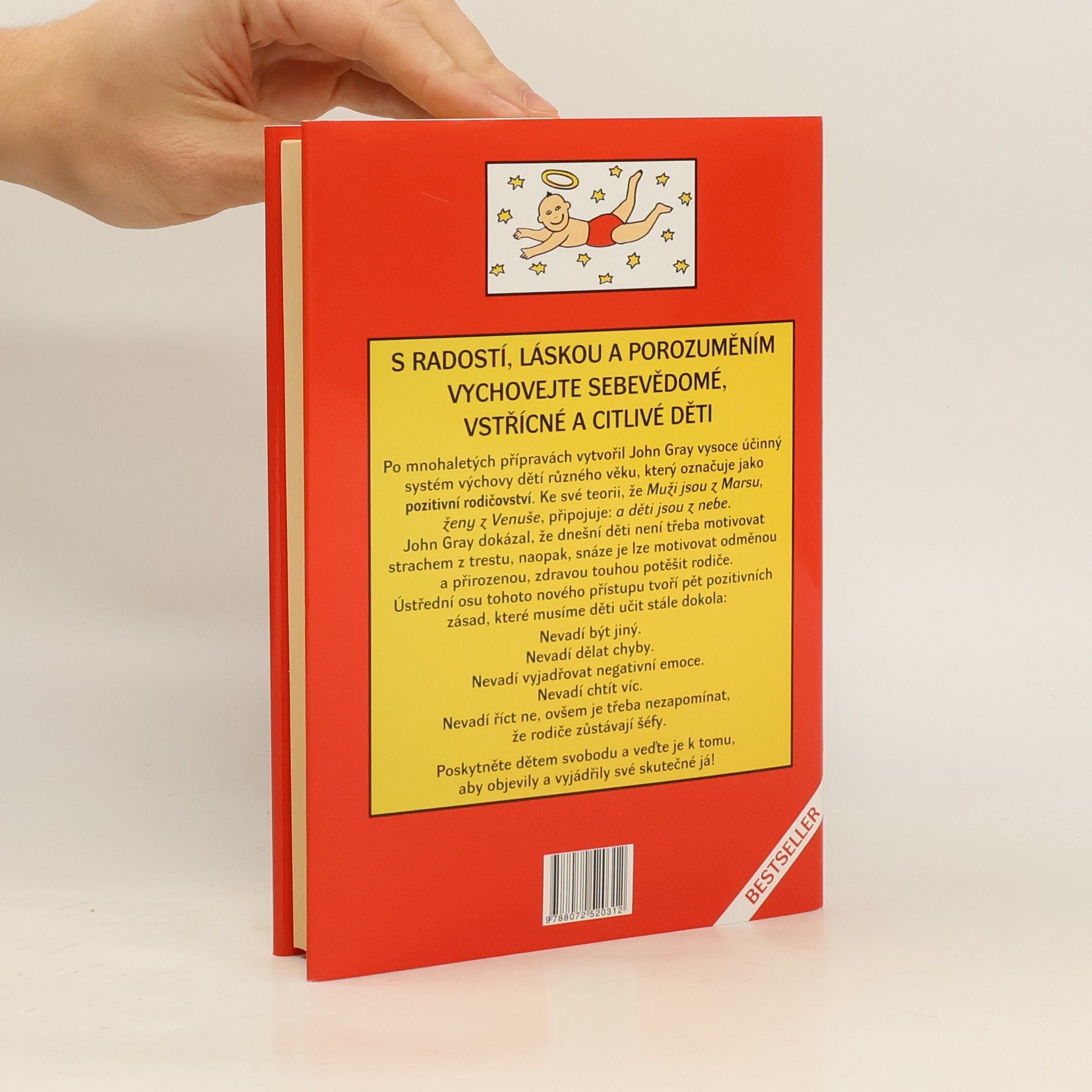S radostí, láskou a porozuměním vychovejte sebevědomé, vstřícné a citlivé děti. Po mnohaletých přípravách vytvořil John Gray vysoce účinný systém výchovy dětí různého věku, který označuje jako pozitivní rodičovství. Ke své teorii, že muži jsou z Marsu, ženy z Venuše, připojuje: a děti jsou z nebe. John Gray dokázal, že dnešní děti není třeba motivovat strachem z trestu, naopak, snáze je lze motivovat odměnou a přirozenou, zdravou touhou potěšit rodiče. Ústřední osu tohoto nového přístupu tvoří pět pozitivních zásad, které musíme děti učit stále dokola: Nevadí být jiný. Nevadí dělat chyby. Nevadí vyjadřovat negativní emoce. Nevadí chtít víc. Nevadí říct ne, ovšem je třeba nezapomínat, že rodiče zůstávají šéfy. Poskytněte dětem svobodu a veďte je k tomu, aby objevily a vyjádřily své skutečné já! (zásady pozitivního rodičovství, vedoucí k výchově spolupracujících, sebevědomých a citlivých dětí)