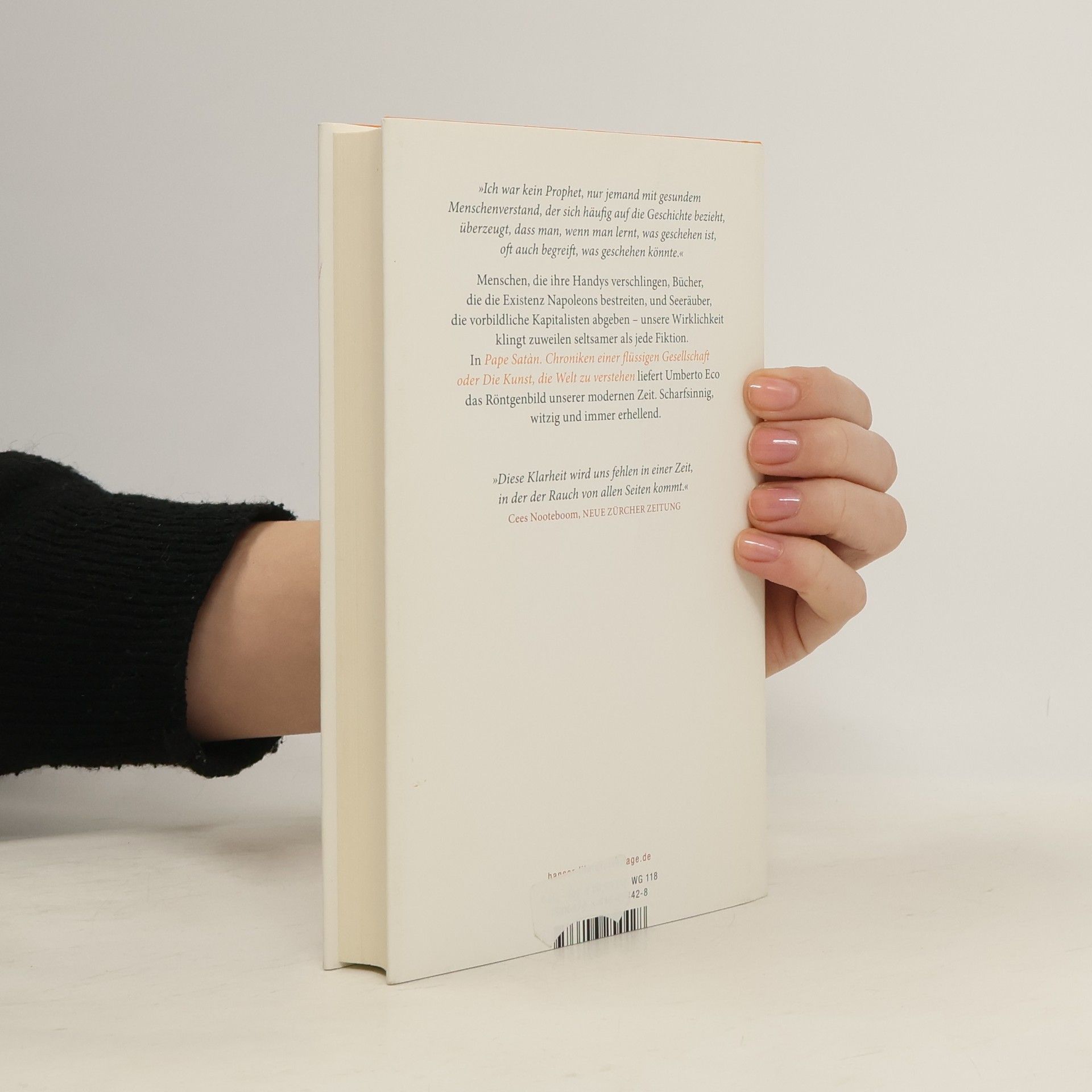 Menschen, die ihre Handys verschlingen, Bücher, die die Existenz Napoleons bestreiten und Seeräuber, die vorbildliche Kapitalisten abgeben – so absurd die Phänomene der modernen Gesellschaft erscheinen mögen, sie werfen dringliche Fragen auf: Blüht auf dem Boden einer überkorrekten Politik ein neuer Rassismus? Kann man sich im digitalen Dschungel durchschlagen, ohne völlig den Kopf zu verlieren? Ecos Antworten lassen das Röntgenbild einer modernen Gesellschaft entstehen, sie sind ein letztes Geschenk an seine Leser – scharfsinnig, witzig und immer erhellend. „Pape Satàn“ ist ein Buch, das belebend wirkt wie ein gutes Gespräch, und es ist eine Liebeserklärung an das Lesen.