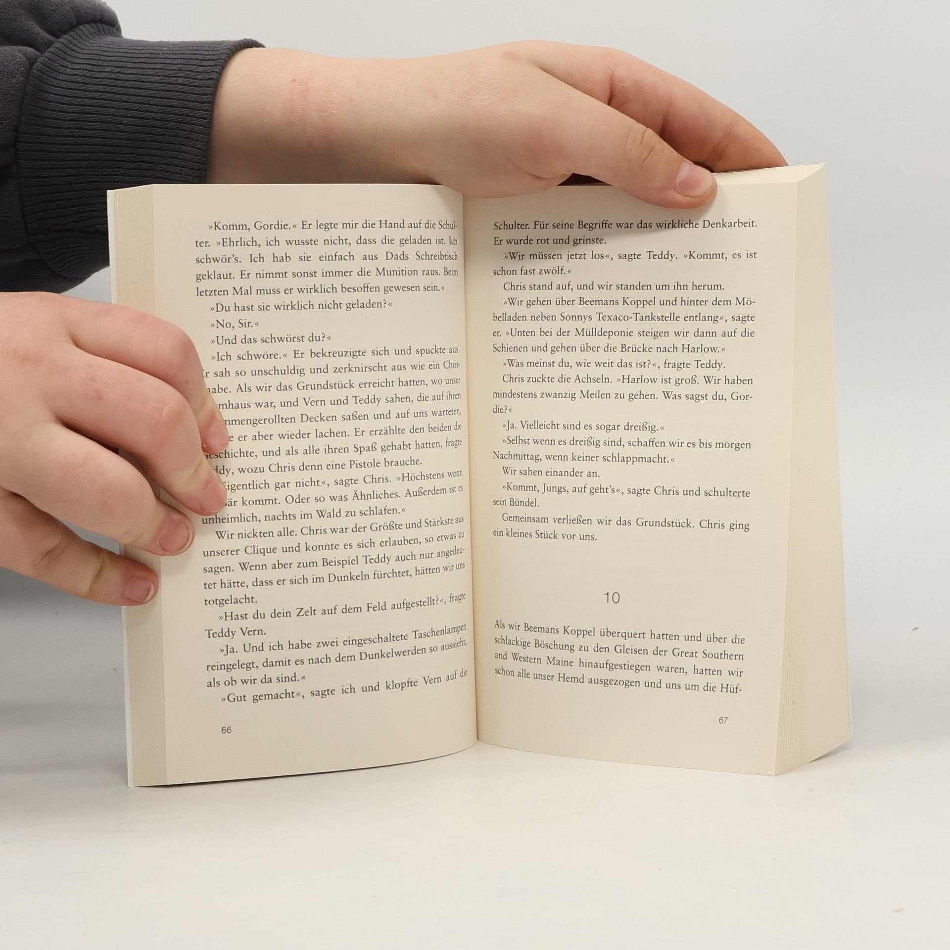 »Liebe ist nicht, was diese Arschlöcher von Poeten einen glauben machen wollen. Die Liebe hat Zähne; sie beißen; die Wunden schließen sich nie.«Die vier besten Freunde Gordon, Chris, Teddy und Vern aus Castle Rock hören von der Leiche eines gleichaltrigen Jungen, die in der Gegend an den Bahngleisen liegen soll. Sie wagen sich auf einer abenteuerlichen Suche tief in die Wälder Maines, wo sie bei Sonnenschein und Blitz und Donner mehr über die Liebe, den Tod und die eigene Sterblichkeit erfahren, als ihnen lieb ist.»Herbst«-Geschichte aus dem Erzählband »Frühling, Sommer, Herbst und Tod«.Großartig verfilmt unter dem Titel »Stand By Me« mit Kiefer Sutherland und River Phoenix.
