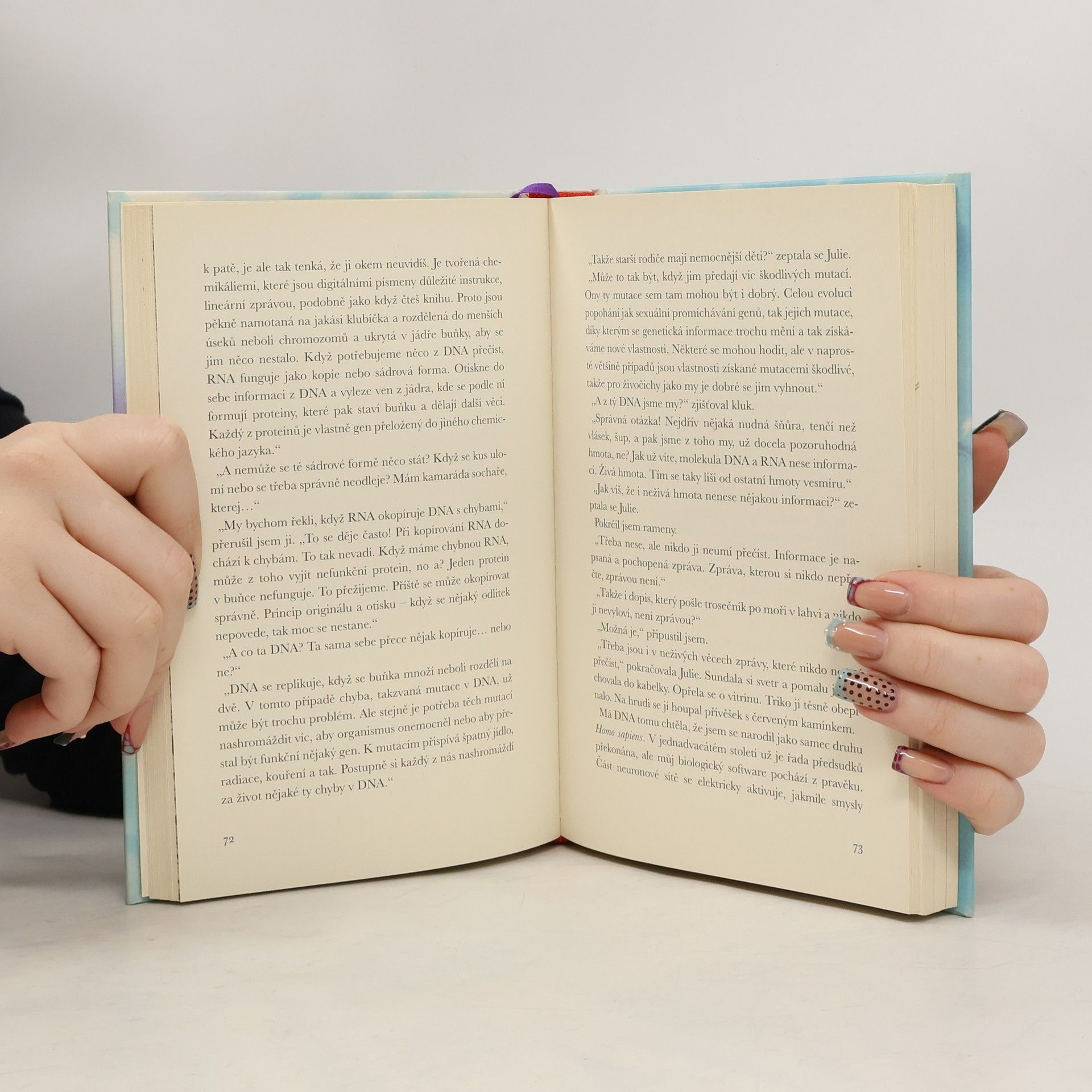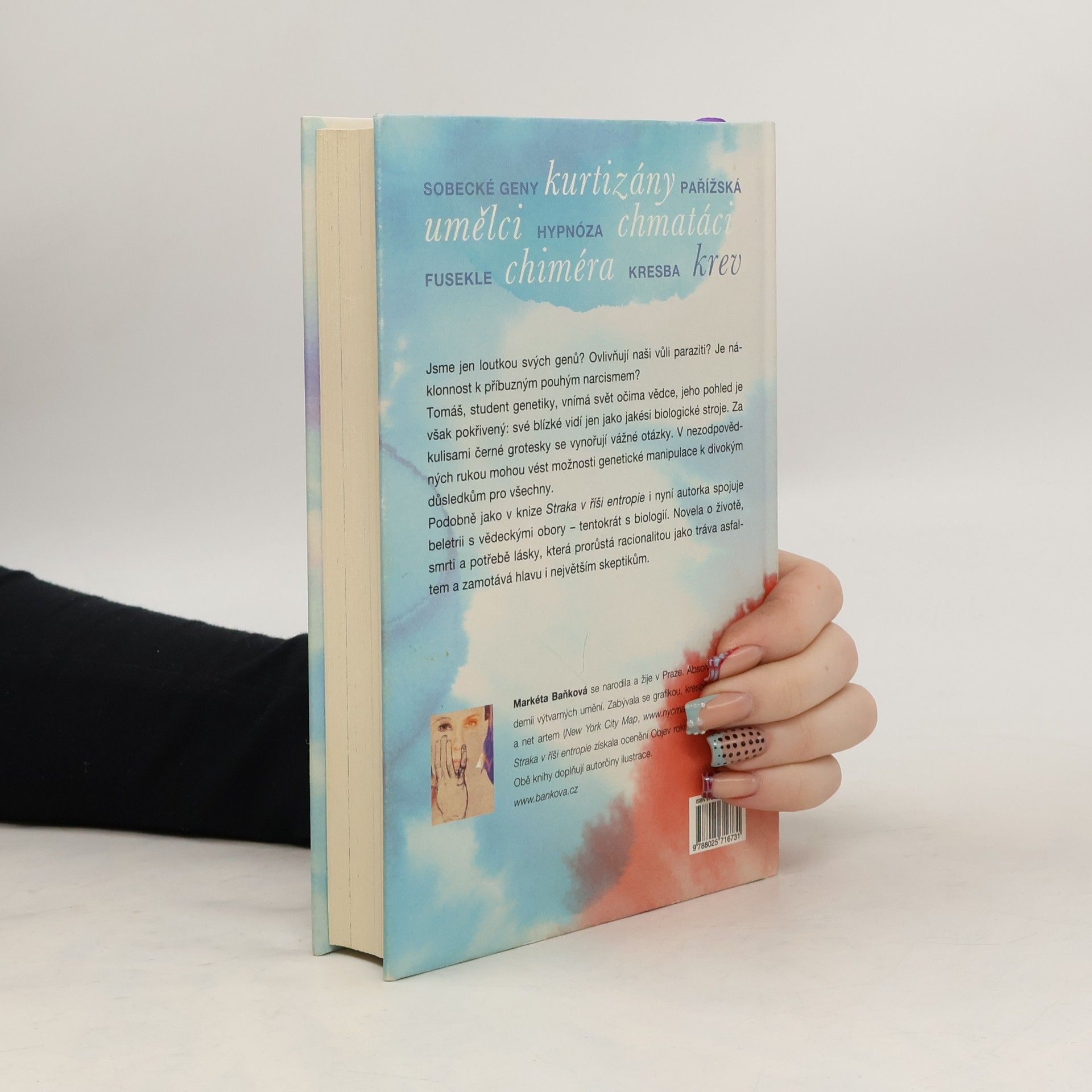 Ve své nové knize autorka opět spojuje beletristický text s vědeckými motivy, které knihu ilustrují a dotvářejí. Tentokrát je jejím tématem biologie. Pod maskou černé komedie se skrývá zkoumání lidské identity, problému, který přinesla dnešní doba nových objevů především v genetice, a s tím související otázky svobodné vůle. Jsme nástrojem vlastních genů? Ovlivňují naše myšlení paraziti? Nebo snad nejvíc vliv společnosti, ve které vyrůstáme? Hlavní hrdina Tomáš je student genetiky vychovaný adoptivními rodiči, pátrající pro vlastních kořenech. Věda formuje jeho pohled na svět, ale tato optika může pokřivovat jeho mezilidské, obzvlášť milostné vztahy.