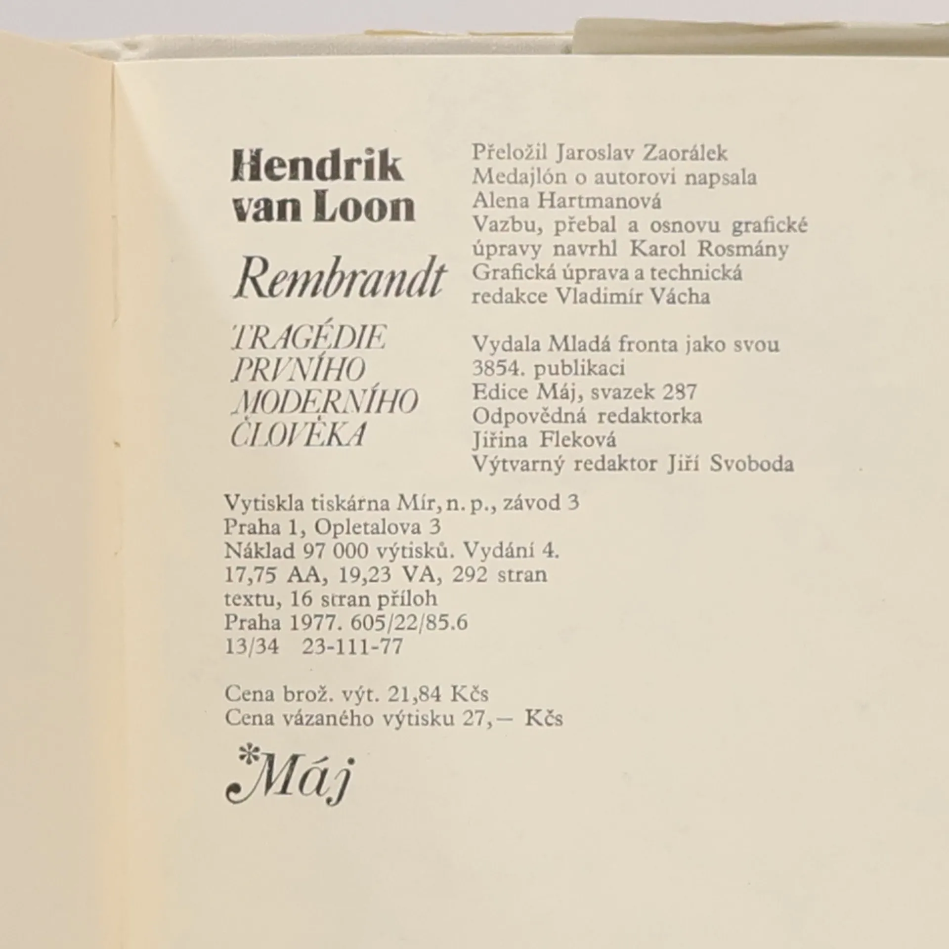 Podtitul: Tragédie prvního moderního člověka Životopisný román, zachycující osud holandského malíře Rembrandta. Životopisný román z pera holandského popularizátora umění zachycuje na pozadí holandské společnosti 17. století dramatické životní osudy jednoho z největších malířůvšech dob, člověka, který okusil opojnost slávy, bohatství aštěstí i hořkost neporozumění, bídy a zoufalství. Román je doplněn řadou reprodukcí obrazů, leptů a kreseb, k nimž se vztahují příběhy románu.