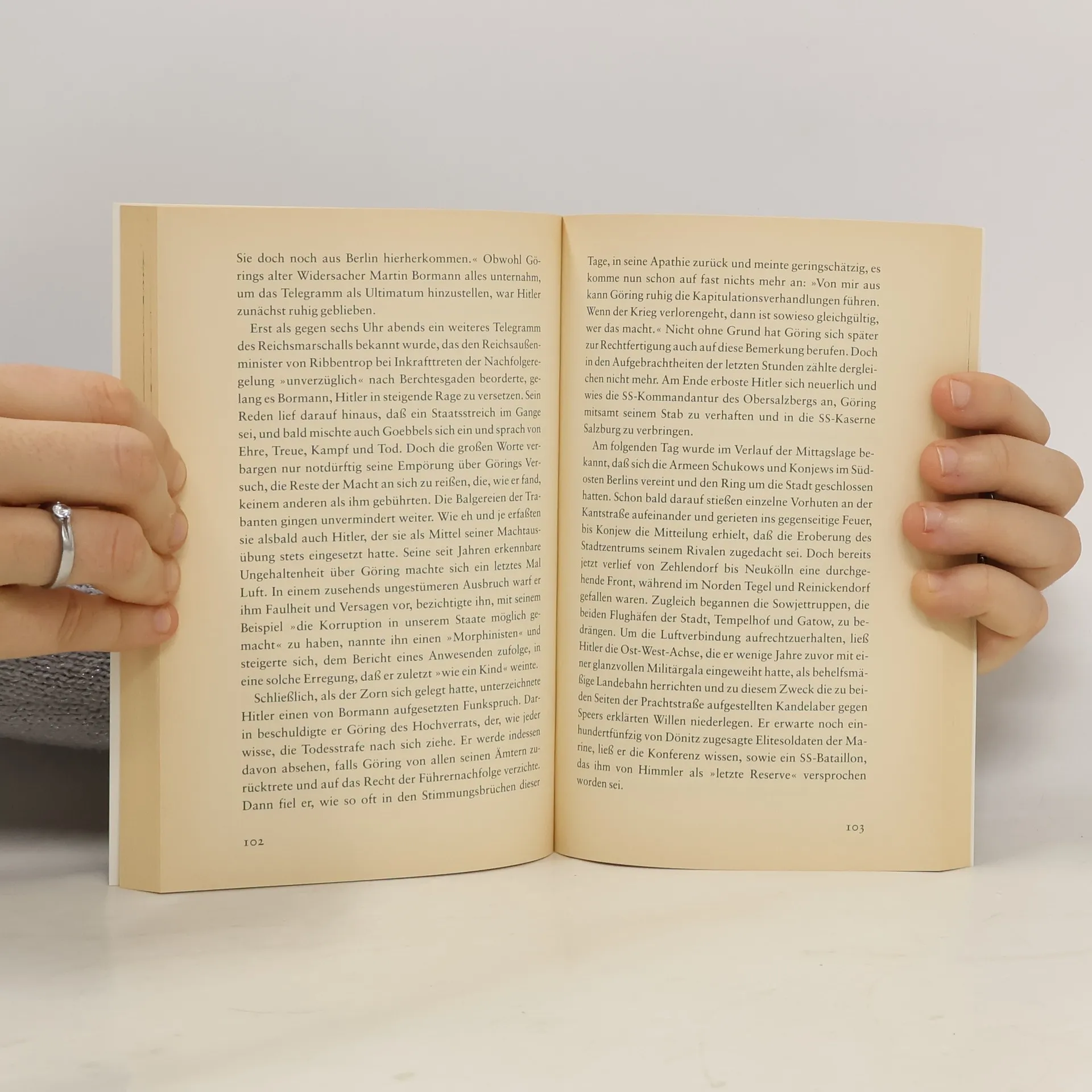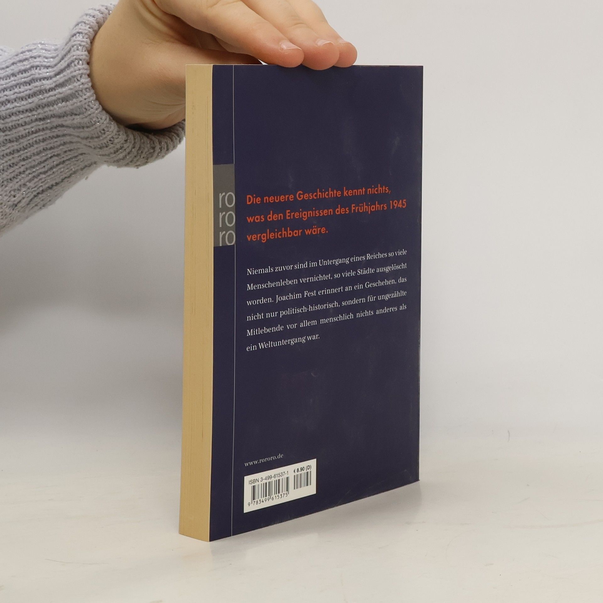 Die neuere Geschichte kennt nichts, was den Ereignissen des Frühjahrs 1945 vergleichbar wäre.Niemals zuvor sind im Untergang eines Reiches so viele Menschenleben vernichtet, so viele Städte ausgelöscht worden. Joachim Fest erinnert an ein Geschehen, das nicht nur politisch-historisch, sondern für ungezählte Mitlebende vor allem menschlich nichts anderes als ein Weltuntergang war.