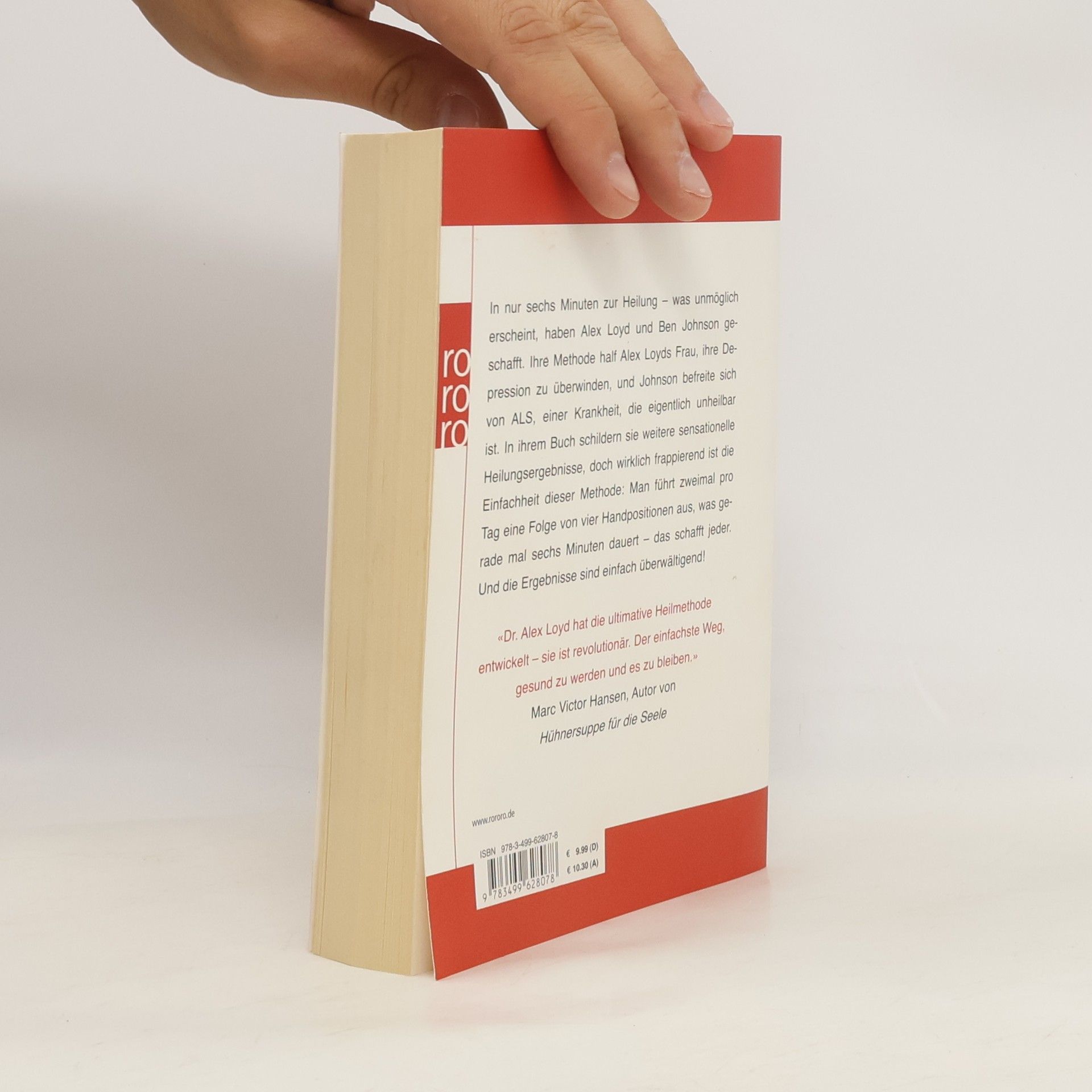 In nur sechs Minuten zur Heilung – was unmöglich erscheint, haben Alex Loyd und Ben Johnson geschafft. Ihre Methode half Alex Loyds Frau, ihre Depression zu überwinden, und Johnson befreite sich von ALS, einer Krankheit, die eigentlich unheilbar ist. In ihrem Buch schildern sie weitere sensationelle Heilungsergebnisse, doch wirklich frappierend ist die Einfachheit dieser Methode: Man führt zweimal pro Tag eine Folge von vier Handpositionen aus, was gerade mal sechs Minuten dauert – das schafft jeder. Und die Ergebnisse sind einfach überwältigend!«Dr. Alex Loyd hat die ultimative Heilmethode entwickelt – sie ist revolutionär. Der einfachste Weg, gesund zu werden und es zu bleiben.» Marc Victor Hansen, Autor von Hühnersuppe für die Seele
