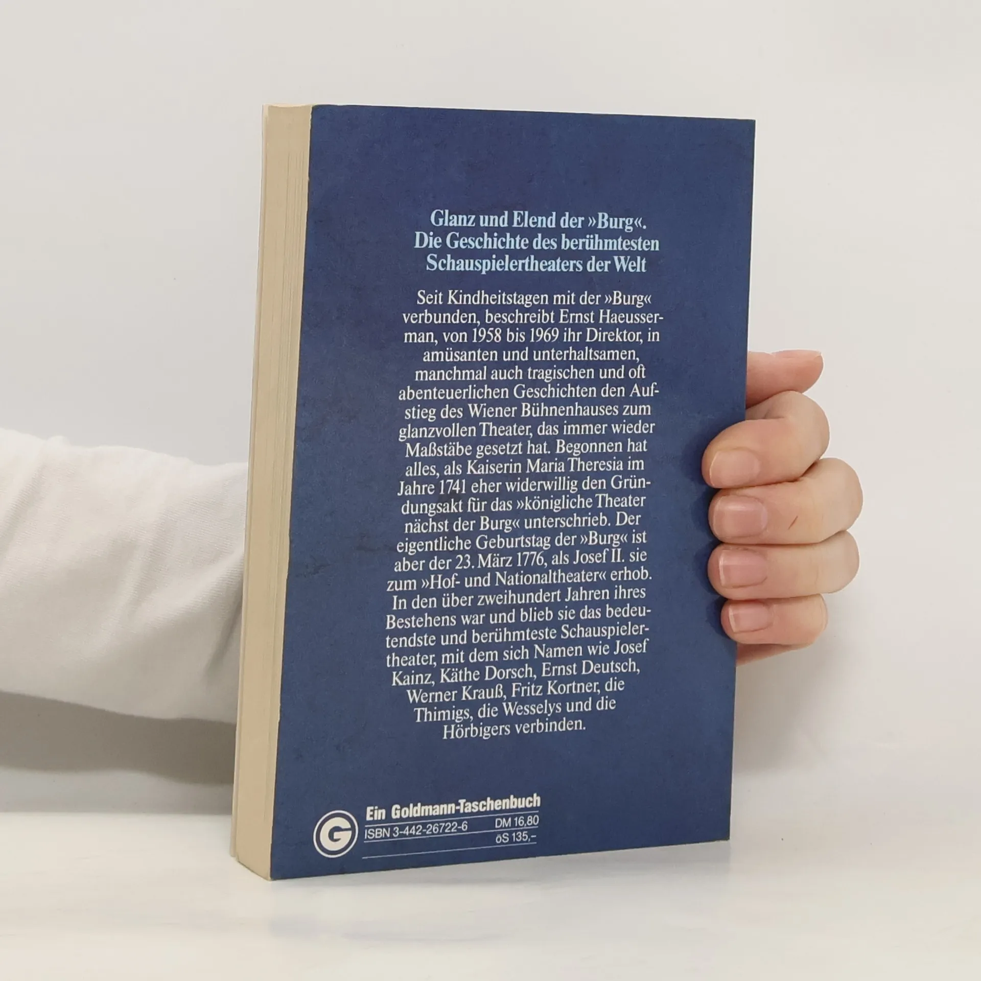 Glanz und Elend der »Burg«. Die Geschichte des berühmtesten Schauspielertheaters der Welt. Seit Kindheitstagen mit der »Burg« verbunden, beschreibt Ernst Haeusserman, von 1958 bis 1969 ihr Direktor, in amüsanten und unterhaltsamen, manchmal auch tragischen und oft abenteuerlichen Geschichten den Aufstieg des Wiener Bühnenhauses zum glanzvollen Theater, das immer wieder Maßstäbe gesetzt hat. Begonnen hat alles, als Kaiserin Maria Theresia im Jahre 1741 eher widerwillig den Gründungsakt für das »königliche Theater nächst der Burg« unterschrieb. Der eigentliche Geburtstag der »Burg« ist aber der 23. März 1776, als Josef II. sie zum »Hof- und Nationaltheater« erhob. In den über zweihundert Jahren ihres Bestehens war und blieb sie das bedeutendste und berühmteste Schauspielertheater, mit dem sich Namen wie Josef Kainz, Käthe Dorsch, Ernst Deutsch, Werner Krauß, Fritz Kortner, die Thimigs, die Wesselys und die Hörbigers verbinden.