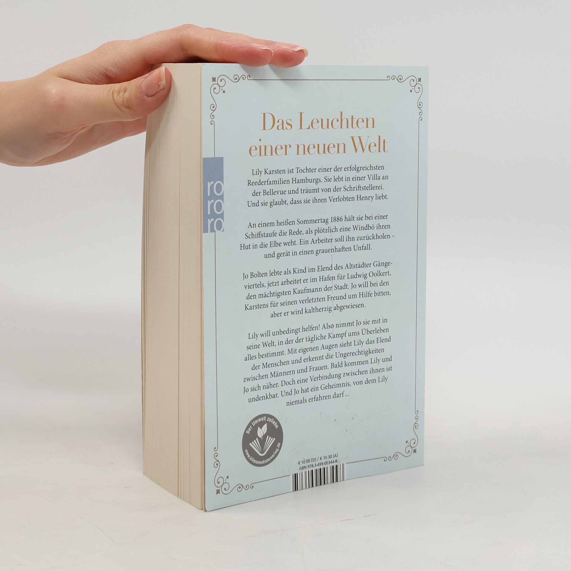 Das Leuchten einer neuen Welt Lily Karsten ist Tochter einer der erfolgreichsten Reederfamilien Hamburgs. Sie lebt in einer Villa an der Bellevue und träumt von der Schriftstellerei. Und sie glaubt, dass sie ihren Verlobten Henry liebt. An einem heißen Sommertag 1886 hält sie bei einer Schiffstaufe die Rede, als plötzlich eine Windbö ihren Hut in die Elbe weht. Ein Arbeiter soll ihn zurückholen – und gerät in einen grauenhaften Unfall. Jo Bolten lebte als Kind im Elend des Altstädter Gängeviertels, jetzt arbeitet er im Hafen für Ludwig Oolkert, den mächtigsten Kaufmann der Stadt. Jo will bei den Karstens für seinen verletzten Freund um Hilfe bitten, aber er wird kaltherzig abgewiesen. Lily will unbedingt helfen! Also nimmt Jo sie mit in seine Welt, in der der tägliche Kampf ums Überleben alles bestimmt. Mit eigenen Augen sieht Lily das Elend der Menschen und erkennt die Ungerechtigkeiten zwischen Männern und Frauen. Bald kommen Lily und Jo sich näher. Doch eine Verbindung zwischen ihnen ist undenkbar. Und Jo hat ein Geheimnis, von dem Lily niemals erfahren darf ...