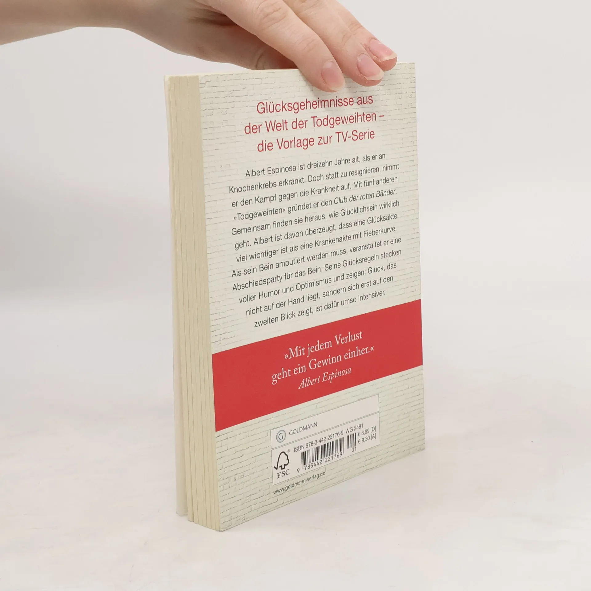 Der internationale Bestseller - die wahre Geschichte hinter der VOX-TV-Serie Albert Espinosa ist vierzehn Jahre alt, als er an Knochenkrebs erkrankt. Doch statt zu resignieren, nimmt er den Kampf gegen die Krankheit auf. Mit fünf anderen „Todgeweihten“ gründet er den Club der roten Bänder. Gemeinsam finden sie heraus, wie Glücklichsein wirklich geht. Albert ist davon überzeugt, dass eine Glücksakte viel wichtiger ist als eine Krankenakte mit Fieberkurve. Als sein Bein amputiert werden muss, veranstaltet er eine Abschiedsparty für das Bein. Seine Glücksregeln stecken voller Humor und Optimismus und zeigen: Glück, das nicht auf der Hand liegt, sondern sich erst auf den zweiten Blick zeigt, ist dafür umso intensiver. Diese Ausgabe ist inhaltlich identisch mit der Ausgabe Espinosa, Glücksgeheimnisse aus der gelben Welt.