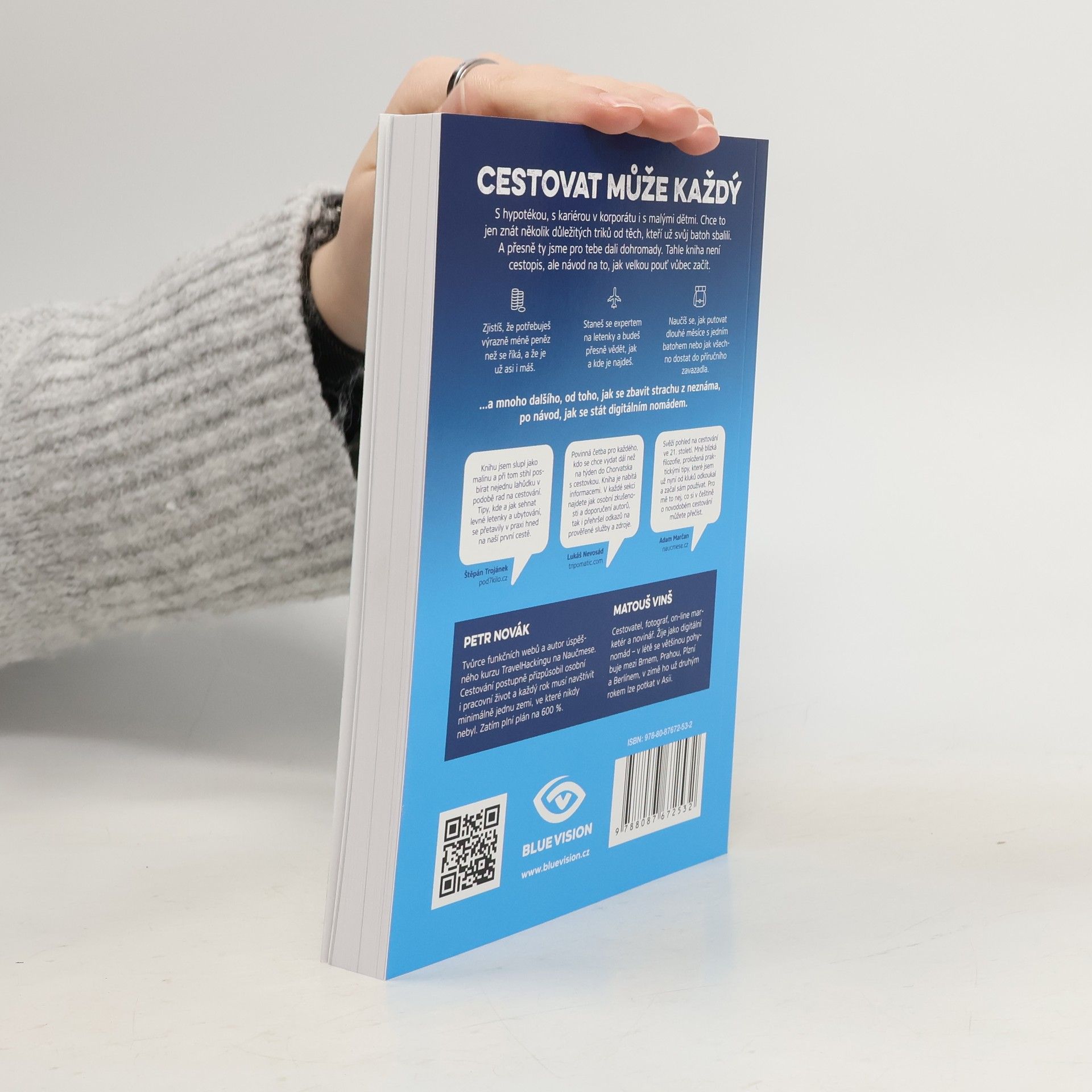 Cestovat může každý. S hypotékou, s kariérou v korporátu i s malými dětmi. Chce to jen znát pár důležitých triků od těch, kteří už svůj batoh sbalili. A přesně ty dali cestovatelé Matouš Vinš a Petr Novák v knize dohromady. Zdaleka přitom nečerpali jen z vlastních zkušeností, oslovili i mnoho ostřílených kolegů dobrodruhů a světoběžníků. Travel Bible je návod na to, jak velkou pouť vůbec začít a jak si ji naplno užít. Po jejím přečtení přestanete jen snít a skutečně vyrazíte do zemí, kam už se tak dlouho toužíte podívat. Zažijete věci, na které do konce života nezapomenete, a poznáte místa, která neuvidíte ani v National Geographic. V knize zjistíte, jak si na cestu našetřit, jak sehnat levné letenky a jak neutratit zbytečně mnoho za ubytování. Cestovat se dá i chytře, zdaleka není potřeba šetřit za každou cenu. Uvědomíte si, že nejlepší způsob je co nejvíce splynout s místními obyvateli a přestat se chovat jako turista. V druhé části knihy vám autoři přiblíží možnosti dobrovolničení a práce na cestách, přidají své zkušenosti s digitálním nomádstvím a pomůžou vám se osvobodit z klasických pracovních stereotypů. Závěr knihy věnují možnostem, jak si díky zážitkům, fotkám a videím z cest vydělat na objevování dalších zemí.