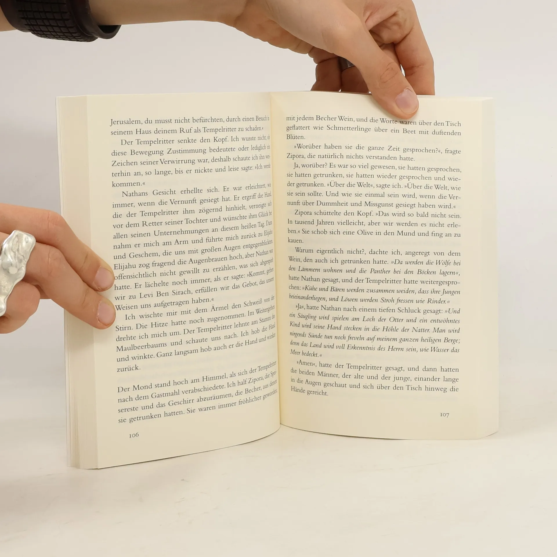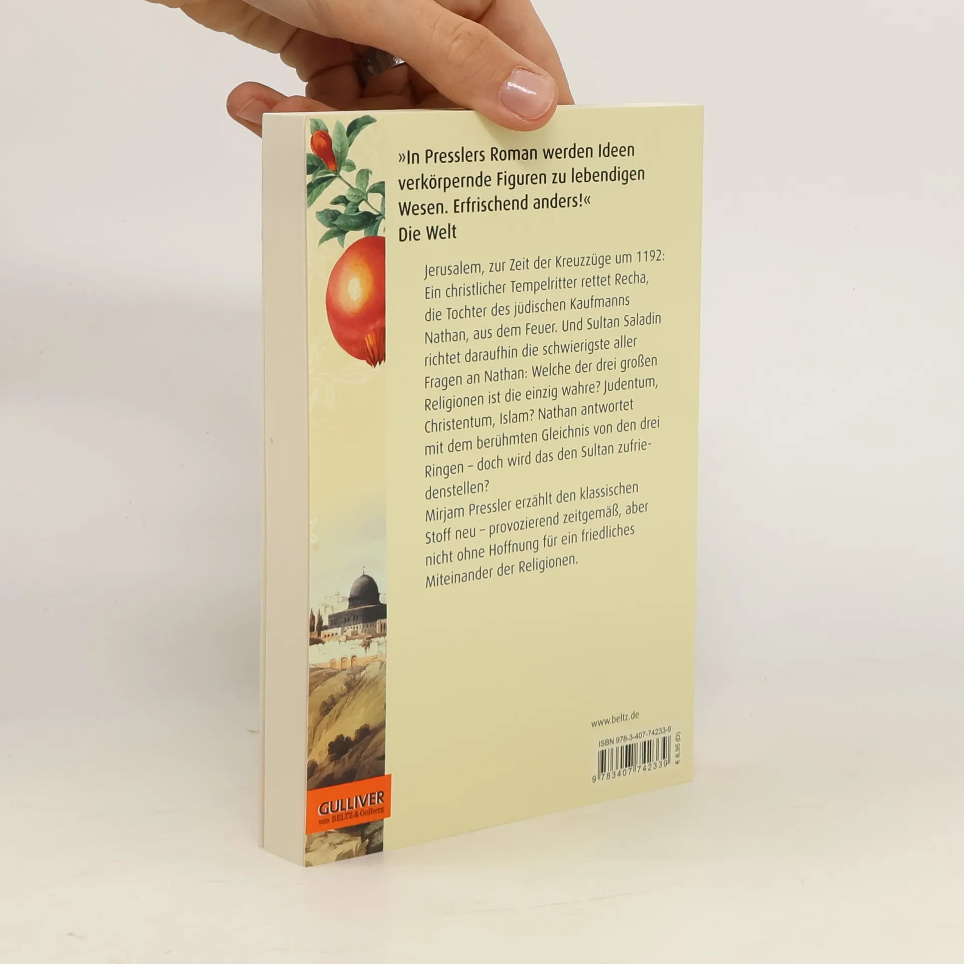 »Ein hochaktuelles, spannendes Buch über Toleranz und die Koexistenz der drei Religionen, die ja bis heute nicht gelingt.« Frankfurter Rundschau Jerusalem, zur Zeit der Kreuzzüge um 1192: Ein junger Tempelritter rettet Recha, die Tochter des jüdischen Kaufmanns Nathan, aus dem Feuer. Daraufhin richtet Sultan Saladin die schwierigste aller Fragen an Nathan: Welche Religion ist die einzig wahre? Nathan antwortet mit dem berühmten Gleichnis von den drei Ringen – doch wird das den Sultan zufriedenstellen? Außerdem ahnt Nathan nicht, dass ihm inzwischen der christliche Patriarch von Jerusalem und ein moslemischer Hauptmann nach dem Leben trachten ... Mirjam Pressler erzählt den klassischen Stoff neu – provozierend zeitgemäß, aber nicht ohne Hoffnung für ein friedliches Nebeneinander der Religionen.