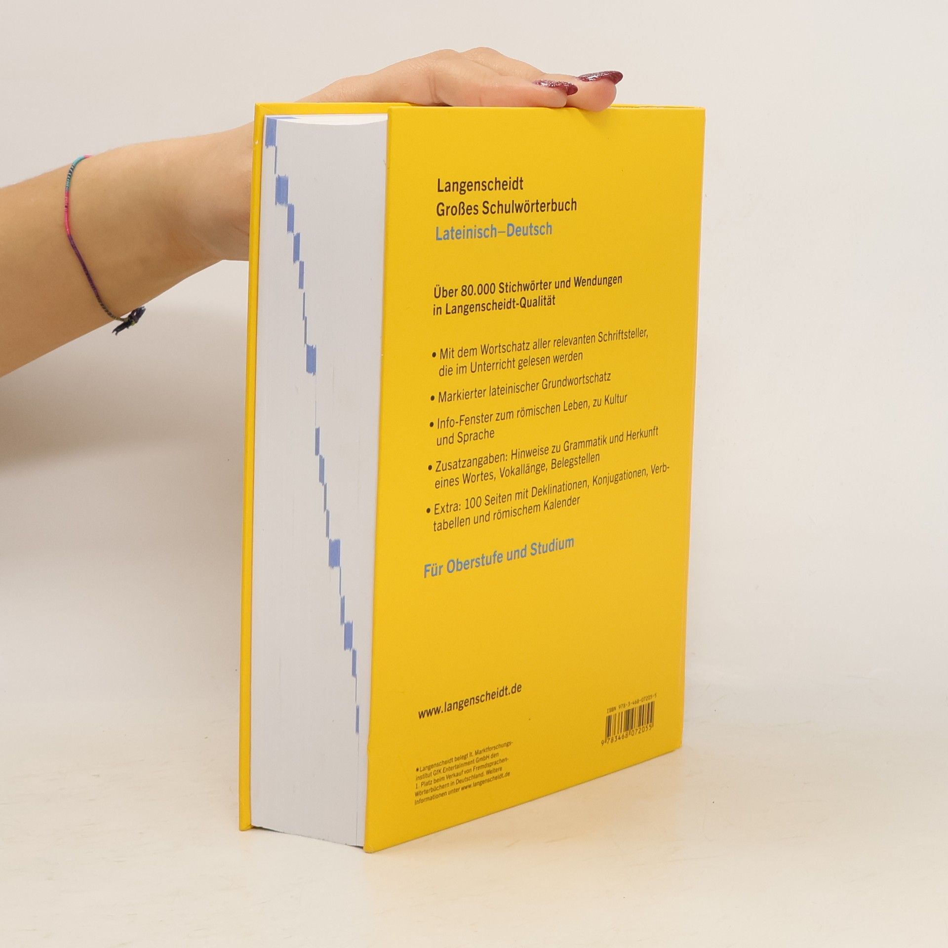 Das Große Schulwörterbuch Lateinisch - Deutsch von Langenscheidt in völliger Neubearbeitung beinhaltet über 80.000 Stichwörter und Wendungen aus dem gekennzeichneten Grundwortschatz und dem Wortschatz aller relevanten Schriftsteller, die im Unterricht gelesen werden. Die wesentlichen Neuerungen der Überarbeitung sind das neue, größere Format, zahlreiche Info-Fenster zum römischen Leben, zu Kultur und Grammatik sowie ausführliche Verbtabellen, Deklinationen, Abkürzungen und der römische Kalender. Die Darstellung ist besonders übersichtlich durch blau hervorgehobene Inhaltsübersichten zu langen Einträgen. Unregelmäßige Verbformen sind zudem an alphabetischer Stelle zu finden. Geeignet für die gymnasiale Oberstufe und für das Studium.