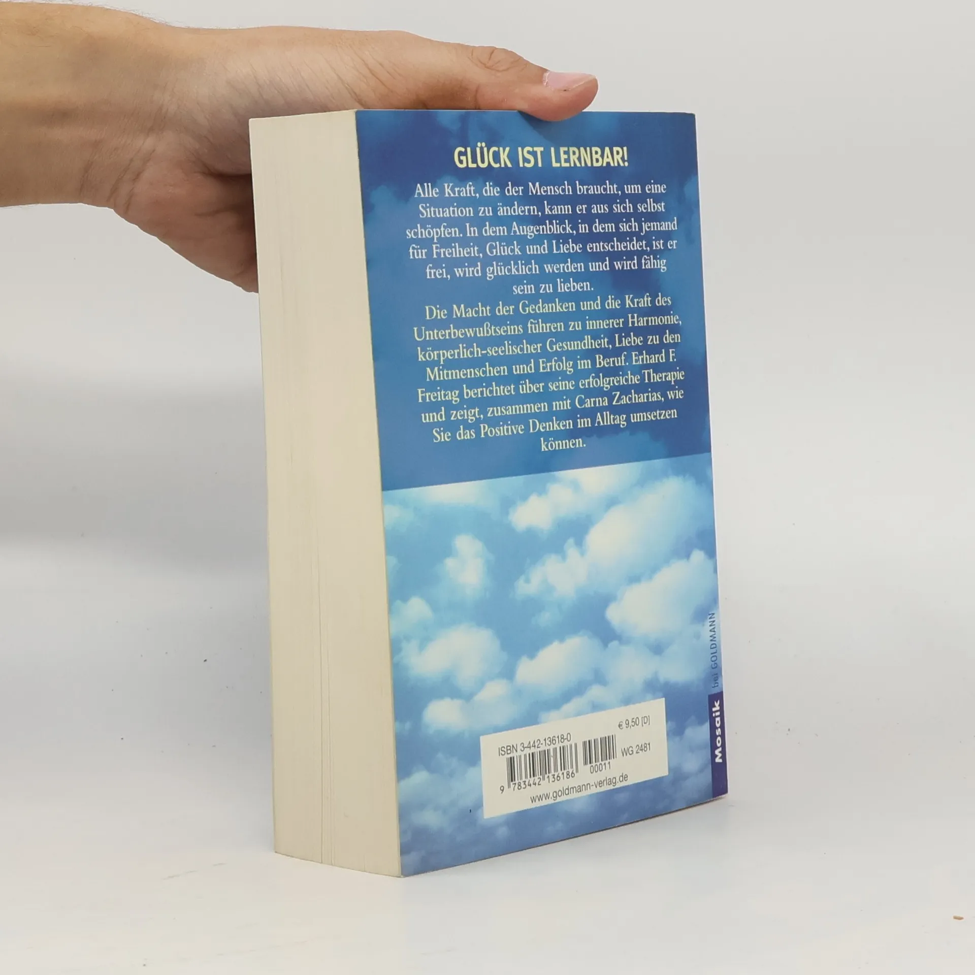 Glück ist lernbar! Alle Kräfte, die der Mensch braucht, um eine Situation zu ändern, kann er aus sich selbst schöpfen. In dem Augenblick, in dem sich jemand für Freiheit, Glück und Liebe entscheidet, ist er frei, wird glücklich werden und wird fähig sein zu lieben. Die Macht der Gedanken und die Kraft des Unterbewusstseins führren zu innerer Harmonie, körperlich-seelischer Gesundheit, Liebe zu den Mitmenschen und Erfolg im Beruf. Erhard F. Freitag berichtet über seine erfolgreiche Therapie und zeigt, zusammen mit Carna Zacharias, wie Sie das Positive Denken im Alltag umsetzen.