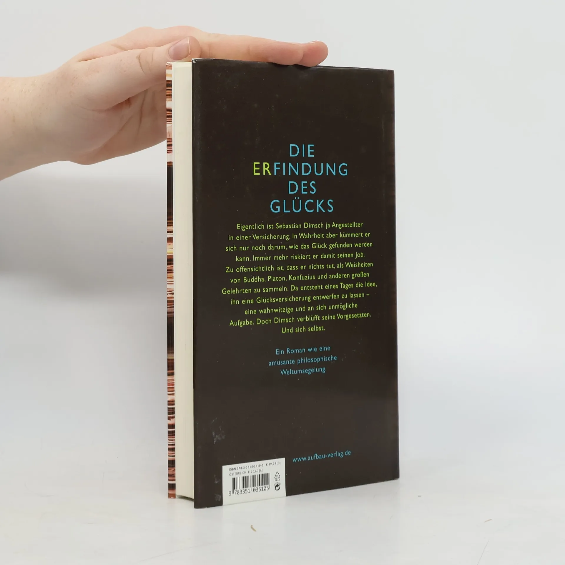 Die Erfindung des Glücks - Eigentlich ist Sebastian Dimsch ja Angestellter in einer Versicherung. In Wahrheit aber kümmert er sich nur noch darum, wie das Glück gefunden werden kann. Immer mehr riskiert er damit seinen Job. Zu offensichtlich ist, dass er nichts tut, als Weisheiten von Buddha, Platon, Konfuzius und anderen großen Gelehrten zu sammeln. Da entsteht eines Tages die Idee, ihn eine Glücksversicherung entwerfen zu lassen - eine freilich wahnwitzige und an sich unmögliche Aufgabe. Doch Dimsch verblüfft seine Vorgesetzten. Und sich selbst. Ein Roman wie eine amüsante philosophische Weltumsegelung.