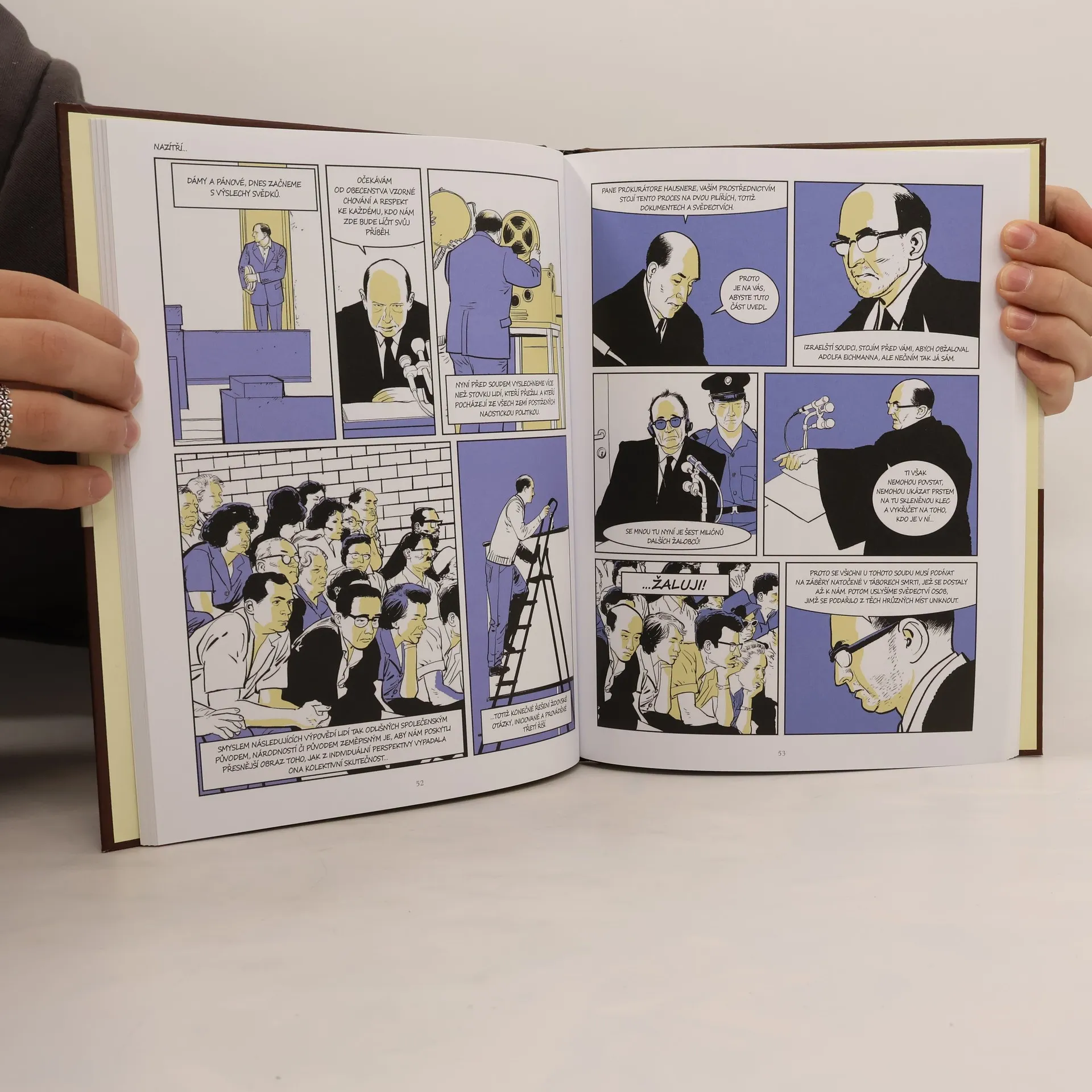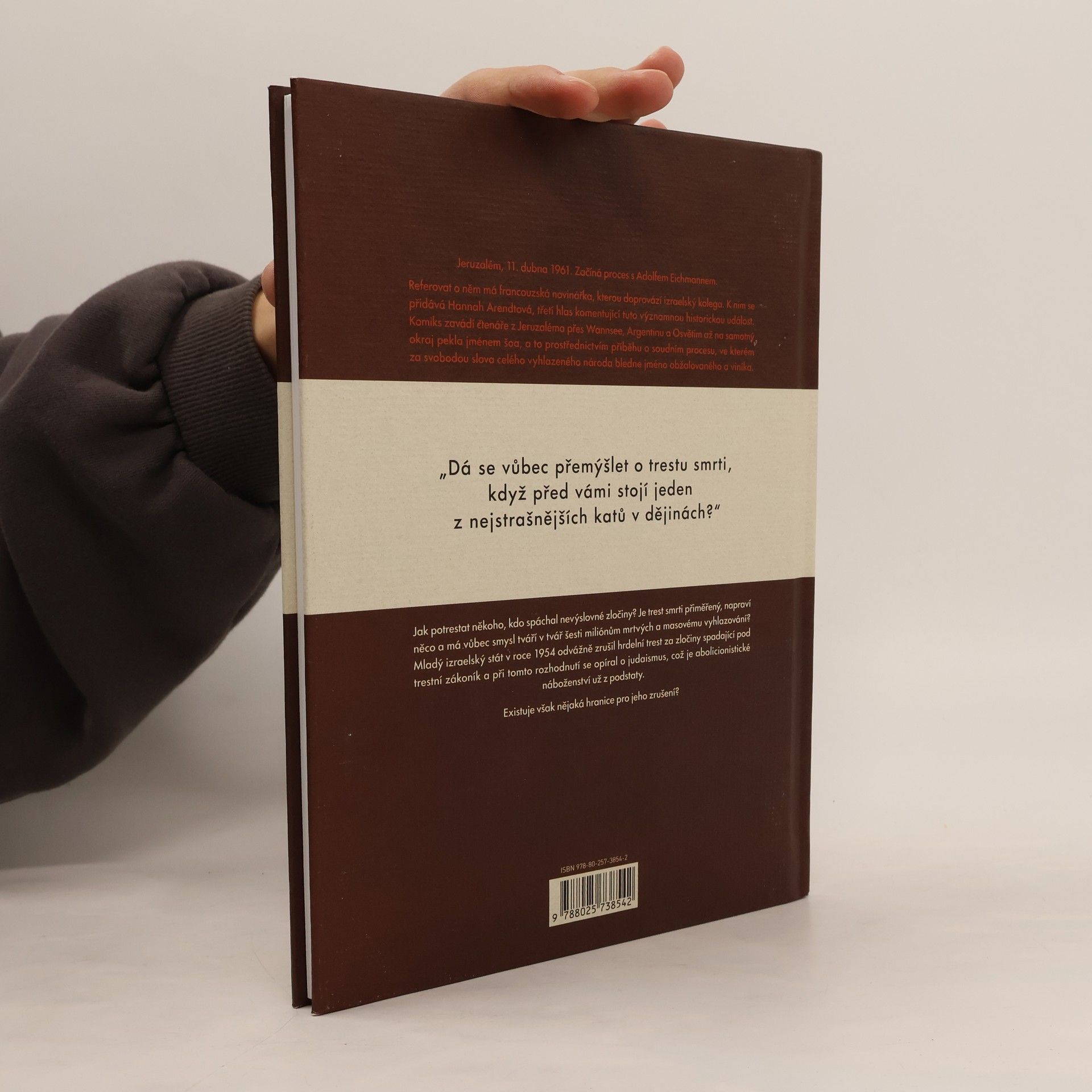 Jeruzalém, 11. dubna 1961. Začíná proces s Adolfem Eichmannem, o kterém referuje francouzská novinářka s izraelským kolegou. Připojuje se k nim Hannah Arendtová, která komentuje tuto historickou událost. Komiks čtenáře zavádí na okraj pekla šoa, z Jeruzaléma do Wannsee, Argentiny a Osvětimi. Jak potrestat někoho za nevýslovné zločiny? Je trest smrti přiměřený nebo smysluplný tváří v tvář šesti milionům mrtvých? Mladý izraelský stát v roce 1954 zrušil hrdelní trest, opíraje se o judaismus, což je abolicionistické náboženství. Existuje však výjimka? „Dá se přemýšlet o trestu smrti, když před vámi stojí jeden z nejstrašnějších katů dějin?“ Marie Bardiaux-Vaiente, scenáristka a historička, je horlivou zastánkyní zrušení trestu smrti a napsala scénář komiksu "Abolice: boj Roberta Badintera". Komiks o Eichmannově procesu vychází z jejího bádání. Výtvarník Malo Kerfriden, vnuk slavného bretonského romanopisce, se od literatury odklonil k komiksu. Po studiích v Rennes se prosadil komiksy jako Quarterback a KGB, přičemž jeho kariéra zahrnuje i fanziny, hudbu a film.