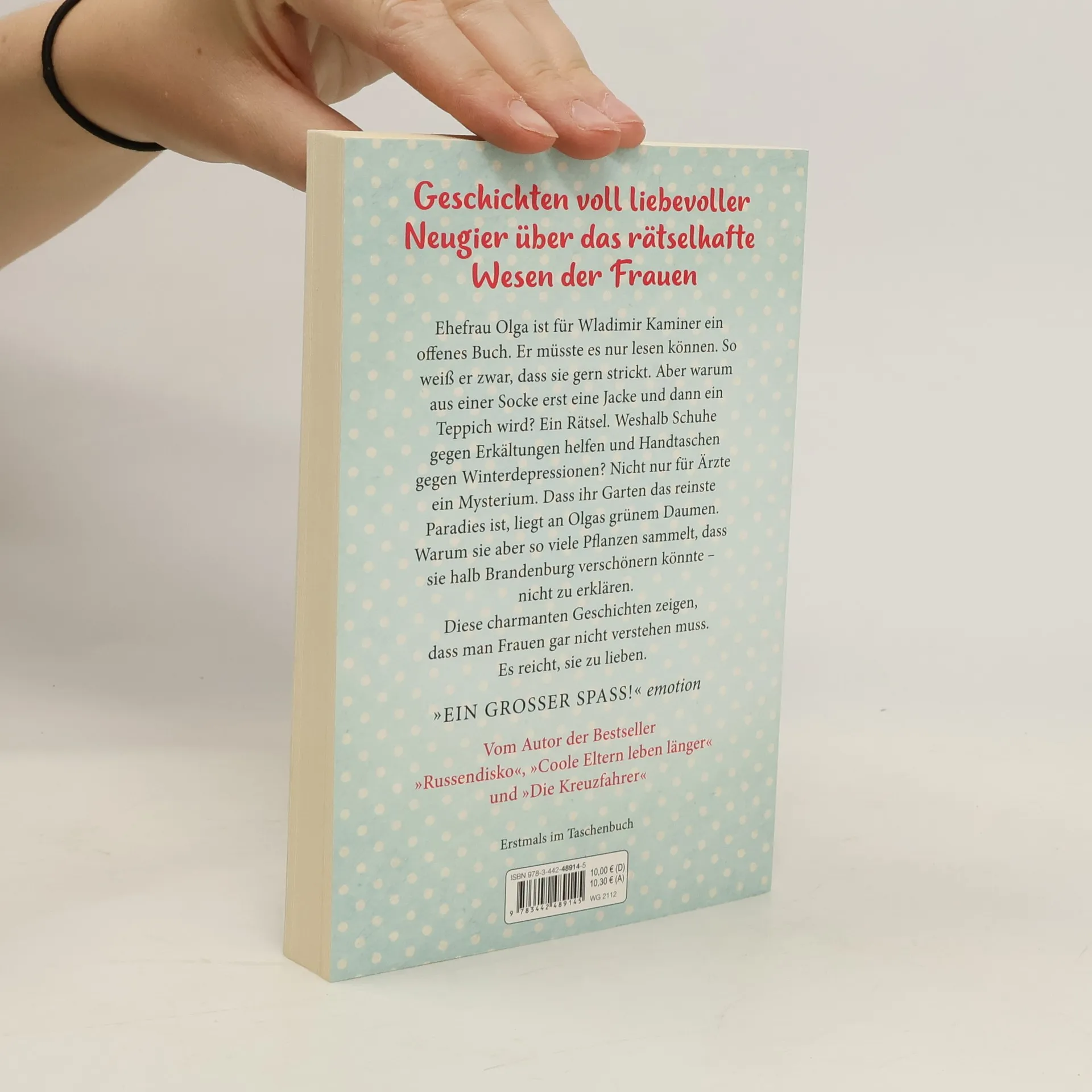 Geschichten voll liebevoller Neugier über das rätselhafte Wesen der Frauen Ehefrau Olga ist für Wladimir Kaminer ein offenes Buch. Er müsste es nur lesen können. So weiß er zwar, dass sie gern strickt. Aber warum aus einer Socke erst eine Jacke und dann ein Teppich wird? Ein Rätsel. Weshalb Schuhe gegen Erkältungen helfen und eine Handtasche gegen Winterdepressionen? Nicht nur für Ärzte ein Mysterium. Dass ihr Garten das reinste Paradies ist, liegt an Olgas grünem Daumen. Warum sie aber so viele Pflanzen sammelt, dass sie halb Brandenburg damit verschönern könnte – nicht zu erklären. Aber das macht nichts, denn Kaminers charmante Geschichten zeigen, dass man Frauen gar nicht verstehen muss. Es reicht völlig, sie zu lieben.