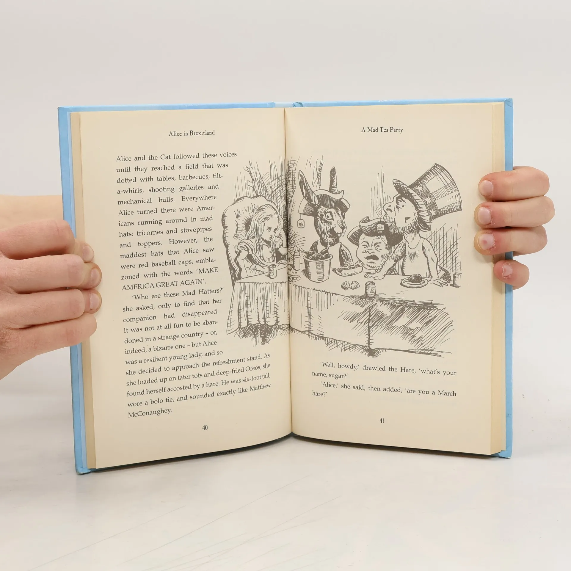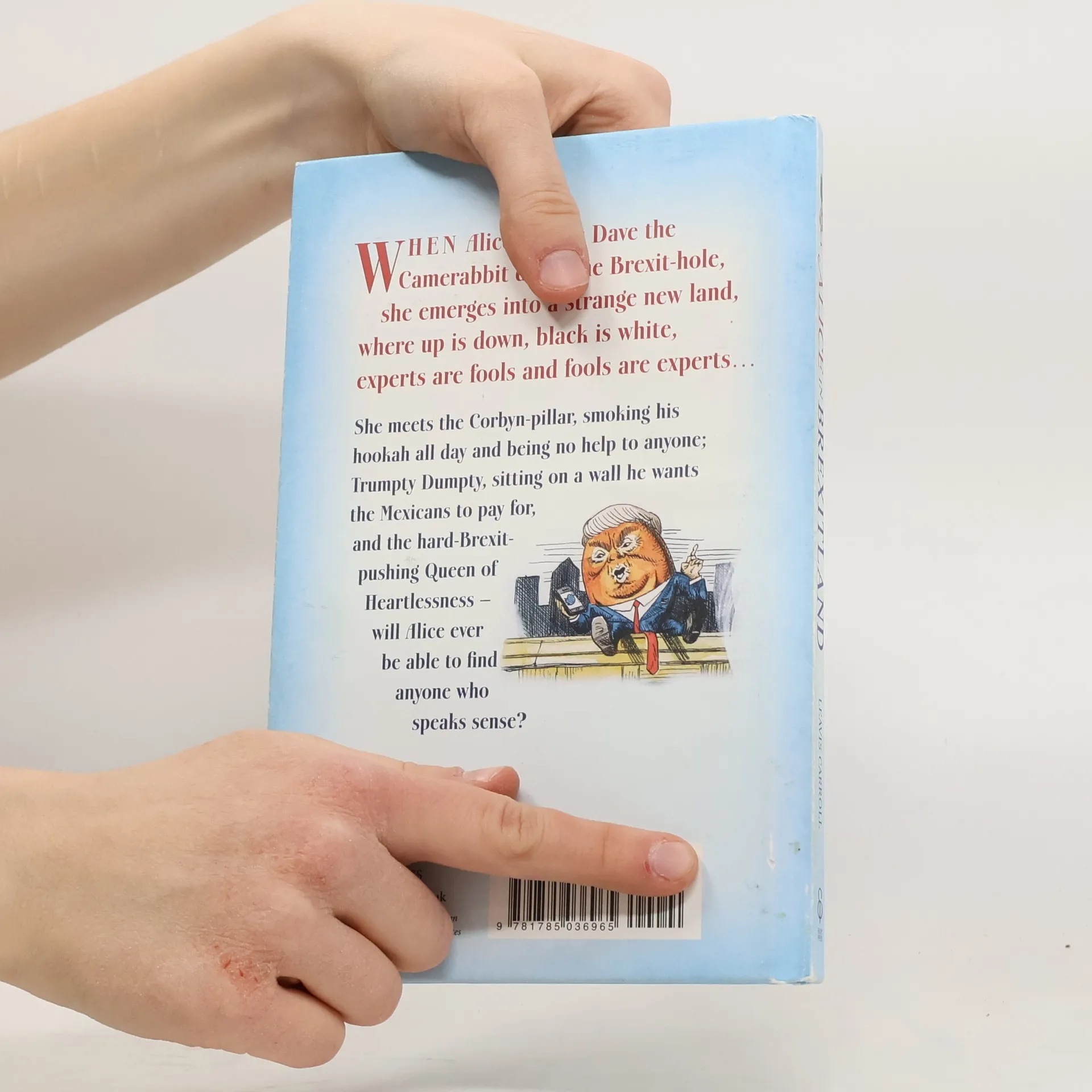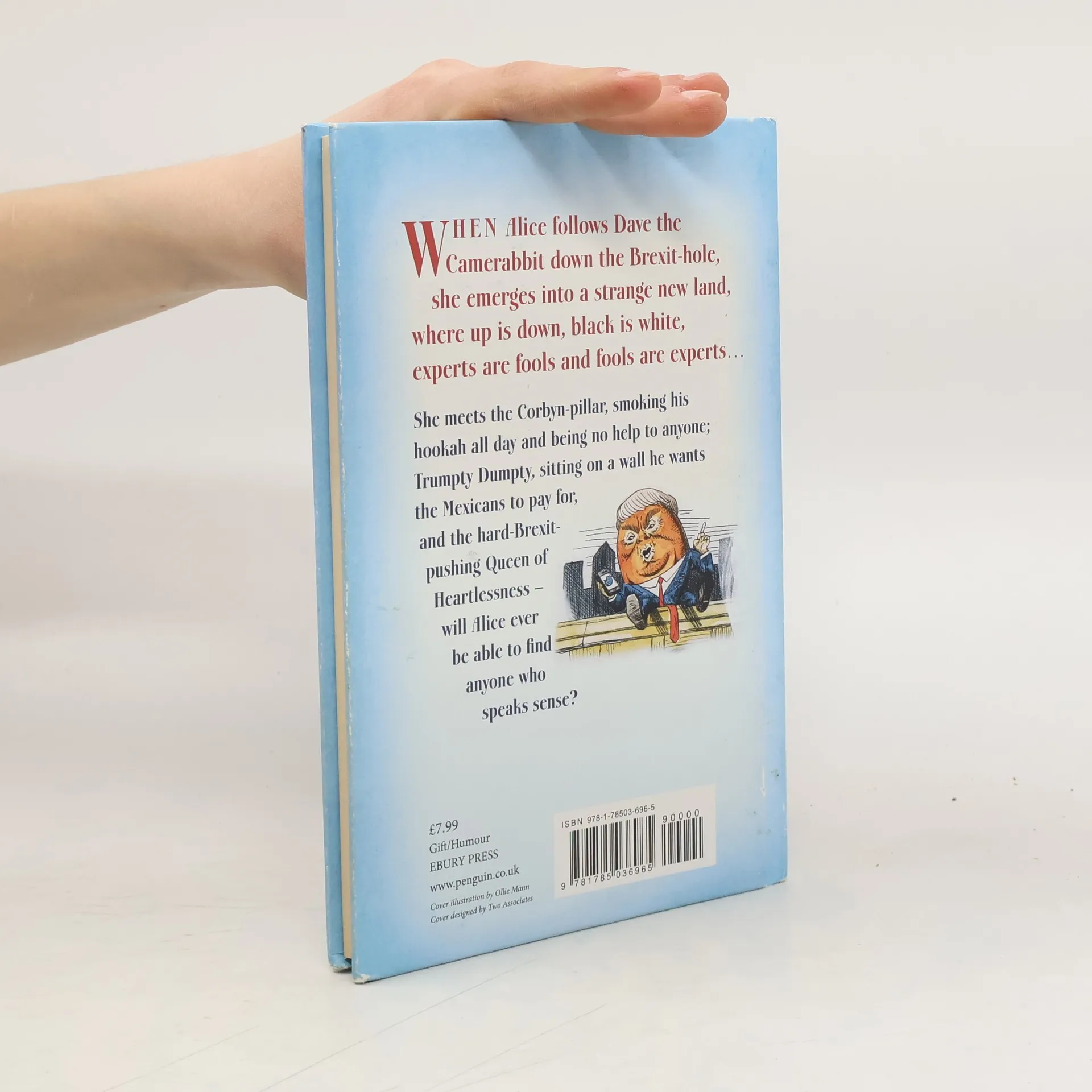 Lying on a riverbank on a lazy summer’s afternoon – 23rd June 2016, to be precise – Alice spots a flustered-looking white rabbit called Dave calling for a referendum. Following him down a rabbit-hole, she emerges into a strange new land, where up is down, black is white, experts are fools and fools are experts... She meets such characters as the Corbynpillar, who sits on a toadstool smoking his hookah and being no help to anyone; Humpty Trumpty, perched on a wall he wants the Mexicans to pay for; the Cheshire Twat, who likes to disappear leaving only his grin, a pint, and the smell of scotch eggs remaining; and the terrifying Queen of Heartlessness, who’ll take off your head if you dare question her plan for Brexit. Will Alice ever be able to find anyone who speaks sense?