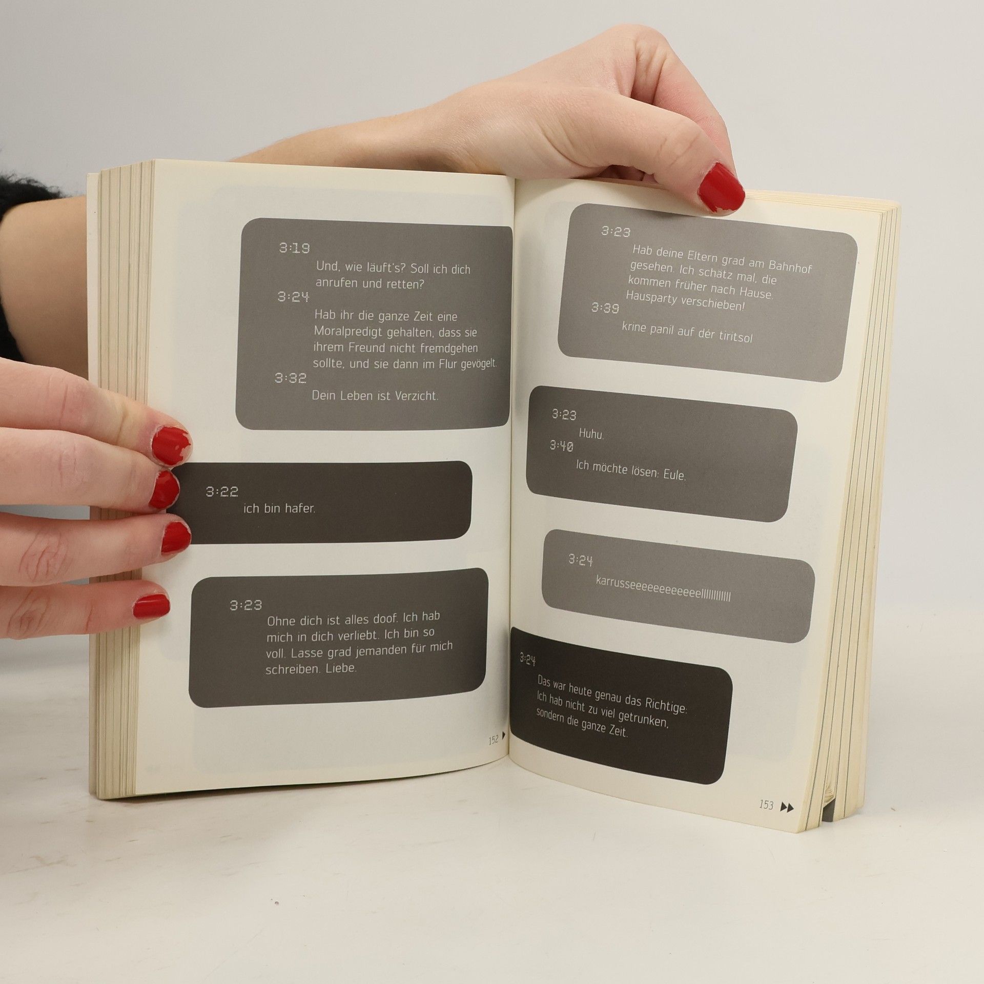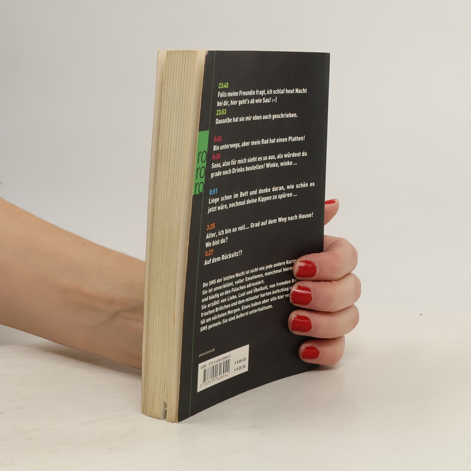 23:40Falls meine Freundin fragt, ich schlaf heut Nacht bei dir, hier gehts ab wie Sau! :-)23:53Dasselbe hat sie mir eben auch geschrieben.0:24Bin unterwegs, aber mein Rad hat einen Platten!0:26Soso, also für mich sieht es so aus, als würdest du grade noch Drinks bestellen! Winke, winke …0:51Liege schon im Bett und denke daran, wie schön es jetzt wäre, nochmal deine Kippen zu spüren …3:25Alter, ich bin so voll ... Grad auf dem Weg nach Hause! Wo bist du?3:27Auf dem Rücksitz!? Die SMS der letzten Nacht ist nicht wie jede andere Kurznachricht. Sie ist unverblümt, voller Emotionen, manchmal hieroglyphisch – und häufig an den Falschen adressiert.Sie erzählt von Liebe, Lust und Übelkeit, von fremden Betten und frischen Brötchen und dem mitunter harten Aufschlag in der Realität am nächsten Morgen. Eines haben aber alle hier versammelten SMS gemein: Sie sind äußerst unterhaltsam.
