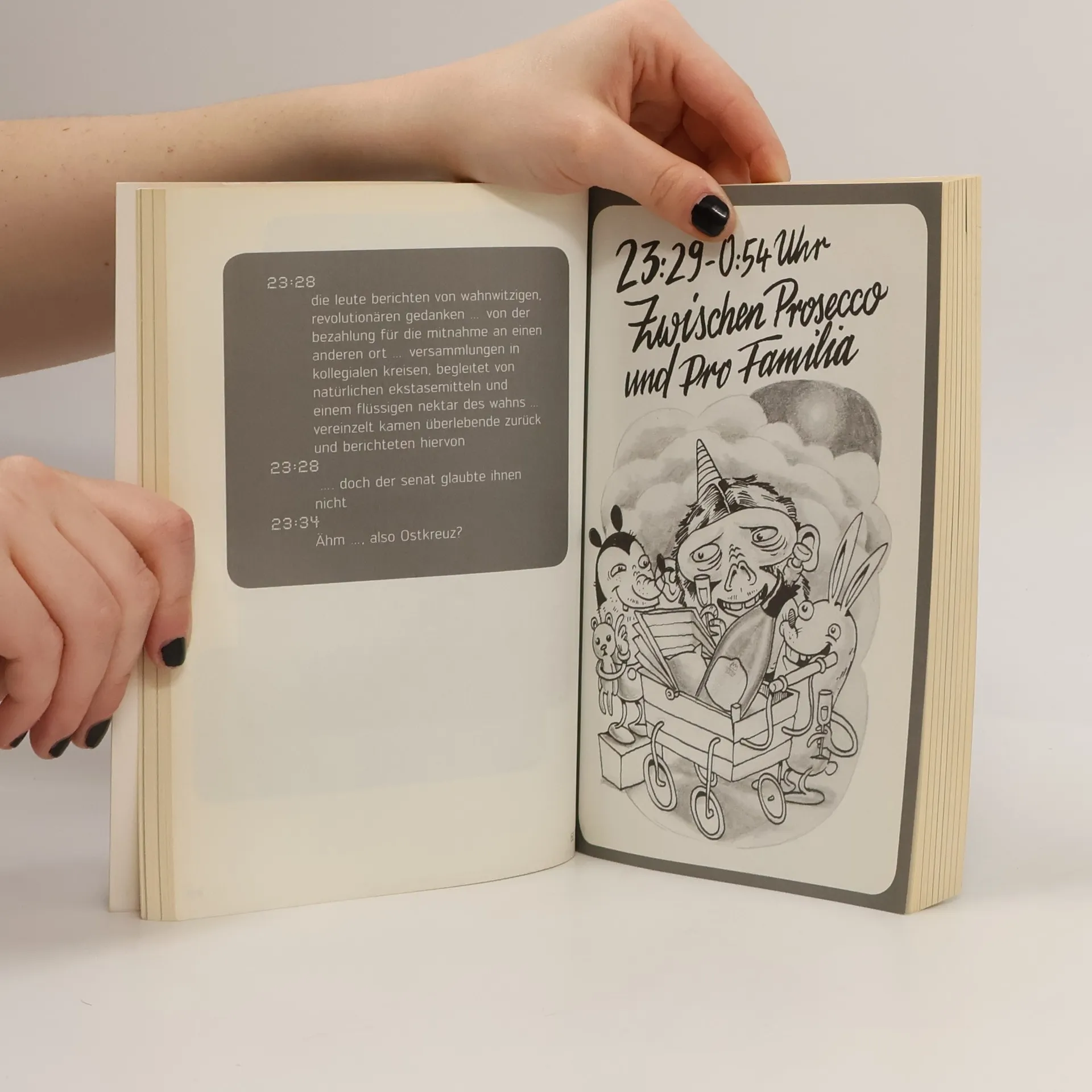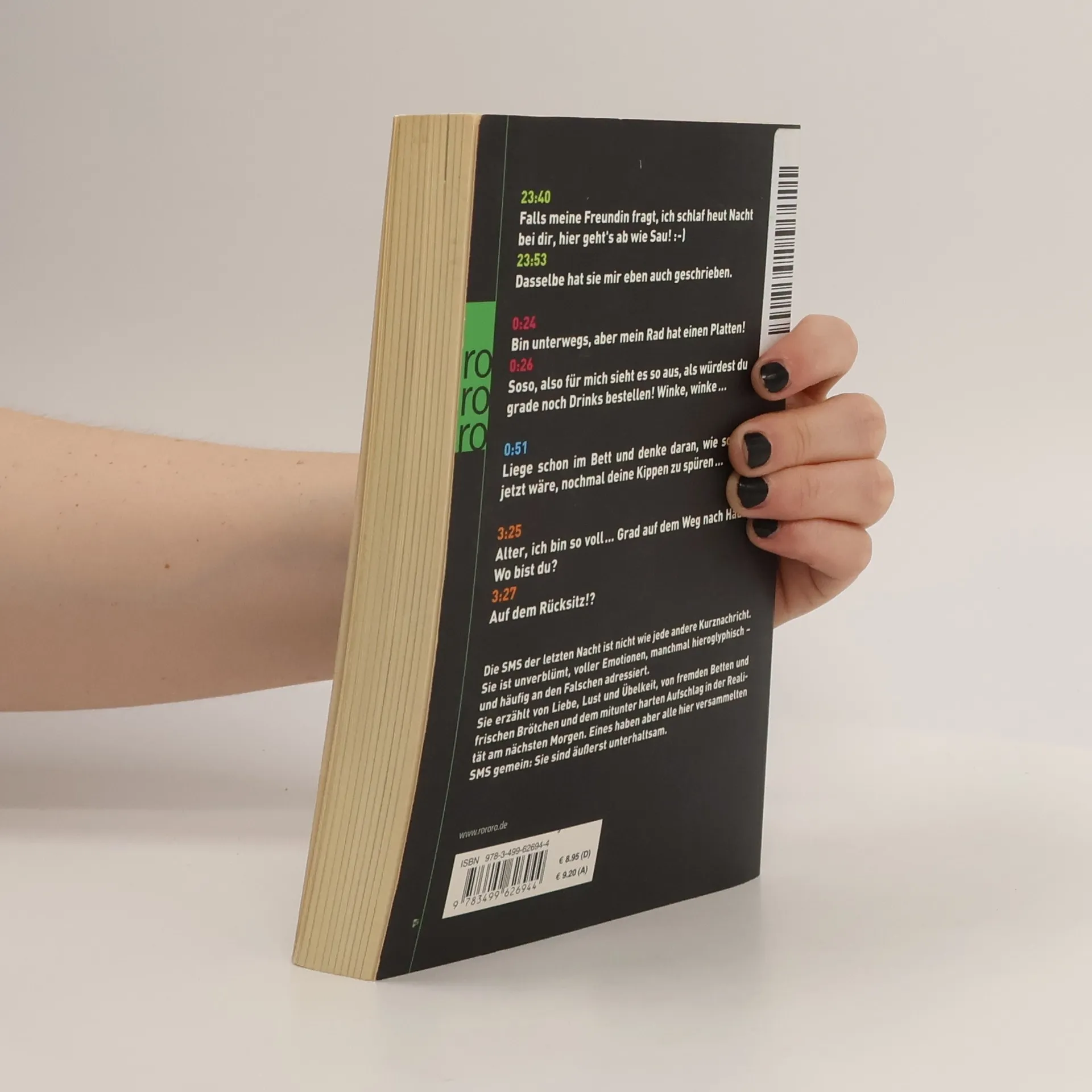 23:40Falls meine Freundin fragt, ich schlaf heut Nacht bei dir, hier gehts ab wie Sau! :-)23:53Dasselbe hat sie mir eben auch geschrieben.0:24Bin unterwegs, aber mein Rad hat einen Platten!0:26Soso, also für mich sieht es so aus, als würdest du grade noch Drinks bestellen! Winke, winke …0:51Liege schon im Bett und denke daran, wie schön es jetzt wäre, nochmal deine Kippen zu spüren …3:25Alter, ich bin so voll ... Grad auf dem Weg nach Hause! Wo bist du?3:27Auf dem Rücksitz!? Die SMS der letzten Nacht ist nicht wie jede andere Kurznachricht. Sie ist unverblümt, voller Emotionen, manchmal hieroglyphisch – und häufig an den Falschen adressiert.Sie erzählt von Liebe, Lust und Übelkeit, von fremden Betten und frischen Brötchen und dem mitunter harten Aufschlag in der Realität am nächsten Morgen. Eines haben aber alle hier versammelten SMS gemein: Sie sind äußerst unterhaltsam.