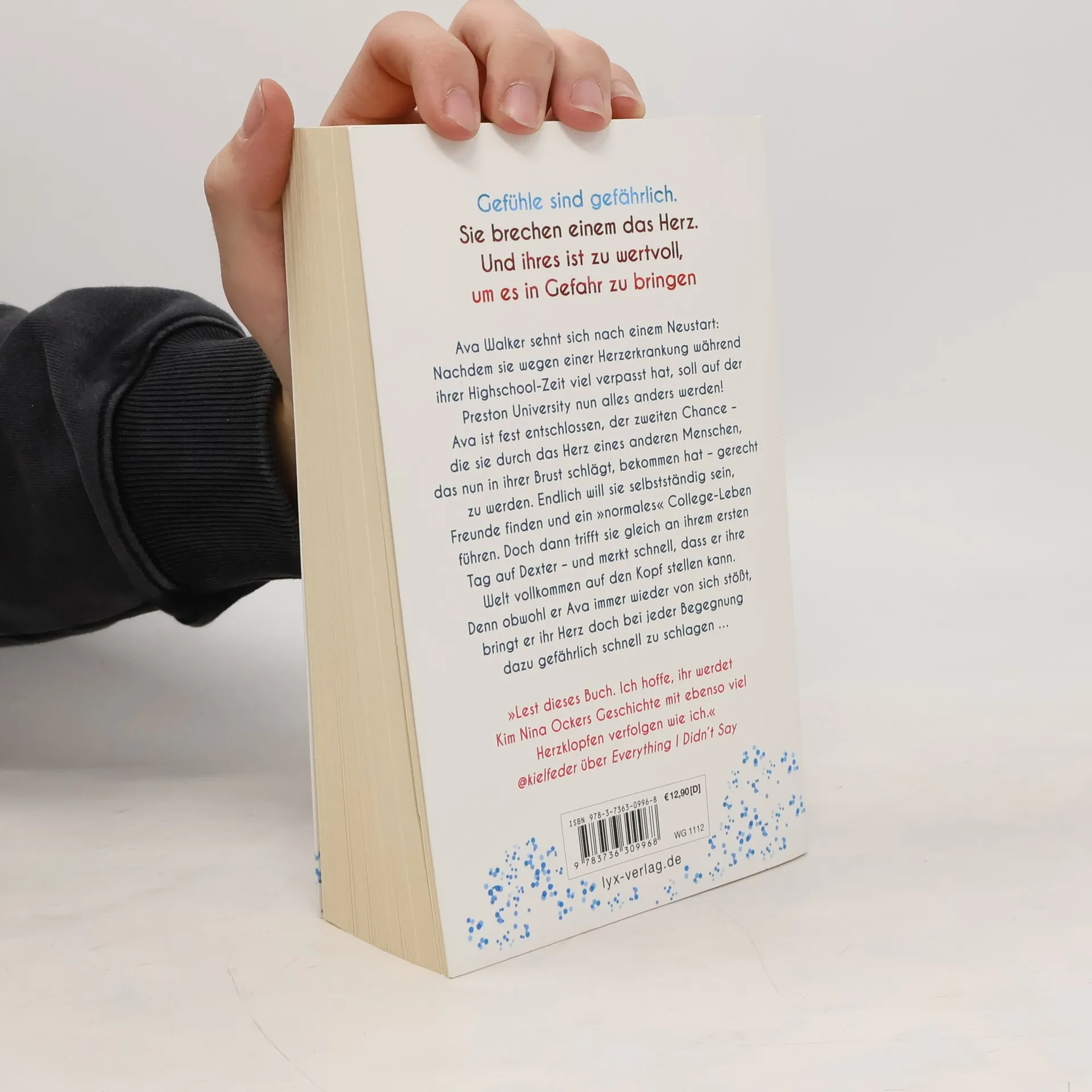 Gefühle sind gefährlich. Sie brechen einem das Herz. Und ihres ist zu wertvoll, um es in Gefahr zu bringen Ava Walker sehnt sich nach einem Neustart: Nachdem sie wegen einer Herzerkrankung während ihrer Highschool-Zeit viel verpasst hat, soll auf der Preston University nun alles anders werden! Ava ist fest entschlossen, der zweiten Chance - die sie durch das Herz eines anderen Menschen, das nun in ihrer Brust schlägt, bekommen hat - gerecht zu werden. Endlich will sie selbstständig sein, Freunde finden und ein »normales« College-Leben führen. Doch dann trifft sie gleich an ihrem ersten Tag auf Dexter - und merkt schnell, dass er ihre Welt vollkommen auf den Kopf stellen kann. Denn obwohl er Ava immer wieder von sich stößt, bringt er ihr Herz doch bei jeder Begegnung dazu gefährlich schnell zu schlagen ... „Lest dieses Buch. Ich hoffe, ihr werdet Kim Nina Ockers Geschichte mit ebenso viel Herzklopfen verfolgen wie ich.“ @KIELFEDER über EVERYTHING I DIDN'T SAY