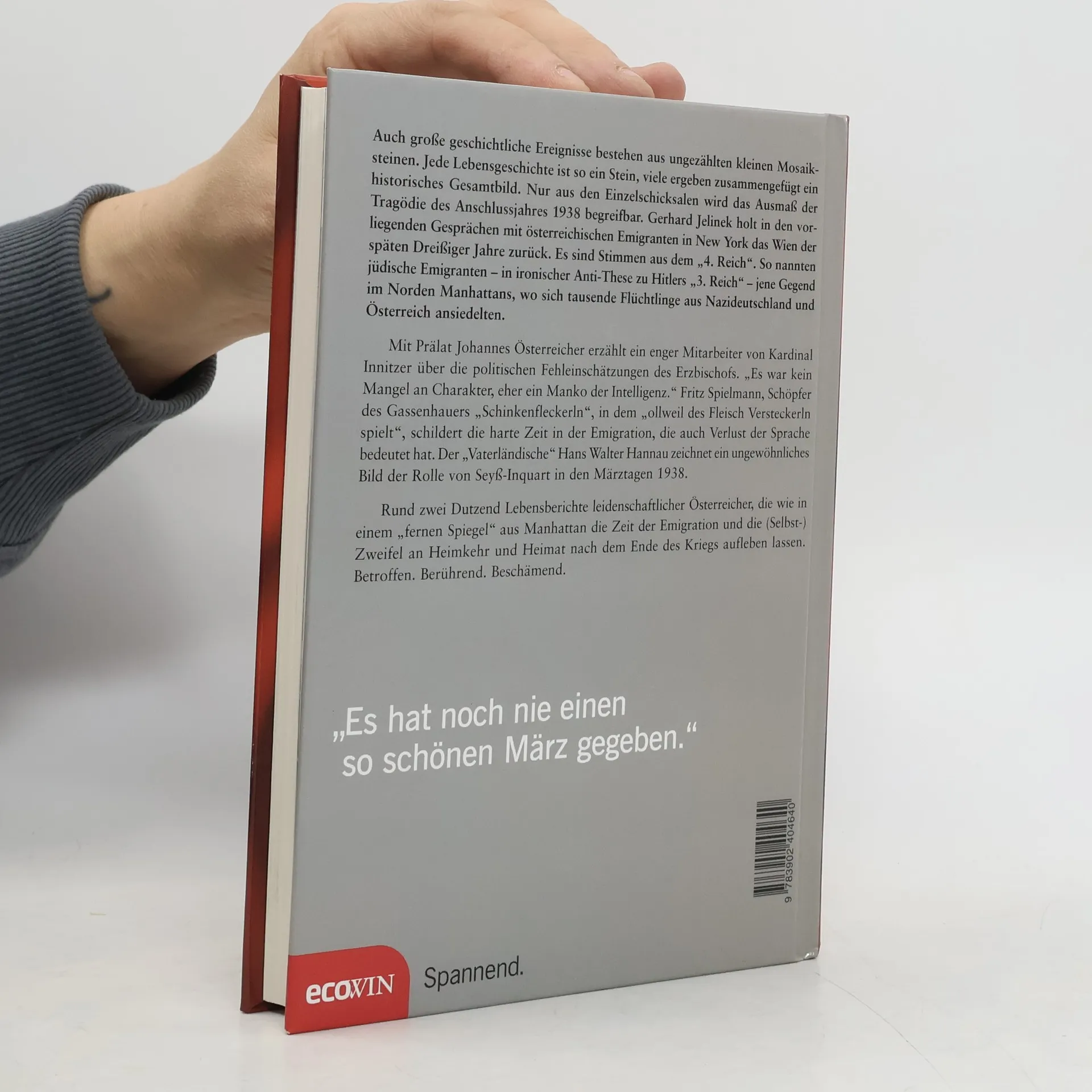 Auch große geschichtliche Ereignisse bestehen aus ungezählten kleinen Mosaiksteinen. Jede Lebensgeschichte ist so ein Stein, viele ergeben zusammengefügt ein historisches Gesamtbild. Nur aus den Einzelschicksalen wird das Ausmaß der Tragödie des Anschlussjahres 1938 begreifbar. Gerhard Jelinek holt in den vorliegenden Gesprächen mit österreichischen Emigranten in New York das Wien der späten Dreißiger Jahre zurück. Mit Prälat Johannes Oesterreicher erzählt ein enger Mitarbeiter von Kardinal Innitzer über die politischen Fehleinschätzungen des Erzbischofs. „Es war kein Mangel an Charakter, eher ein Manko der Intelligenz.“ Fritz Spielmann, Schöpfer des Gassenhauers „Schinkenfleckerln“, in dem „ollweil des Fleisch Versteckerln spielt“, schildert die harte Zeit in der Emigration, die auch Verlust der Sprache bedeutet hat. Der „Vaterländische“ Hans Walter Hannau zeichnet ein ungewöhnliches Bild der Rolle von Seyß-Inquart in den Märztagen 1938. Zwei Dutzend Lebensberichte leidenschaftlicher Österreicher, die wie in einem „fernen Spiegel“ aus Manhattan die Zeit der Emigration und die (Selbst-)Zweifel an Heimkehr und Heimat nach dem Ende des Kriegs aufleben lassen. Betroffen. Berührend. Beschämend.