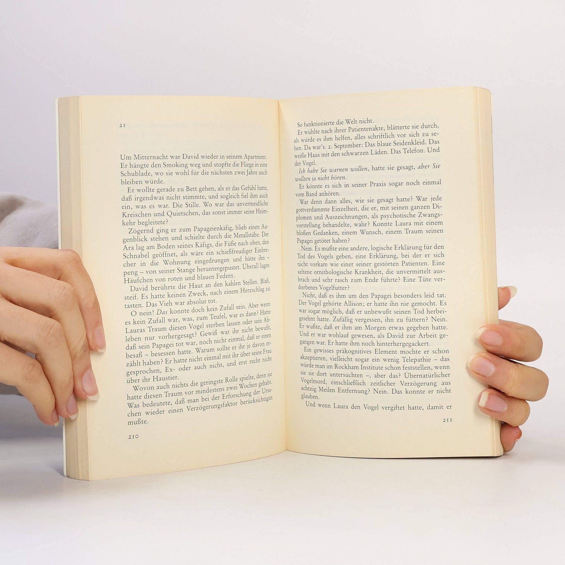 "Das Messer stach nicht. Es schlitzte. Noch einmal. Noch einmal. Kleine, behutsame Bewegungen. Sie wollte zurücktreten, aber sie war wie angewurzelt, die Hand auf der Scheibe, die Augen auf den Mann gerichtet." Die Zeugin glaubt, einen Mann gesehen zu haben. Warum gesteht dann ausgerechent die schöne Laura den Mord? Sie kennt die Zahl der Messerstiche, mit der die Frau umgebracht wurde, und sie hat - vielleicht - ein Motiv. Aber sonst gibt es keine Hinweise, daß Laura tatsächlich die Täterin war. Ein Fall von Schizophrenie? David, der Lauras ungewöhnliche geistige Fähigkeiten untersucht, verliebt sich rettungslos in seine rätselhafte Patientin...
