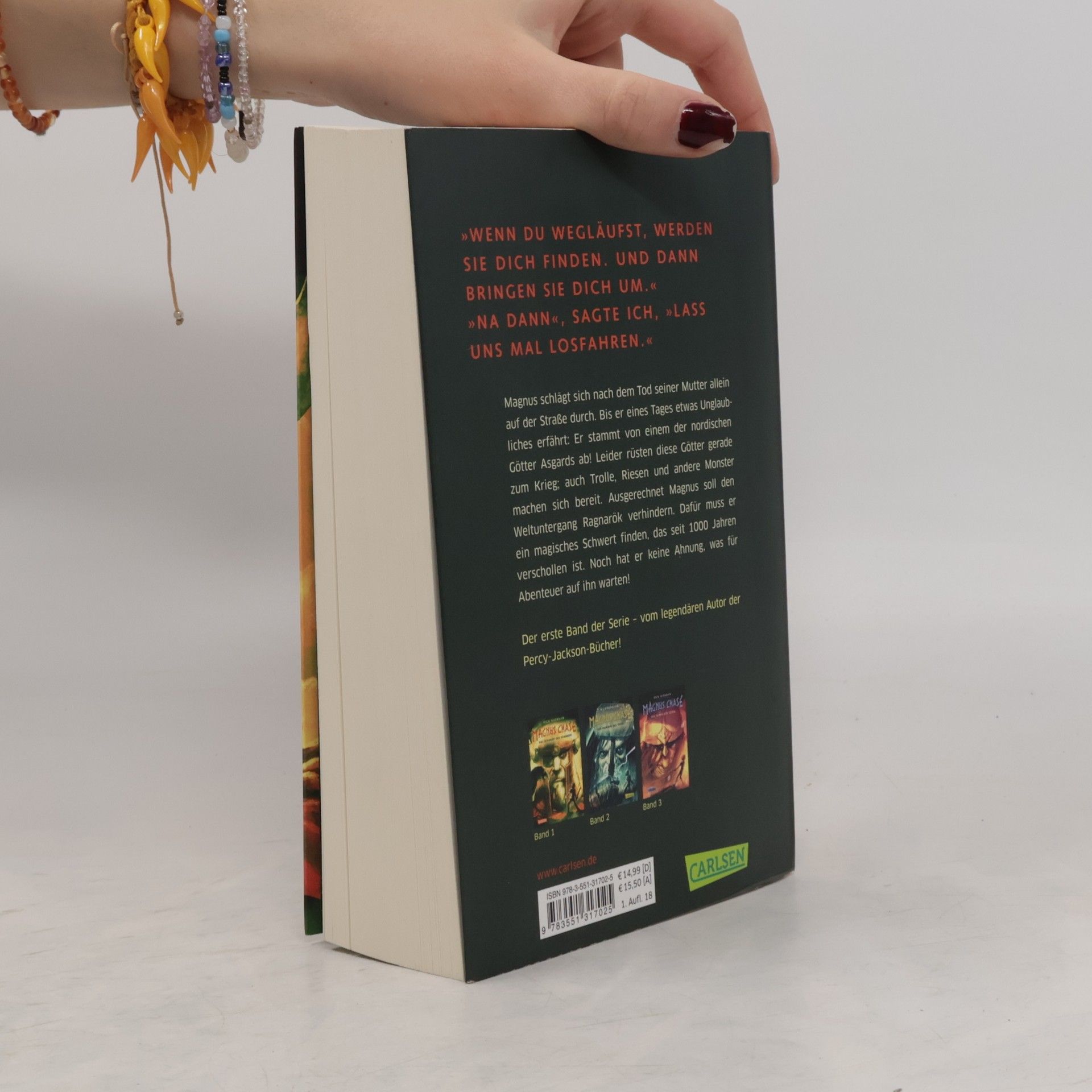 Nordische Mythen, Heldenmut und grandioser Humor Magnus schlägt sich nach dem Tod seiner Mutter allein auf der Straße durch, denn seinen Vater hat er nie gekannt. Als ihn eines Tages sein Onkel aufspürt, erfährt er Unglaubliches: Magnus stammt von einem der nordischen Götter Asgards ab! Leider rüsten diese Götter gerade zum Krieg, auch Trolle, Riesen und andere Monster machen sich bereit. Ausgerechnet Magnus soll den Weltuntergang Ragnarök verhindern. Dafür muss er ein magisches Schwert finden, das seit 1000 Jahren verschollen ist. Kein Problem! Magnus muss ja nur zahlreiche Abenteuer bestehen, Kämpfe gegen gefährliche Kreaturen führen, mit Göttern und Riesen verhandeln, seine göttlichen Fähigkeiten trainieren – und lernen, Freundschaften zu schließen. Aus dem Universum von „Percy Jackson“ und „Die Kane-Chroniken“: Magnus Chase Der 16-jährige Magnus Chase lebt seit dem mysteriösen Tod seiner Mutter auf der Straße. Mit Diebstählen hält er sich über Wasser – bis er eines Tages von seinem besonderen Erbe erfährt: Magnus ist der Sohn des nordischen Gottes Frey und soll die Welt vor dem Untergang retten. In der Fantasy-Trilogie überführt Rick Riordan alte Sagen und Legenden in moderne Geschichten und schafft es, Leser*innen überall auf der Welt für die nordische Mythologie zu begeistern. ***Feuerriesen, Walküren und nordische Götter - packende Fantasy für Leser*innen ab 12 Jahren und für alle Fans der nordischen Mythologie***