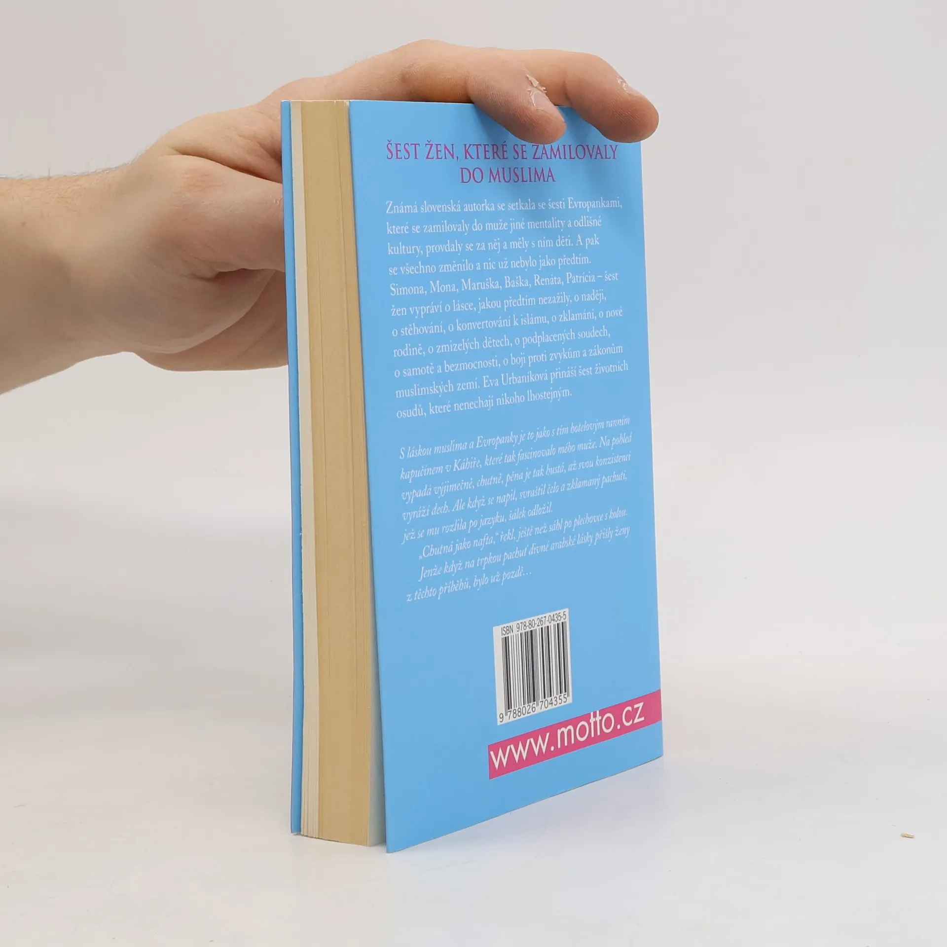 Skutečné příběhy žen, které milovaly muslima Eva Urbaníková ve své nové knize přináší šest životních osudů, které nenechají nikoho lhostejným. Simona, Mona, Maruška, Baška, Renáta, Patrícia – šest žen vypráví o lásce, jakou předtím nezažily, o naději, o stěhování, o konvertování k islámu, o zklamání, o nové rodině, o zmizelých dětech, o podplacených soudech, o samotě a bezmocnosti, o boji proti zvykům a zákonům muslimských zemí.