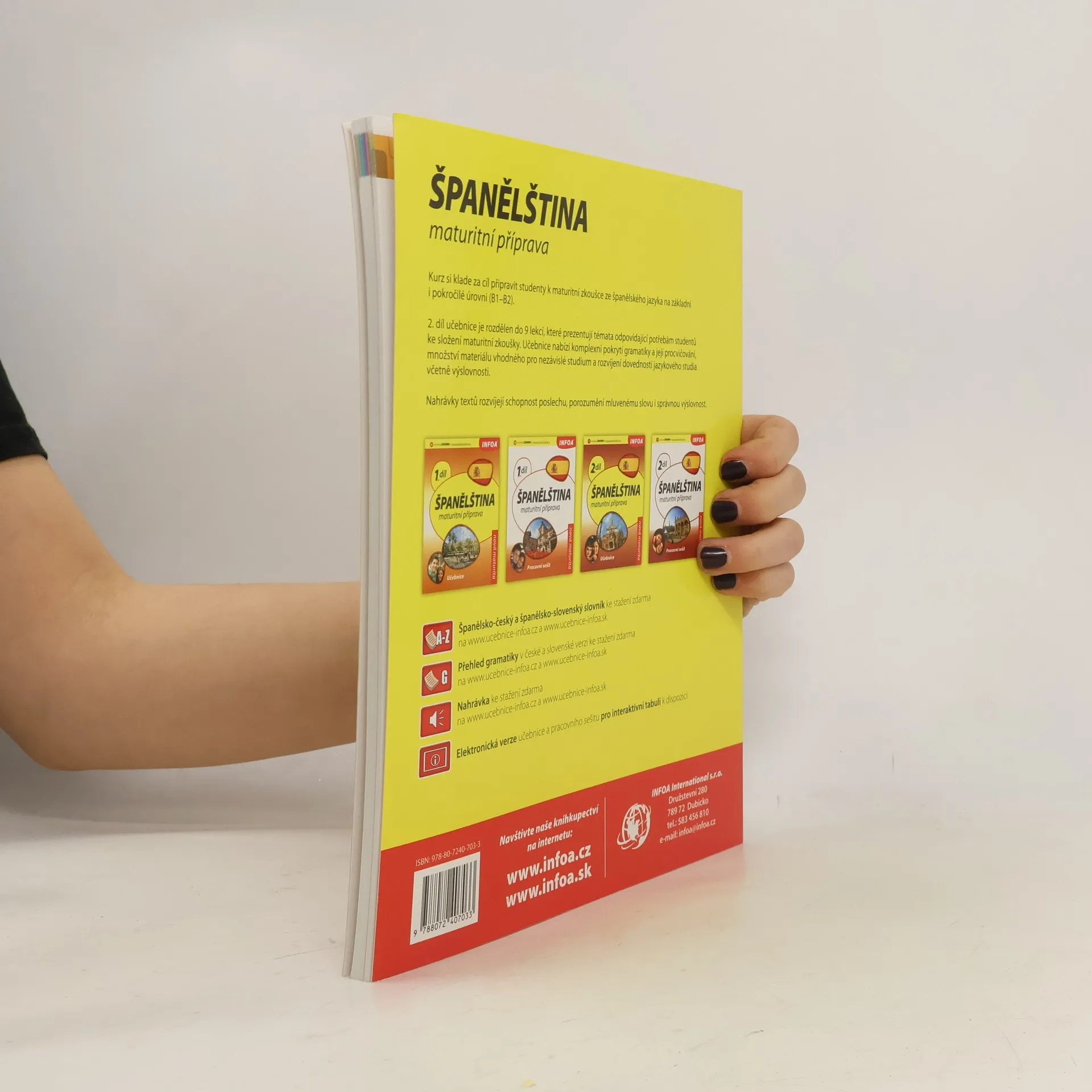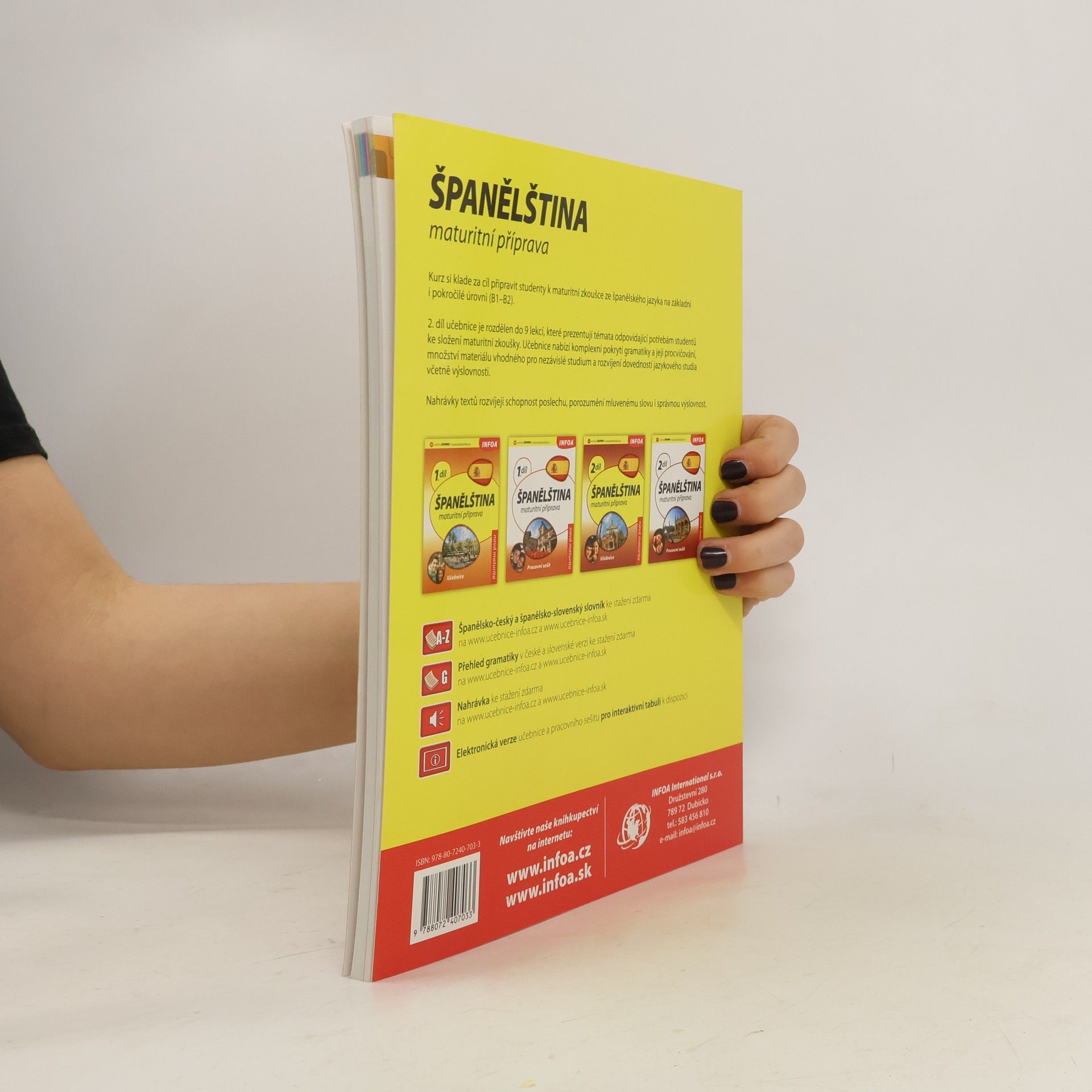 Kurz si klade za cíl připravit studenty k maturitní zkoušce ze španělského jazyka na základní i pokročilé úrovni (B1–B2). 2. díl učebnice je rozdělen do 9 lekcí, které prezentují témata odpovídající potřebám studentů ke složení maturitní zkoušky. Učebnice nabízí komplexní pokrytí gramatiky a její procvičování, množství materiálu vhodného pro nezávislé studium a rozvíjení dovedností jazykového studia včetně výslovnosti. Nahrávky textů rozvíjejí schopnost poslechu, porozumění mluvenému slovu i správnou výslovnost.