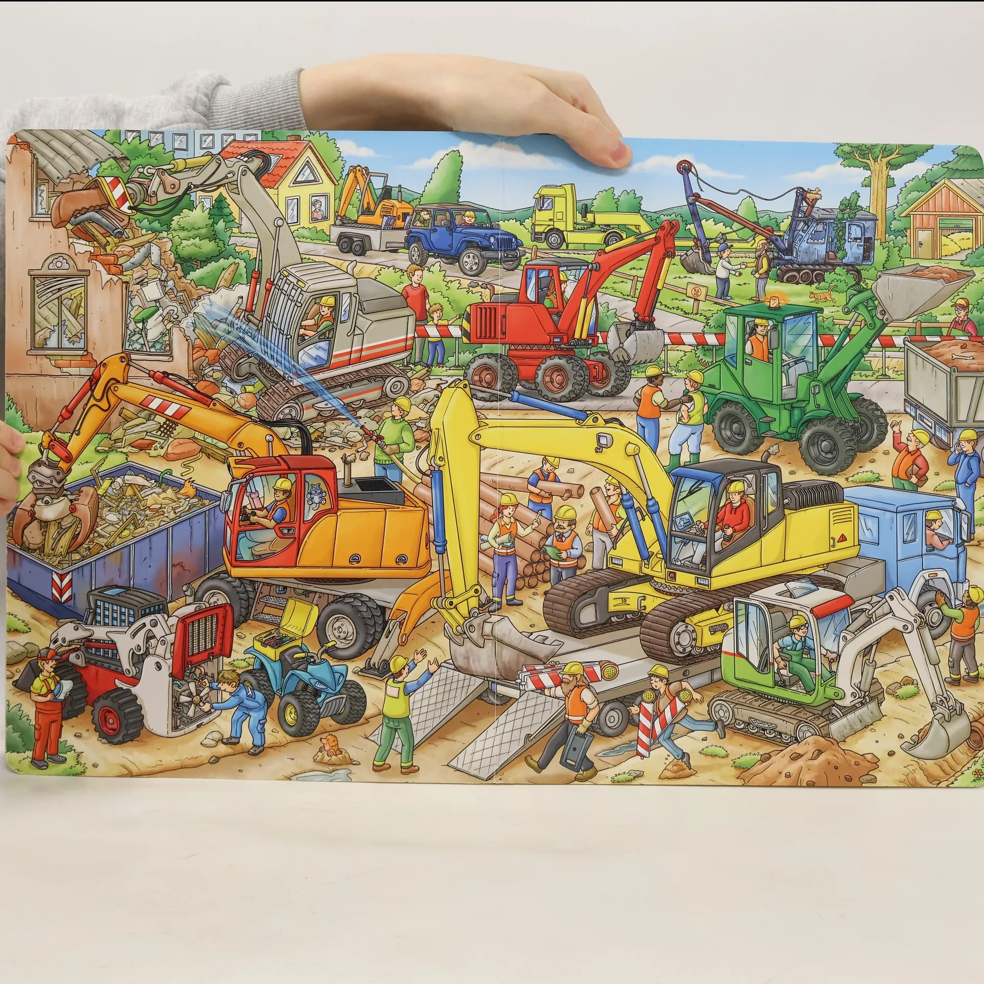 Velkoformátová obrázková kniha představuje dění, postavy a stroje na staveništi. Knížka je určena k prohlížení a volnému vyprávění. Rozvíjí slovní zásobu a schopnost soustředění a na každé dvoustraně vybízí k hledání jednotlivých postav, které pracují na stavbě a se stavebními stroji.