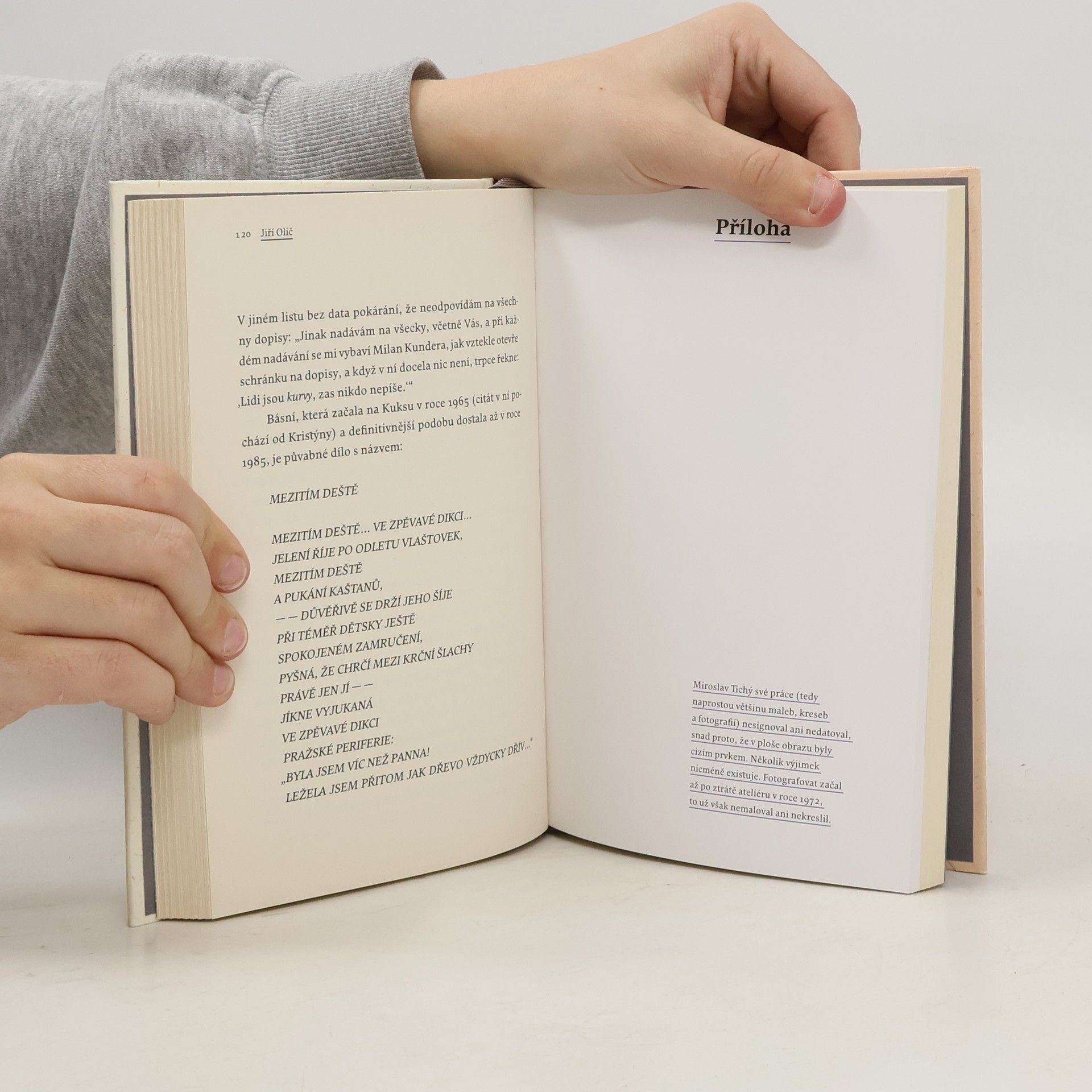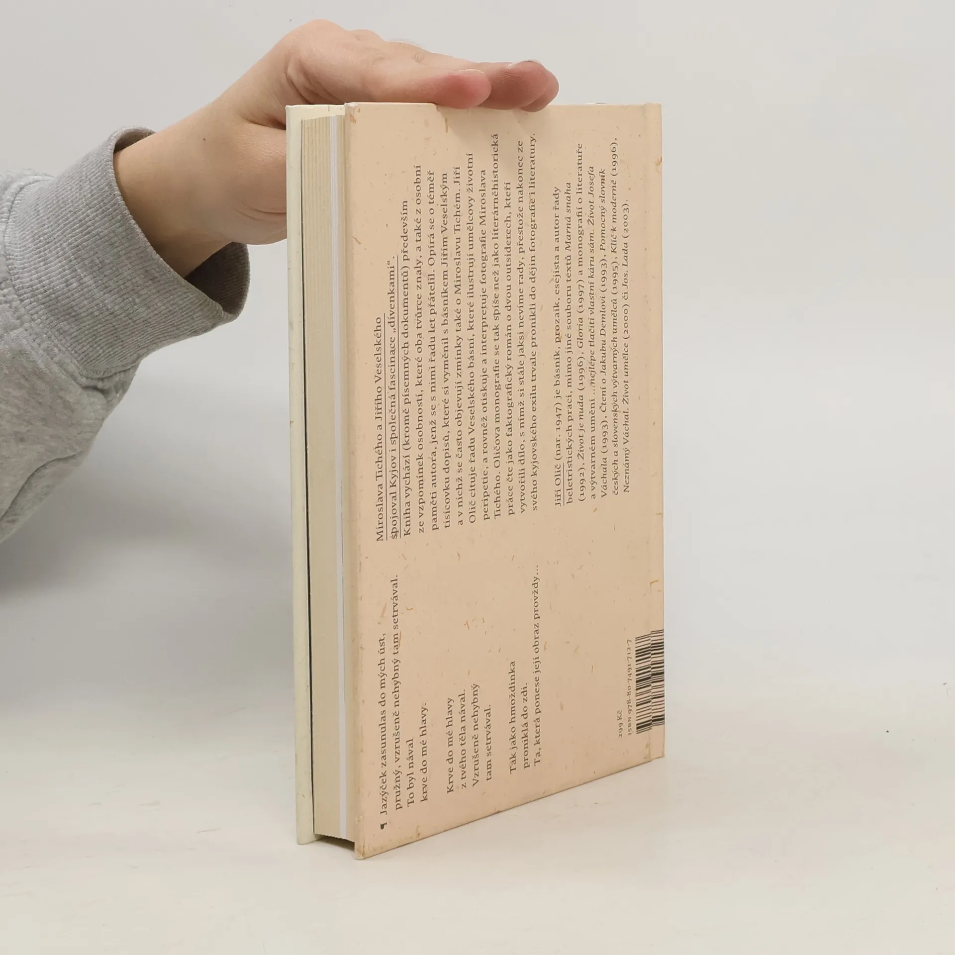 Pozoruhodná monografie mapující životní osudy dvou přátel a prokletých umělců. Malíře a fotografa Miroslava Tichého a básníka Jiřího Veselského spojoval Kyjov i společné téma dívčího těla. Kniha vychází kromě písemných dokumentů především ze vzpomínek osobností, které oba tvůrce znaly, a také z vlastní paměti autora, jenž se s nimi řadu let přátelil. Opírá se o téměř tisícovku dopisů, které si vyměnil s básníkem Jiřím Veselským a v nichž se často objevují zmínky také o Miroslavu Tichém. Olič cituje řadu Veselského básní, které ilustrují umělcovy životní peripetie, a rovněž otiskuje a interpretuje fotografie Miroslava Tichého. Oličova monografie se tak spíše než jako literárněhistorická práce čte jako faktografický román o dvou outsiderech, kteří vytvořili dílo, s nímž si stále nějak nevíme rady.