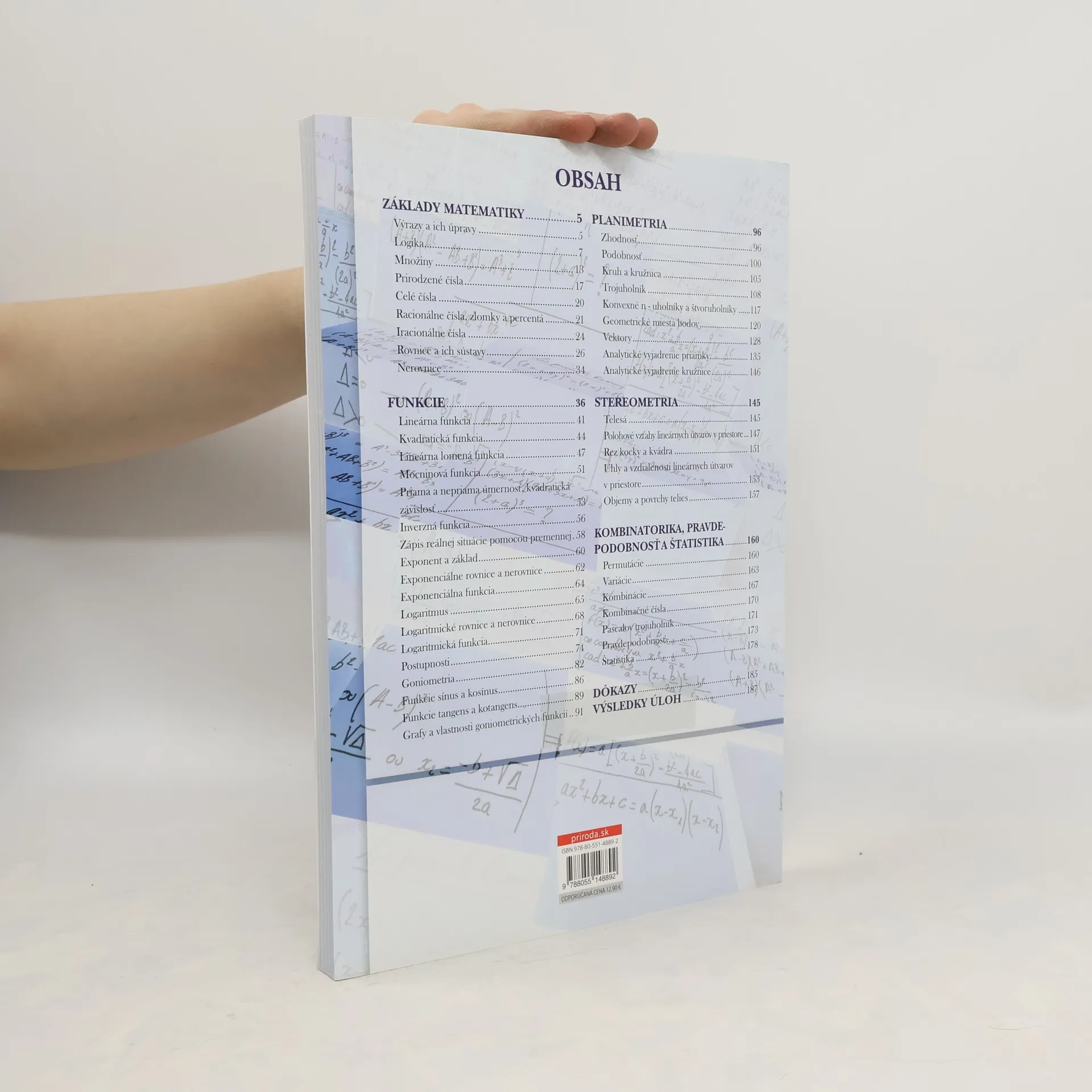 Publikácia poskytne študentom prehľadný a ucelený materiál k maturitnej skúške zo základov matematiky, funkcií, planimetrie, stereometrie , kombinatoriky, pravdepodobnosti, štatistiky a dôkazov. Obsahuje definície, vzorce, vyše 750 riešených a doplňujúcich úloh, grafy, kontrolné testy a v závere správne výsledky úloh. Praktickú súčasť publikácie tvoria kontrolné Testy, dostupné na stiahnutie na www.priroda.sk.