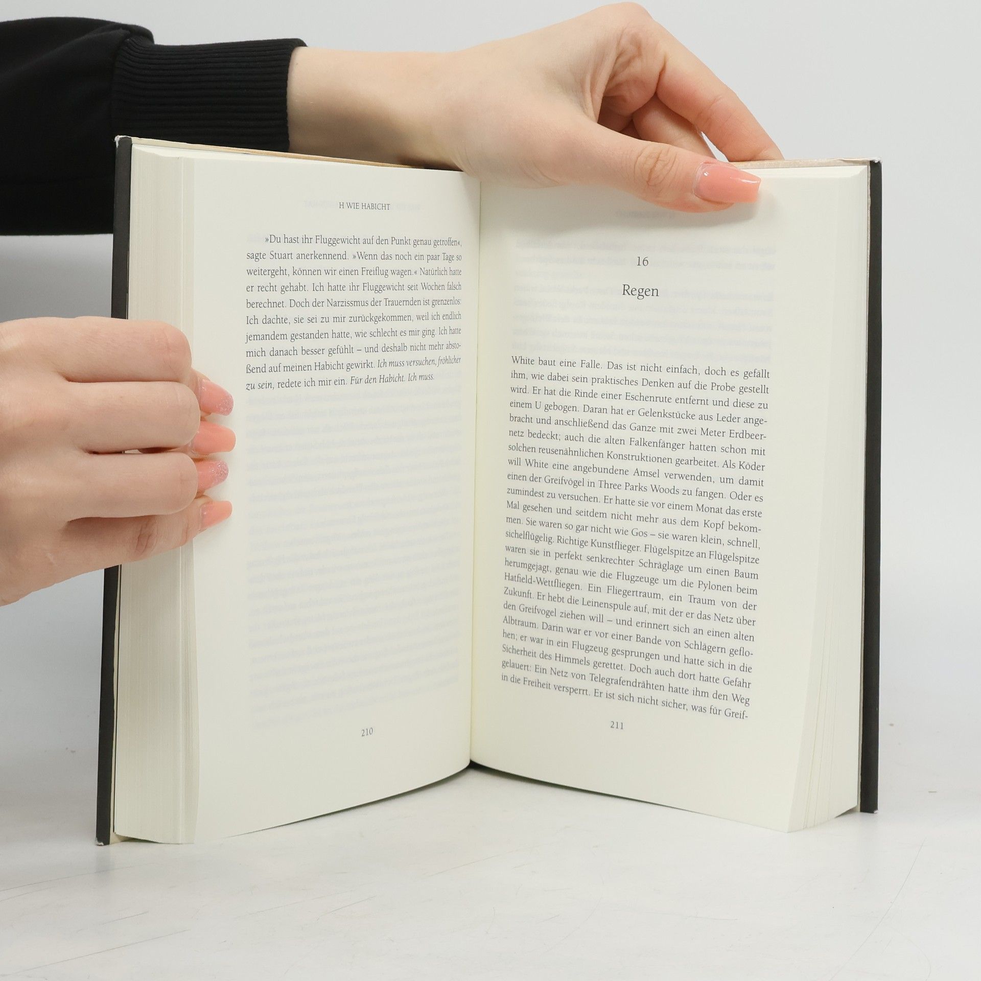 Der Tod ihres Vaters trifft Helen unerwartet und weckt ihren Kindheitstraum, einen Habicht aufzuziehen und zu zähmen. So zieht das stolze Habichtweibchen Mabel bei ihr ein. Die intensive Beschäftigung mit dem Tier schafft eine tröstende und heilende Nähe zwischen den beiden. Doch Mabel ist kein gewöhnliches Tier; sie ist ein Greifvogel, und sie tötet. Um einen Greifvogel abzurichten, muss man ihn genau beobachten, um vorherzusagen, was er als Nächstes tun wird. Helen beschreibt, wie sie die Körpersprache des Vogels zunehmend versteht und schließlich das Gefühl hat, was Mabel empfindet. Während sie sich in den Habicht hineinversetzt, verliert sie einen Teil ihrer Menschlichkeit. Das Werk thematisiert Erinnerung, Natur und Freiheit und zeigt das Glück, sich einer großen Aufgabe mit vollem Herzen zu widmen. Der anschauliche und präzise Stil von Macdonald macht die Geschichte von Mabels Abrichtung zu einem fesselnden Erlebnis, das wie ein Thriller wirkt. Die allmählich wachsende Spannung zieht die Leser in ihren Bann und lässt sie den Atem anhalten. Das Buch wurde mit mehreren Preisen ausgezeichnet, darunter der Costa Award für das beste Buch des Jahres 2014 und der Samuel Johnson Prize.