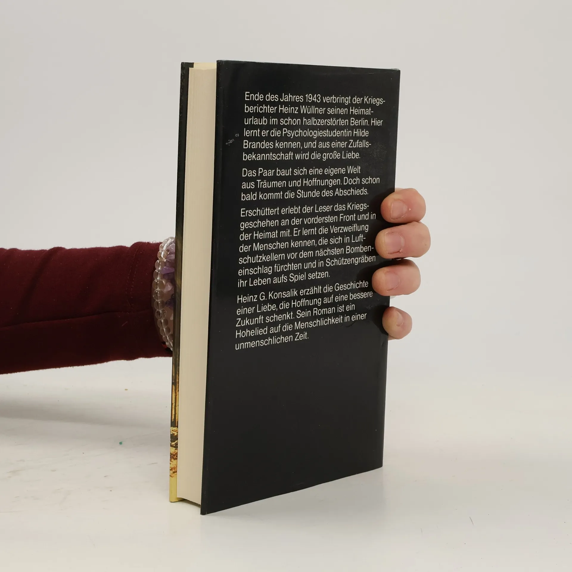 Ende des Jahres 1943 verbringt der Kriegsberichter Heinz Wullner seinen Heimturlaub im schon halbzerstorten Berlin. hier lernt er die Psychologiestudentin Hilde Brandes kennen, und aus einer Zufallsbekanntschaft wird die grosse Liebe. Das Paar baut sich eine eigene Welt aus Traumen und Hoffnungen. Doch schon bald kommt die Stunde des Abschieds. Erschuttert erlebt der vordersten Front und in der Heimat mit. Er lernt die Verzweiflung der Menschen kennen, die sich in Luftschutzkellern vor dem nachsten Bombeneinschlag furchten und in Schulzengraben ihr Leben aufs Spiel setzen. Heinz G. Konsalik erzahlt die Geschichte einer Liebe, die Hoffnung auf eine bessere Zukunft schenkt. Sein Roman ist ein Hohelied auf die Menschlichkeit in einer unmenschlichen Zeit.