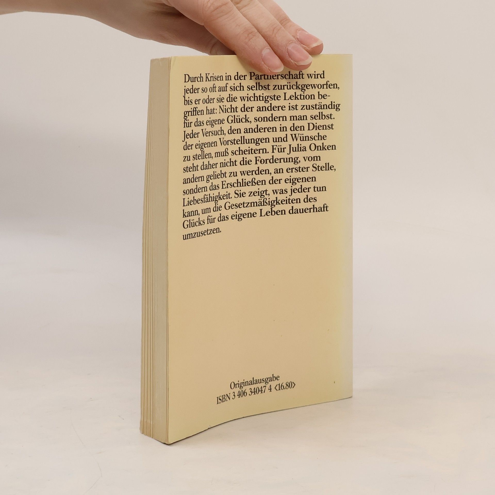 Durch die Krisen in der Partnerschaft wird jeder so oft auf sich selbst zurückgeworfen, bis er oder sie die wichtigste Lektion begriffen hat: Nicht der andere ist zuständig für das eigene Glück, sondern man selbst. Jeder Versuch, den anderen in den Dienst der eigenen Vorstellungen und Wünsche zu stellen, muß scheitern. Für Julia Onken steht daher nicht die Forderung, vom andern geliebt zu werden, an erster Stelle, sondern das Erschließen der eigenen Liebesfähigkeit. Sie zeigt, was jeder tun kann, um die Gesetzmäßigkeiten des Glücks für das eigene Leben dauerhaft umzusetzen.