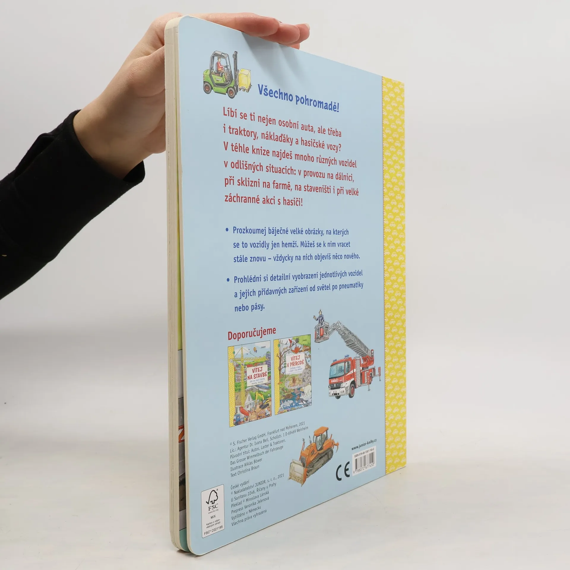Líbí se ti nejen osobní auta, ale třeba i traktory, náklaďáky a hasičské vozy? V téhle knize najdeš mnoho různých vozidel v odlišných situacích: v provozu na dálnici, při sklizni na farmě, na staveništi i při velké záchranné akci s hasiči! Prozkoumej báječné velké obrázky, na kterých se to vozidly jen hemží. Můžeš se k nim vracet stále znovu – vždycky na nich objevíš něco nového. Prohlédni si detailní vyobrazení jednotlivých vozidel a jejich přídavných zařízení od světel po pneumatiky nebo pásy. Kniha je určená dětem od dvou let.
