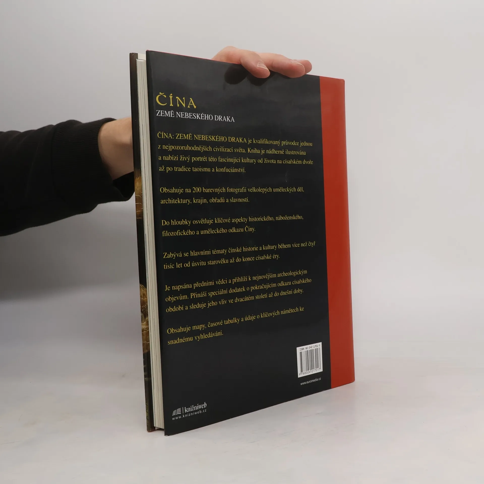 Pro západní oči je Čína jednou z nejtajemnějších a nejúžasnějších civilizací vůbec. Odkaz její dlouhé dynastické vlády, sahající až před rok 1500 př. n. l., zahrnuje fascinující pojetí filozofie, náboženství, umění, vědy a mytologie, které i nadále ovlivňují moderní svět. Publikace Čína: Země nebeského draka se zabývá idejemi této jedinečné kultury, čerpá z nejnovějších archeologických objevů a teorií a představuje dějiny, společnost a náboženství Číny od prehistorických legend až do konce císařské vlády v roce 1912. Zkoumá klíčové kulturní, duchovní a umělecké tradice této obrovské civilizace a líčí hlavní vědecké a technické čínské vynálezy jako střelný prach, tisk a kompas. Vyvrací konvenční názor, že Čína je izolovanou civilizací a zdůrazňuje mezinárodní a kosmopolitní charakter jejích dějin. Závěrečná část se zabývá pokračujícím odkazem císařského období v bouřlivých letech dvacátého století až do dnešních dnů. Množství barevných fotografií a reprodukcí uměleckých děl v kombinaci se čtivým a erudovaným textem zobrazuje zvyky a tradice čínského světa od života v nejodlehlejších vesnicích až po dění na císařském dvoře. 2. vydání.