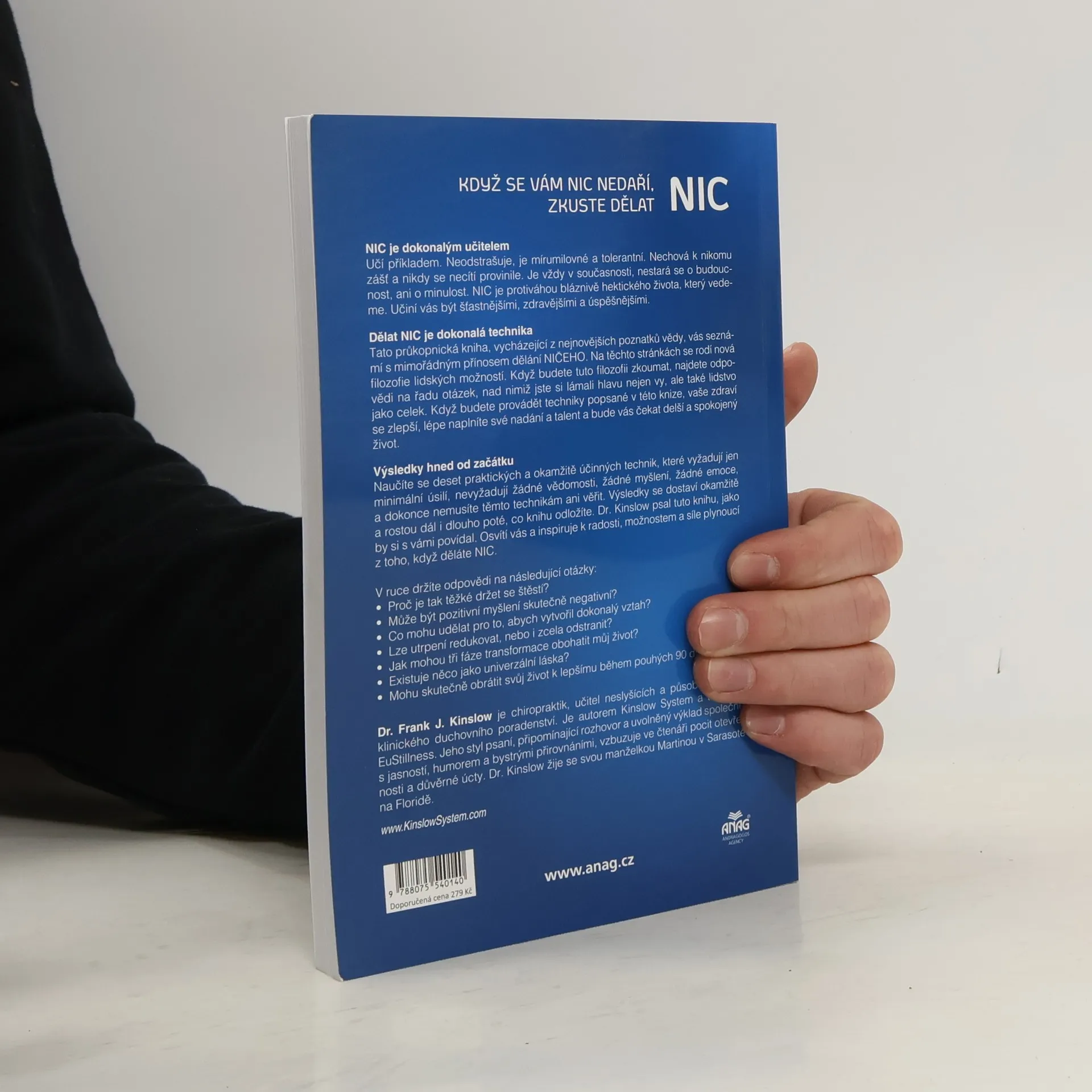 Nic pracuje jako nic! Nic je ideální učitel. Učí příkladem. Je neohrožující, klidné a tolerantní. Nechová zášť a nikdy se necítí provinile. Vždy je přítomné, nikdy se nestará o budoucnost nebo minulost. Nic je protiváhou šíleně hektickým životům, které vedeme. Udělá vás šťastnějšími, zdravějšími a úspěšnějšími. Nicnedělání je perfektní technika Na nejnovějších vědeckých myšlenkách vám tato průkopnická kniha představí mimořádné výhody nicnedělání. Na těchto stránkách se rodí nová filozofie lidského potenciálu. Prozkoumáte-li tuto filozofii, najdete odpovědi na mnoho otázek, které nešly do hlavy nejen vám osobně, ale lidstvu jako celku. Budete-li praktikovat tyto techniky, zažijete zlepšení zdraví, větší naplnění svých talentů a možností a delší, spokojenější život. Nedělejte nic, jen si užívejte výsledky Získejte výsledky ze svojí první zkušenosti. Naučíte se deset praktických a okamžitě účinných technik, které vyžadují minimální úsilí, žádné znalosti, žádné myšlenky, žádné emoce, a dokonce nevyžadují ani víru v samotný proces. Výsledek začíná okamžitě a nadále roste dlouho poté, co tuto knihu odložíte stranou. Tak, jako by jste tam byli s ním, Dr. Kinslow vás osvítí a inspiruje k radosti, k možnostem a síle nic nedělat.
