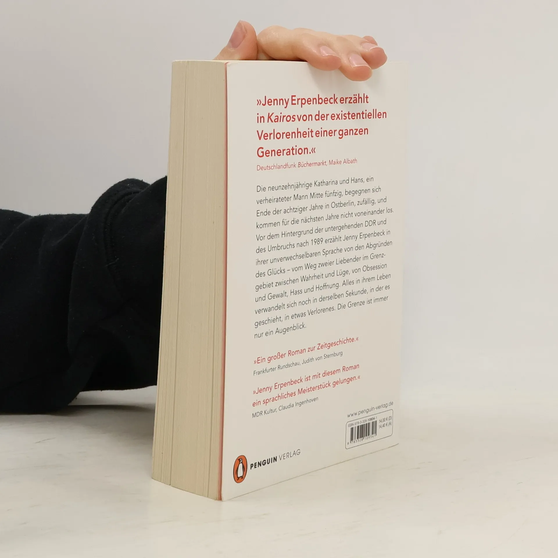 »Eine der größten lebenden Erzählerinnen, die (nicht nur) wir haben.« Andreas Platthaus, FAZ Die neunzehnjährige Katharina und Hans, ein verheirateter Mann Mitte fünfzig, begegnen sich Ende der achtziger Jahre in Ostberlin, zufällig, und kommen für die nächsten Jahre nicht voneinander los. Vor dem Hintergrund der untergehenden DDR und des Umbruchs nach 1989 erzählt Jenny Erpenbeck in ihrer unverwechselbaren Sprache von den Abgründen des Glücks – vom Weg zweier Liebender im Grenzgebiet zwischen Wahrheit und Lüge, von Obsession und Gewalt, Hass und Hoffnung. Alles in ihrem Leben verwandelt sich noch in derselben Sekunde, in der es geschieht, in etwas Verlorenes. Die Grenze ist immer nur ein Augenblick. »Erpenbecks beklemmende Entfaltung einer Amour fou, die mit dem Untergang des Staates synchronisiert wird, entwickelt einen beispiellosen Sog. Es ist ein großer, schöner und grausamer Liebesroman, der zu Recht ausgezeichnet worden ist.« Adam Soboczynski, Die Zeit »Jenny Erpenbeck erzählt in ›Kairos‹ von der existentiellen Verlorenheit einer ganzen Generation.« Maike Albath, Deutschlandfunk ›Büchermarkt‹ »Erpenbeck demonstriert in ›Kairos‹ ihre sprachlichen und literarischen Qualitäten.« Gerrit Bartels, Tagesspiegel