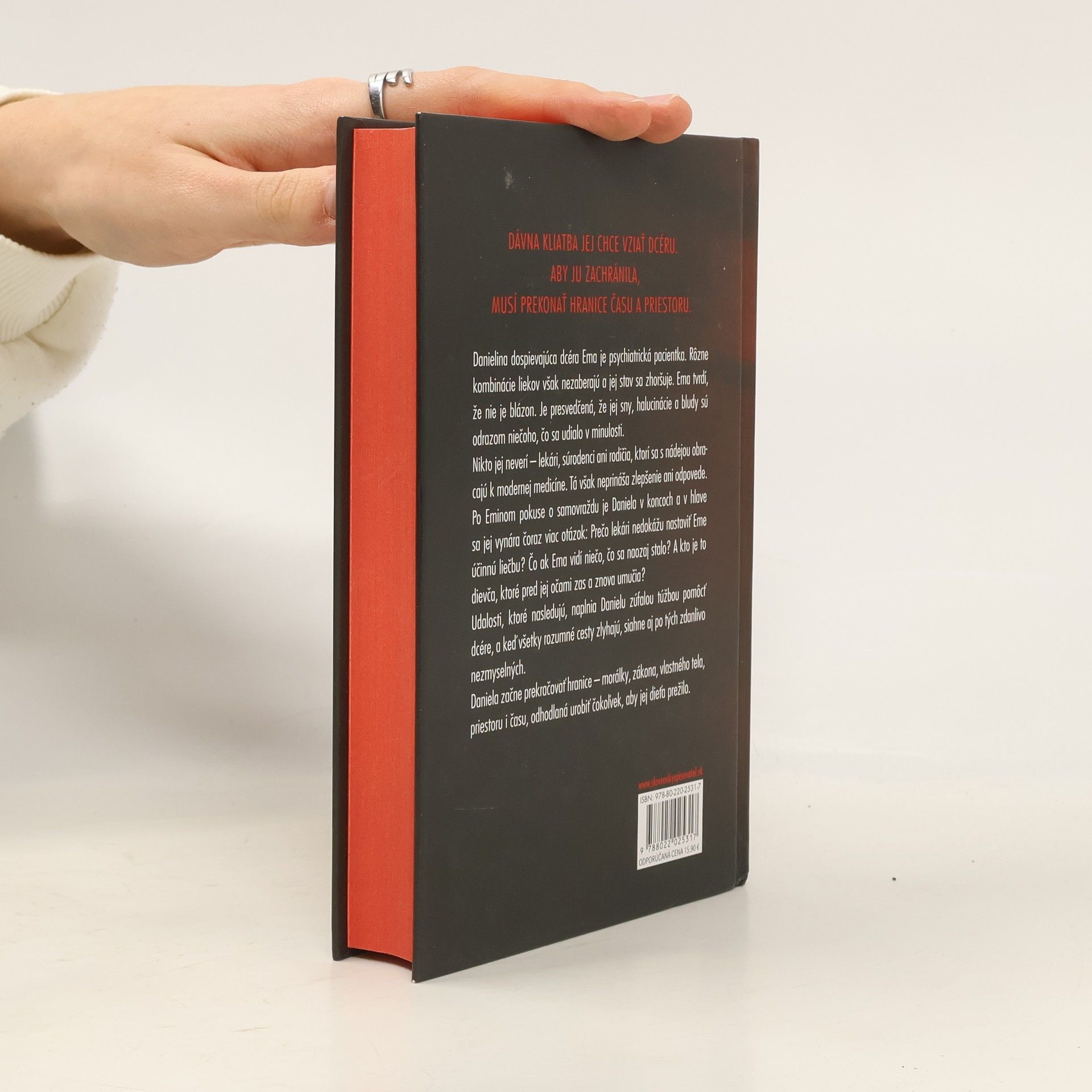 Dávna kliatba jej chce vziať dcéru. Aby ju zachránila, musí prekonať hranice času a priestoru.Danielina dospievajúca dcéra Ema je psychiatrická pacientka. Rôzne kombinácie liekov však nezaberajú a jej stav sa zhoršuje. Ema tvrdí, že nie je blázon. Je presvedčená, že jej sny, halucinácie a bludy sú odrazom niečoho, čo sa udialo v minulosti.Nikto jej neverí – lekári, súrodenci ani rodičia, ktorí sa s nádejou obracajú k modernej medicíne. Tá však neprináša zlepšenie ani odpovede.Po Eminom pokuse o samovraždu je Daniela v koncoch a v hlave sa jej vynára čoraz viac otázok: Prečo lekári nedokážu nastaviť Eme účinnú liečbu? Čo ak Ema vidí niečo, čo sa naozaj stalo? A kto je to dievča, ktoré pred jej očami zas a znova umučia?Udalosti, ktoré nasledujú, naplnia Danielu zúfalou túžbou pomôcť dcére, a keď všetky rozumné cesty zlyhajú, siahne aj po tých zdanlivo nezmyselných.Daniela začne prekračovať hranice – morálky, zákona, vlastného tela, priestoru i času, odhodlaná urobiť čokoľvek, aby jej dieťa prežilo.