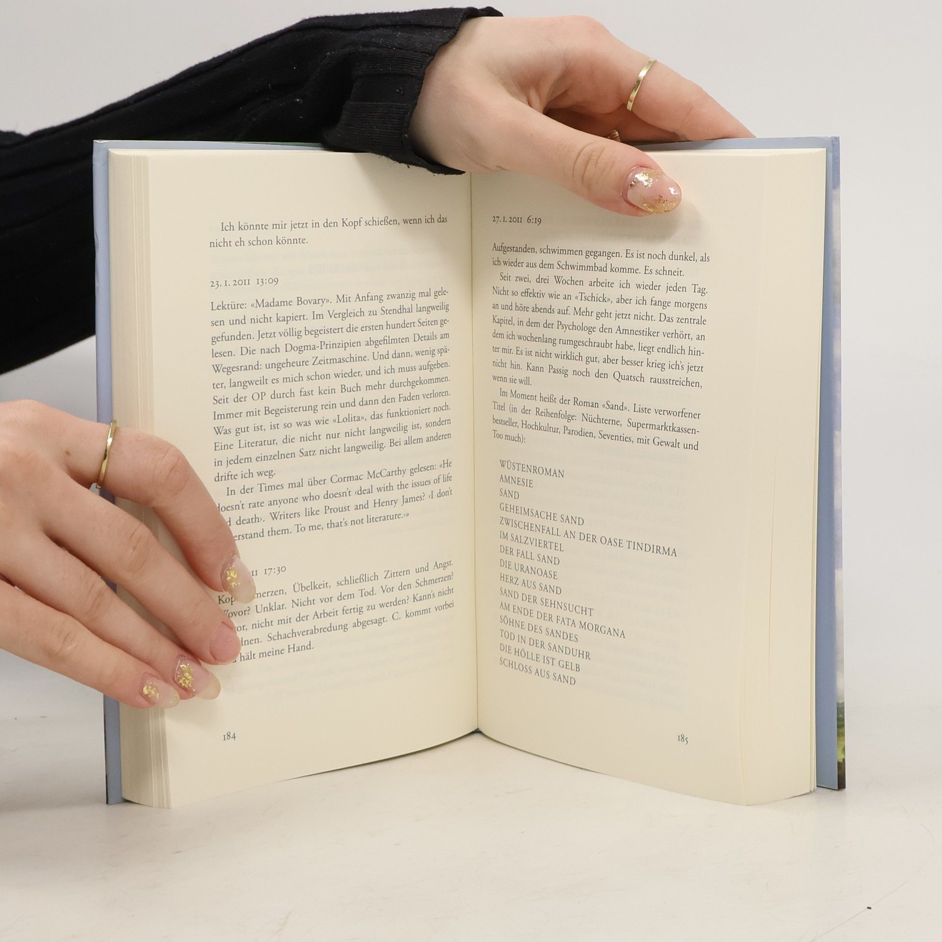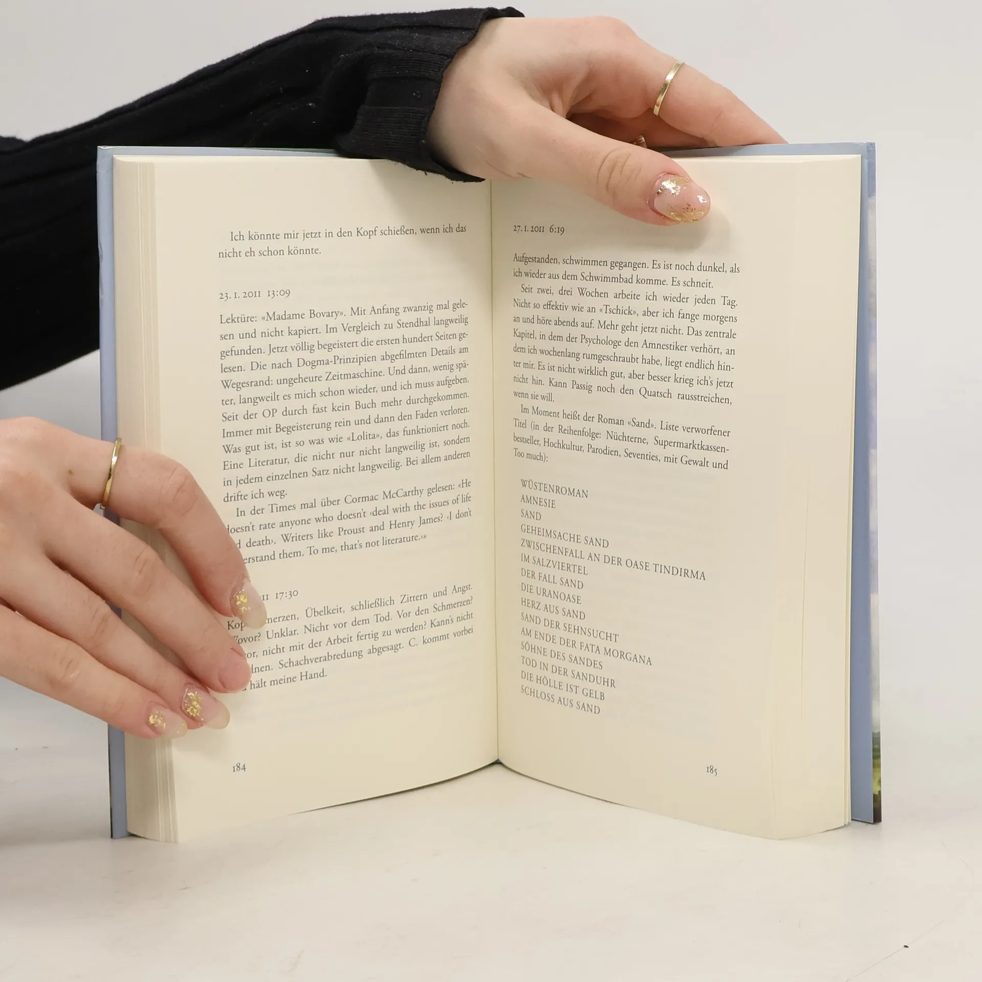„Dann Telefonat mit einem mir unbekannten, älteren Mann in Westdeutschland. Noch am Tag der Histologie war Holm abends auf einer Party mit dem Journalisten T. ins Gespräch gekommen, dessen Vater ebenfalls ein Glioblastom hat und noch immer lebt, zehn Jahre nach der OP. Wenn ich wolle, könne er mir die Nummer besorgen. Es ist vor allem dieses Gespräch mit einem Unbekannten, das mich aufrichtet. Ich erfahre: T. hat als einer der Ersten in Deutschland Temodal bekommen. Und es ist schon dreizehn Jahre her. Seitdem kein Rezidiv. Seine Ärzte rieten nach der OP, sich noch ein schönes Jahr zu machen, vielleicht eine Reise zu unternehmen, irgendwas, was er schon immer habe machen wollen, und mit niemandem zu sprechen. Er fing sofort wieder an zu arbeiten. Informierte alle Leute, dass ihm jetzt die Haare ausgingen, sich sonst aber nichts ändere und alles weiterliefe wie bisher, keine Rücksicht, bitte. Er ist Richter. Und wenn mein Entschluss, was ich machen wollte, nicht schon vorher festgestanden hätte, dann hätte er nach diesem Telefonat festgestanden: Arbeit. Arbeit und Struktur.“