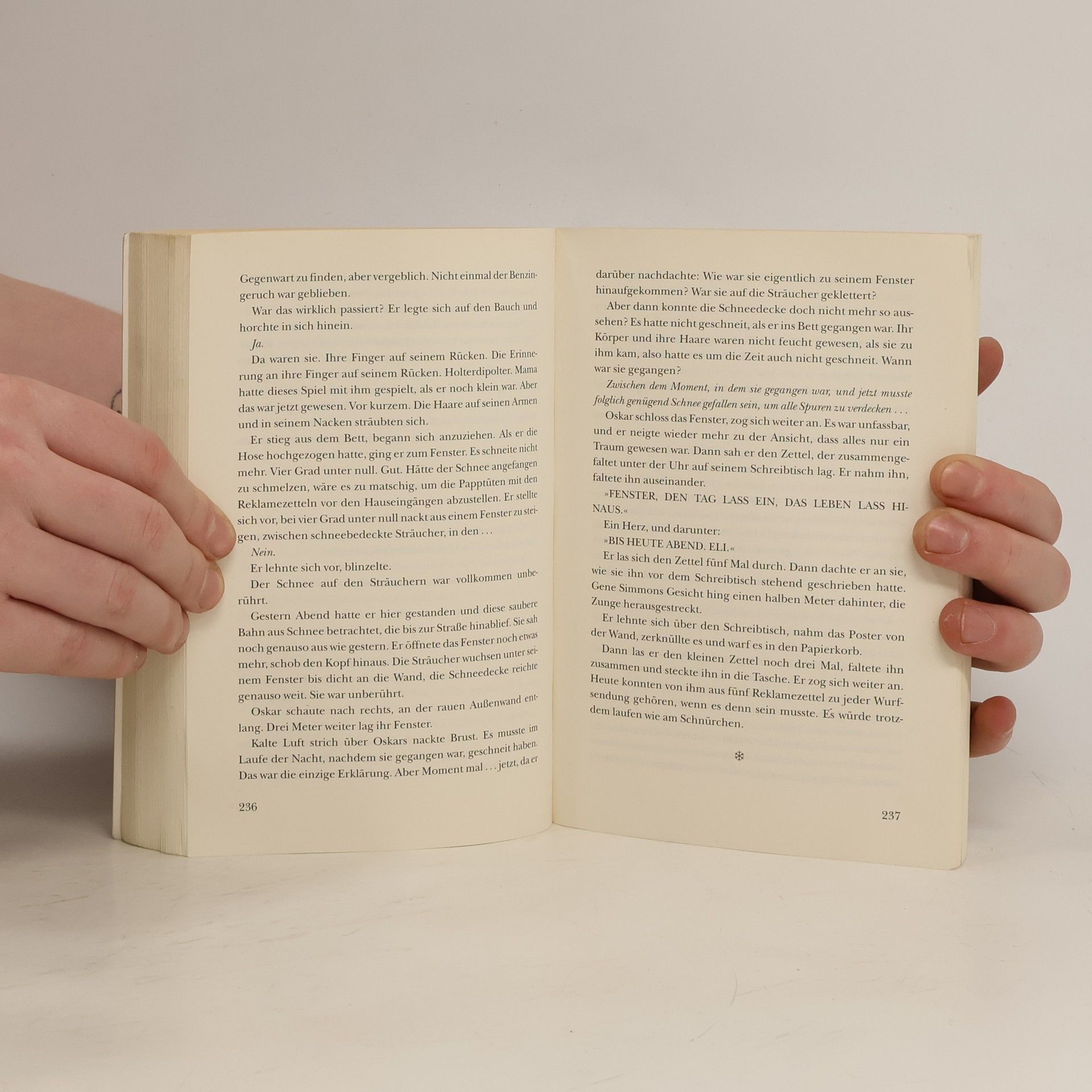 Wenn das Unfassbare Einzug hält, nimmt es anfangs niemand wahr ... In dem Stockholmer Vorort Blackeberg wird die Leiche eines Jungen gefunden. Sein Körper enthält keinen Tropfen Blut mehr. Alles deutet auf einen Ritualmörder hin. Noch ahnt niemand, was tatsächlich geschehen ist. Auch der zwölfjährige Oskar verfolgt fasziniert die Nachrichten. Wer könnte der Mörder sein? Und warum sind in der Nachbarwohnung die Fenster stets verhangen ... Eine fesselnde Geschichte über Liebe, Rache - und das Grauen.