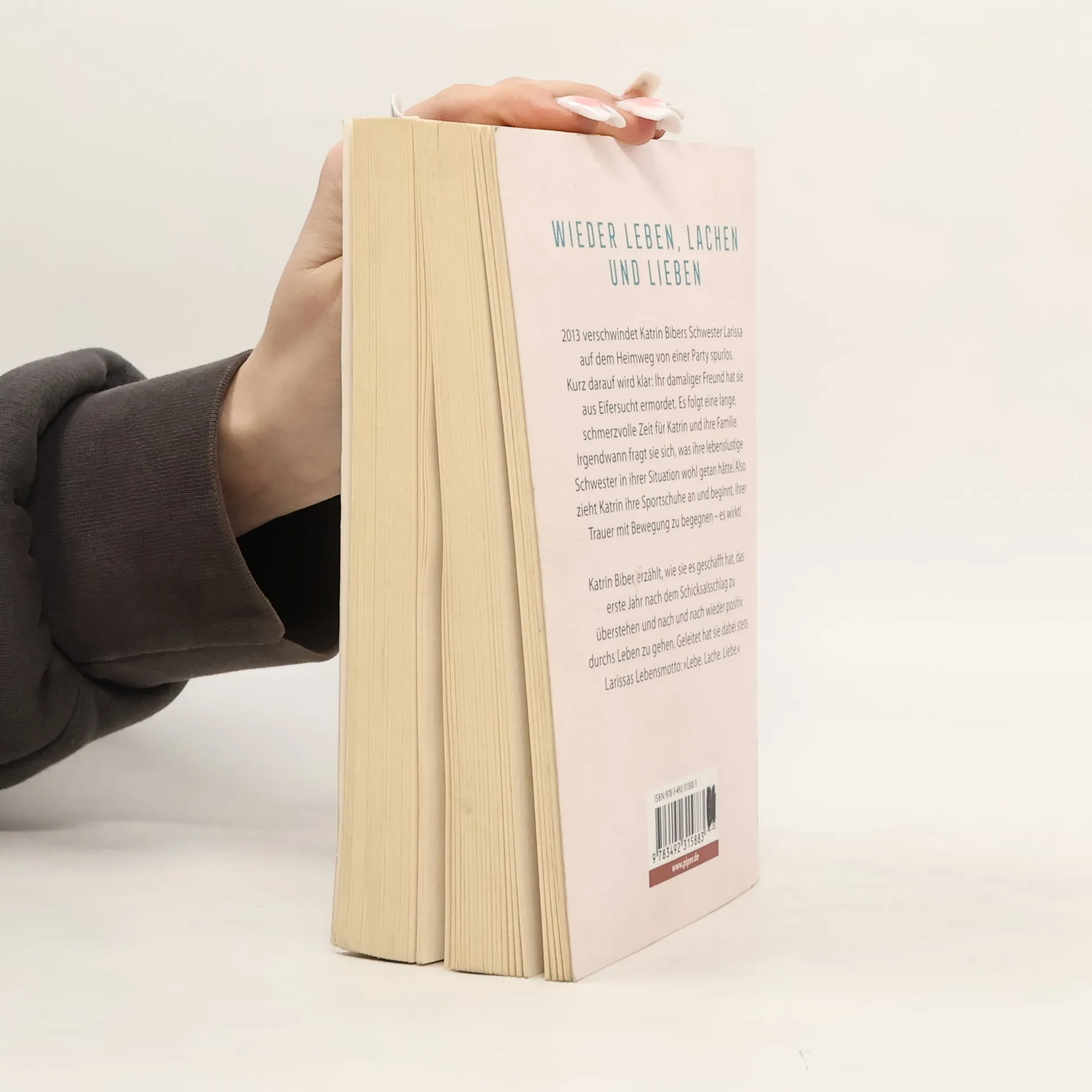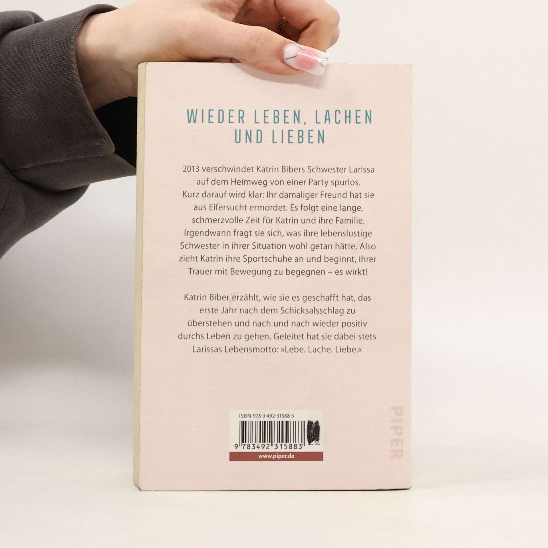 2013 verschwindet Katrin Bibers Schwester Larissa spurlos auf dem Heimweg von einer Party. Kurz darauf wird klar, dass ihr damaliger Freund sie ermordet hat. Es folgt eine lange schmerzvolle Zeit für Katrin und ihre Familie. Auch viele Angehörige und Freunde sind mit der Situation vollkommen überfordert. Irgendwann fragt sich Katrin, was ihre lebenslustige Schwester in ihrer Situation wohl getan hätte. Also zieht sie ihre Sportschuhe an und beginnt, ihrer Trauer mit Bewegung zu begegnen – es wirkt! Katrin Biber erzählt, wie sie es geschafft hat, das erste Jahr nach dem Schicksalsschlag zu überstehen und wieder positiv durchs Leben zu gehen. Geleitet hat sie dabei stets das Lebensmotto ihrer Schwester: »Lebe. Lache. Liebe.«