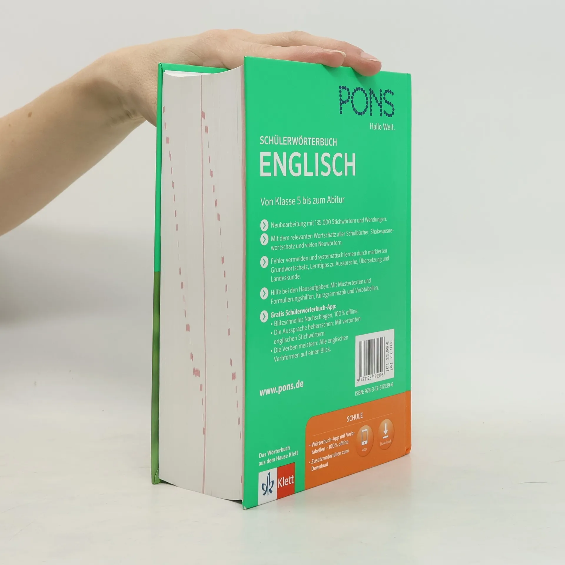 Ein unverzichtbares Nachschlagewerk für Schüler von Klasse 5 bis zum Abitur, das Englisch-Deutsch und Deutsch-Englisch umfasst. Die Neubearbeitung bietet 135.000 Stichwörter und Wendungen, einschließlich des Wortschatzes relevanter Lehrwerke sowie Shakespeare-Wortschatz und Neuwörter. Das Buch fördert systematisches Lernen durch einen markierten Grundwortschatz und Lerntipps zu Aussprache, Übersetzung und Landeskunde. Es unterstützt bei Hausaufgaben mit Mustertexten, Formulierungshilfen, Kurzgrammatik und Verbtabellen, geeignet für das Niveau B2-C1 des Europäischen Referenzrahmens. Die Schülerwörterbuch-App bietet unbegrenzte Laufzeit und ermöglicht blitzschnelles Nachschlagen, 100% offline. Sie umfasst vertonte englische Stichwörter zur Verbesserung der Aussprache sowie ausführliche Konjugationstabellen für alle im Wörterbuch enthaltenen Verben. Um die App freizuschalten, laden Schüler die PONS Schule-Bibliothek kostenlos herunter und verwenden den Code aus dem Buch. Zusätzlich stehen Downloads zur Verfügung: Mustertexte für wichtige Themen wie Bewerbungen und E-Mails sowie Formulierungshilfen für Essays für Schüler der Sekundarstufe II. Lehrer finden Arbeitsblätter mit Übungen zu Alphabet und Lautschrift, um die Nachschlagekompetenz in der Sekundarstufe I zu trainieren.