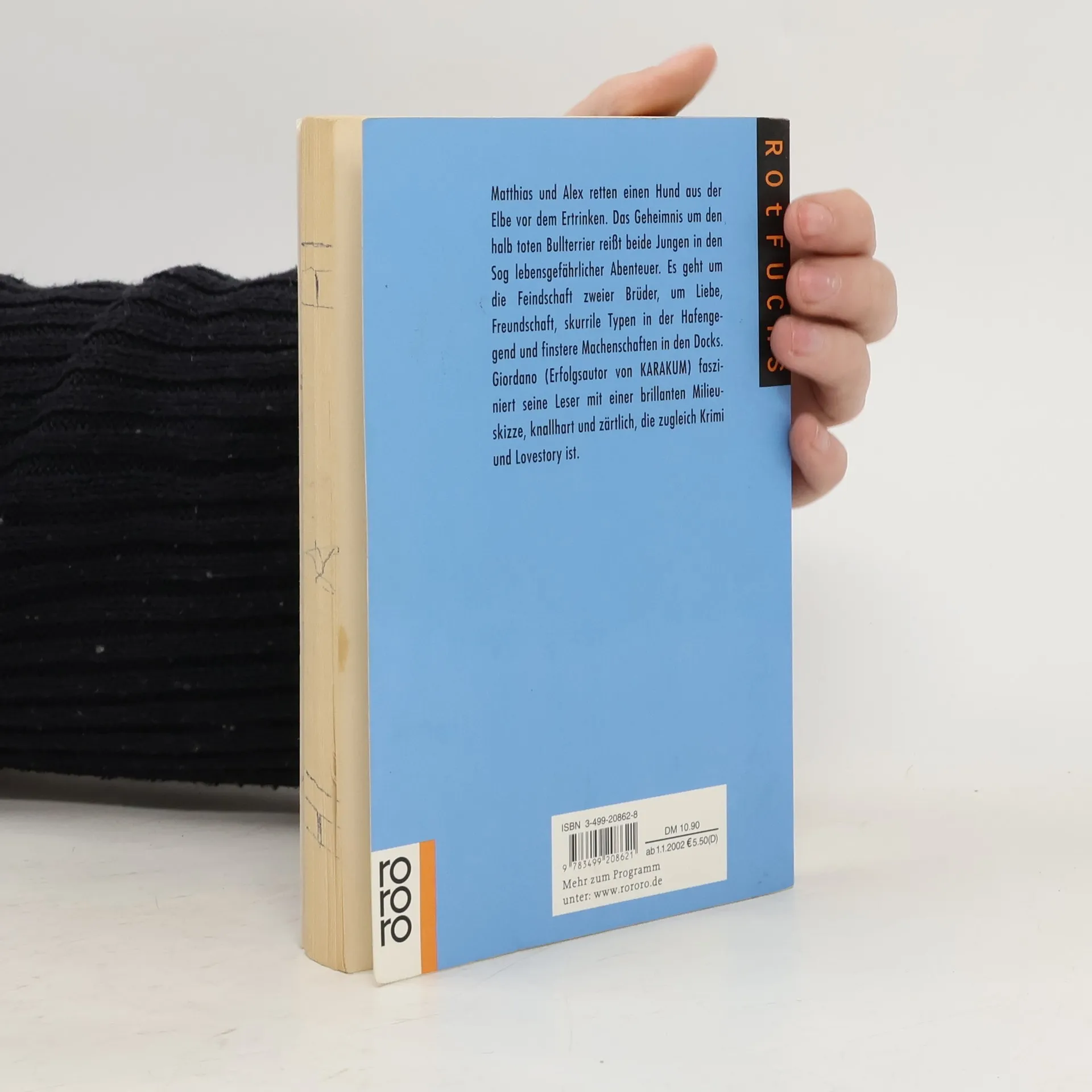 Matthias und Alex retten einen Hund vor dem Ertrinken aus der Elbe. Das Geheimnis um den halbtoten Bullterrier reißt beide Jungen in den Sog lebensgefährlicher Abenteuer. Es geht um die Feindschaft zweier Brüder, um Liebe, Freundschaft, skurrile Typen in der Hafengegend und finstere Machenschaften in den Docks. Mario Giordano fasziniert seine Leser mit einer brillanten Milieuskizze, knallhart und zärtlich, die zugleich Krimi und Lovestory ist.