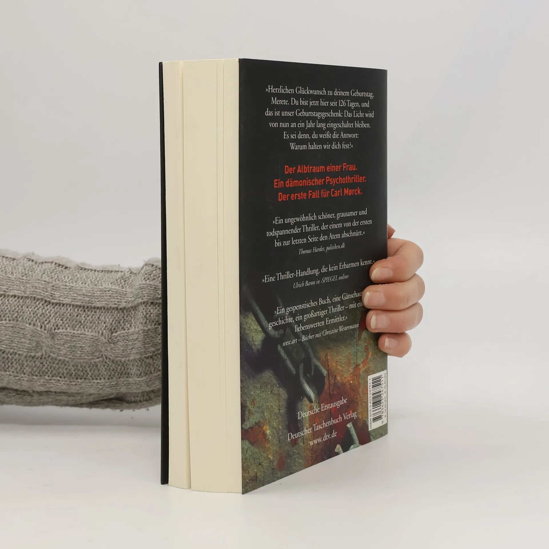 Und dann kam die Angst wie ein schleichendes Gift. Der Albtraum einer Frau.Ein dämonischer Psychothriller.Der erste Fall für Carl Mørckvom Sonderdezernat Q in Kopenhagen. Die verzerrte Stimme kam aus einem Lautsprecher irgendwo im Dunklen: »Herzlichen Glückwunsch zu deinem Geburtstag, Merete. Du bist jetzt hier seit 126 Tagen, und das ist unser Geburtstagsgeschenk: Das Licht wird von nun an ein Jahr lang eingeschaltet bleiben. Es sei denn, du weißt die Antwort: Warum halten wir dich fest?« Am 2. März 2002 verschwindet eine Frau spurlos auf der Fähre von Rødby nach Puttgarden, man vermutet Tod durch Ertrinken. Doch sie ist nicht tot, sondern wird in einem Gefängnis aus Beton gefangen gehalten. Wer sind die Täter? Was wollen sie von dieser Frau? Und: Kann ein Mensch ein solches Martyrium überleben? ››Ein ungewöhnlich schöner und hochspannender Thriller, der einem bis zur letzten Seite den Atem abschnürt.‹‹ politiken. dk Trailer ansehen auf www. adler-olsen. de