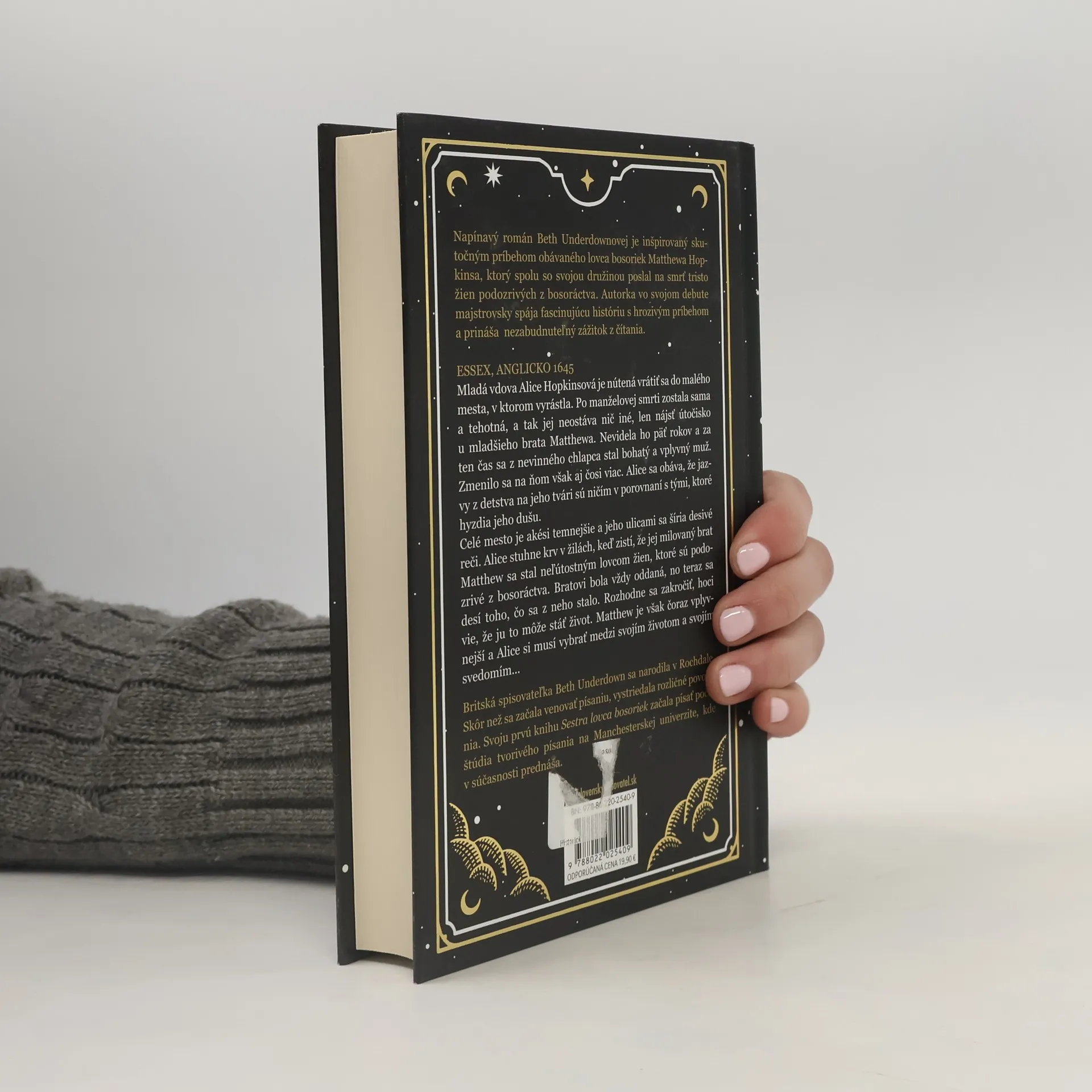 Napínavý román Beth Underdownovej je inšpirovaný skutočným príbehom lovca bosoriek Matthewa Hopkinsa, ktorý poslal na smrť tristo žien podozrivých z bosoráctva. Autorka majstrovsky spája fascinujúcu históriu s hrozivým príbehom, čím ponúka nezabudnuteľný zážitok. V Essexu v roku 1645 sa mladá vdova Alice Hopkinsová vracia do svojho rodného mesta po manželovej smrti. Tehotná a bez pomoci, hľadá útočisko u svojho brata Matthewa, ktorý sa po piatich rokoch zmenil na bohatého a vplyvného muža. Alice sa obáva, že jazvy na jeho tvári sú len odrazom hlbších rán na jeho duši. Mesto je zahalené temnotou a desivými rečami, keď Alice zistí, že Matthew sa stal neľútostným lovcom žien podozrivých z bosoráctva. Napriek oddanosti svojmu bratovi sa desí jeho premeny a rozhodne sa zakročiť, aj keď to môže stáť jej život. Matthewova moc rastie a Alice musí vybrať medzi svojím životom a svedomím. Beth Underdown, britská spisovateľka, začala písať počas štúdia na Manchesterskej univerzite, kde aj prednáša. Jej debut získal HWA Goldsboro Crown Award a stal sa bestsellerom Knižného klubu Richarda a Judy. Recenzie vyzdvihujú majstrovské prelínanie historických faktov a fikcie, pričom postava Alice patrí medzi najpozoruhodnejšie ženské postavy súčasných historických románov.