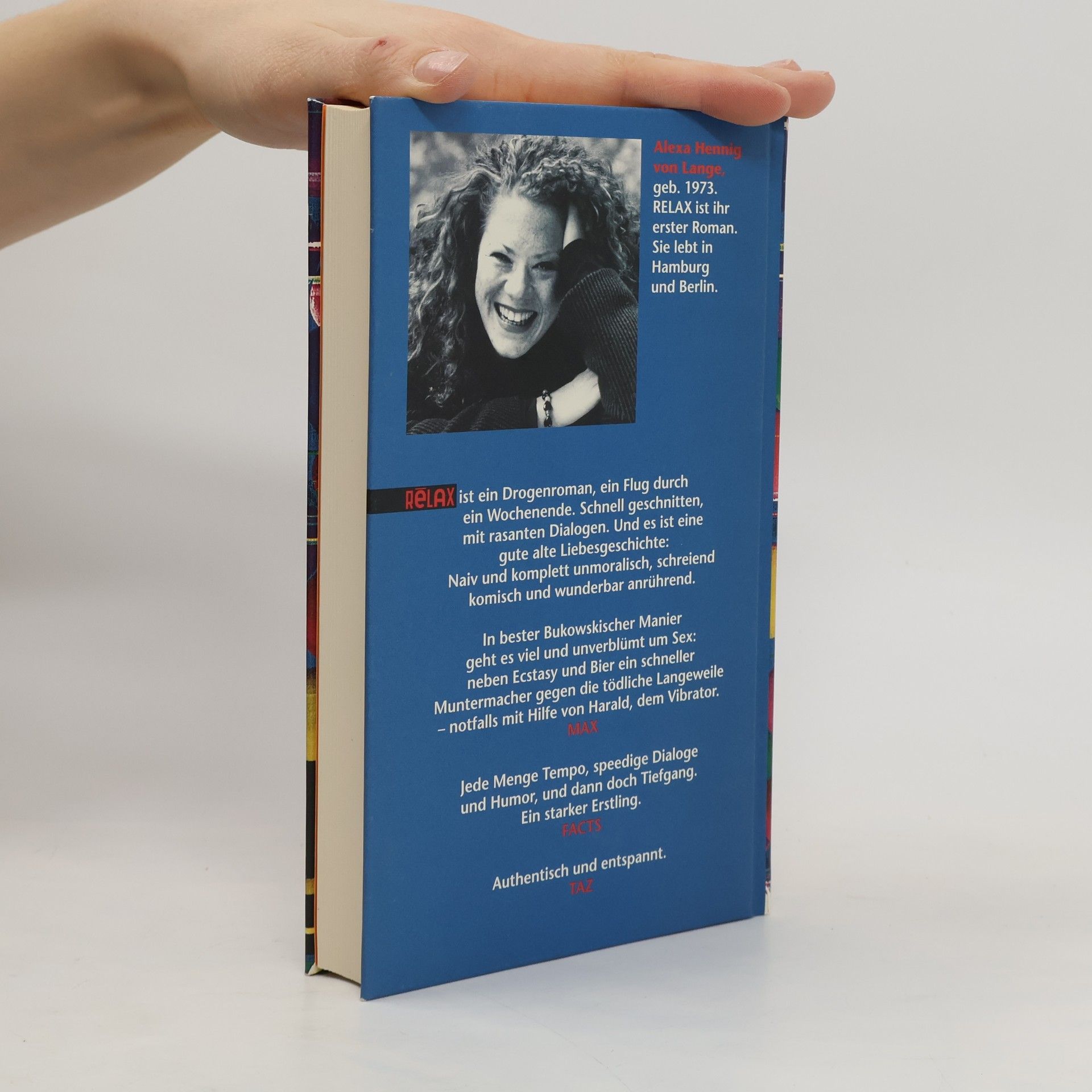 In "Relax" erzählt Alexa Hennig von Lange von jungen Leuten, die sich mit allen verfügbaren Drogen auskennen, Marihuana, Kokain, Ecstasy oder einfach unidentifizierten Pillen. "Relax" ist die Geschichte von Chris und Omek, die Chris "meine Kleine" nennt. Oder auch gern "meine kleine Ficksau", denn "die ist komplett sexsüchtig". "Relax" ist ein Flug durch ein Wochenende, schnell geschnitten, mit rasanten Dialogen. Und es ist eine gute, alte Liebesgeschichte: Naiv und komplett unmoralisch, schreiend komisch und wunderbar anrührend. Abfeiern ist angesagt - bis zum Umfallen. In bester Bukowskischer Manier geht es viel und unverblümt um Sex: neben Ecstasy und Bier ein schneller Muntermacher gegen die tödliche Langeweile - notfalls mit Hilfe von Harald, dem Vibrator. Der Leser mag ob solcher Verderbtheit bisweilen schlucken, die meiste Zeit wird er sich köstlich amüsieren.