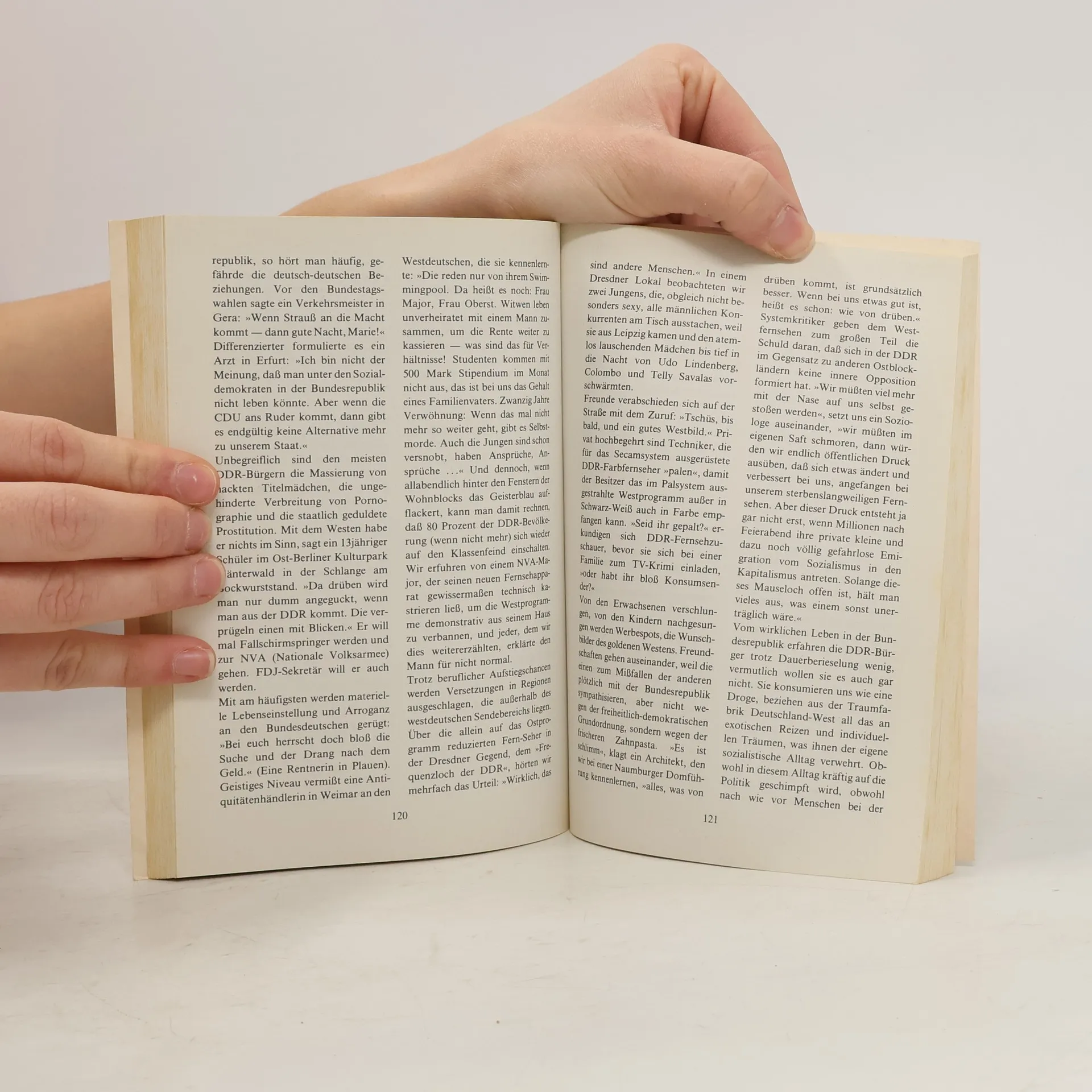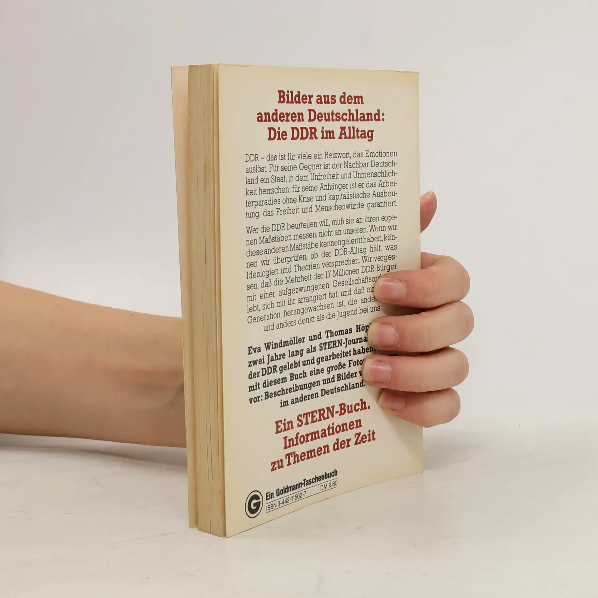 DDR: dass ist fuer viele ein Reizwort, das Emotionen ausloest. Fuer seine Gegner ist der Nachbar Deutschland ein Staat, in dem Unfreiheit und Unmenschlichkeit herrschen; fuer seine Anhaenger ist er das Arbeiterparadies ohne Krise und kapitalistische Ausbeutung, das Freiheit und Menschenwuerde garantiert. Wer die DDR beurteilen will, muss sie an ihren eigenen Massstaeben messen, nicht an unseren. Wenn wir diese anderen Massstaebe kennengelernt haben, koennen wir ueberpruefen, ob der DDR-Alltag haelt, was Ideologien und Theorien versprechen. Wir vergessen, dass die Mehrheit der 17 Millionen DDR-Buerger mit einer aufgezwungenen Gesellschaftsordnung lebt, sich mit ihr arraniert hat, und dass eine neue Generation herangewachsen ist, die anders fuehlt und anders denkt als die jugend bei uns. Eva Windmoeller und Thomas Hoepker, die zwei Jahre lang als STERN-Journalisten in der DDR gelebt und gearbeitet haben, legen mit diesem Buch eine grosse Fotoreportage vor: Beschreibungen und Bilder vom Alltag im anderen Deutschland. - Back cover