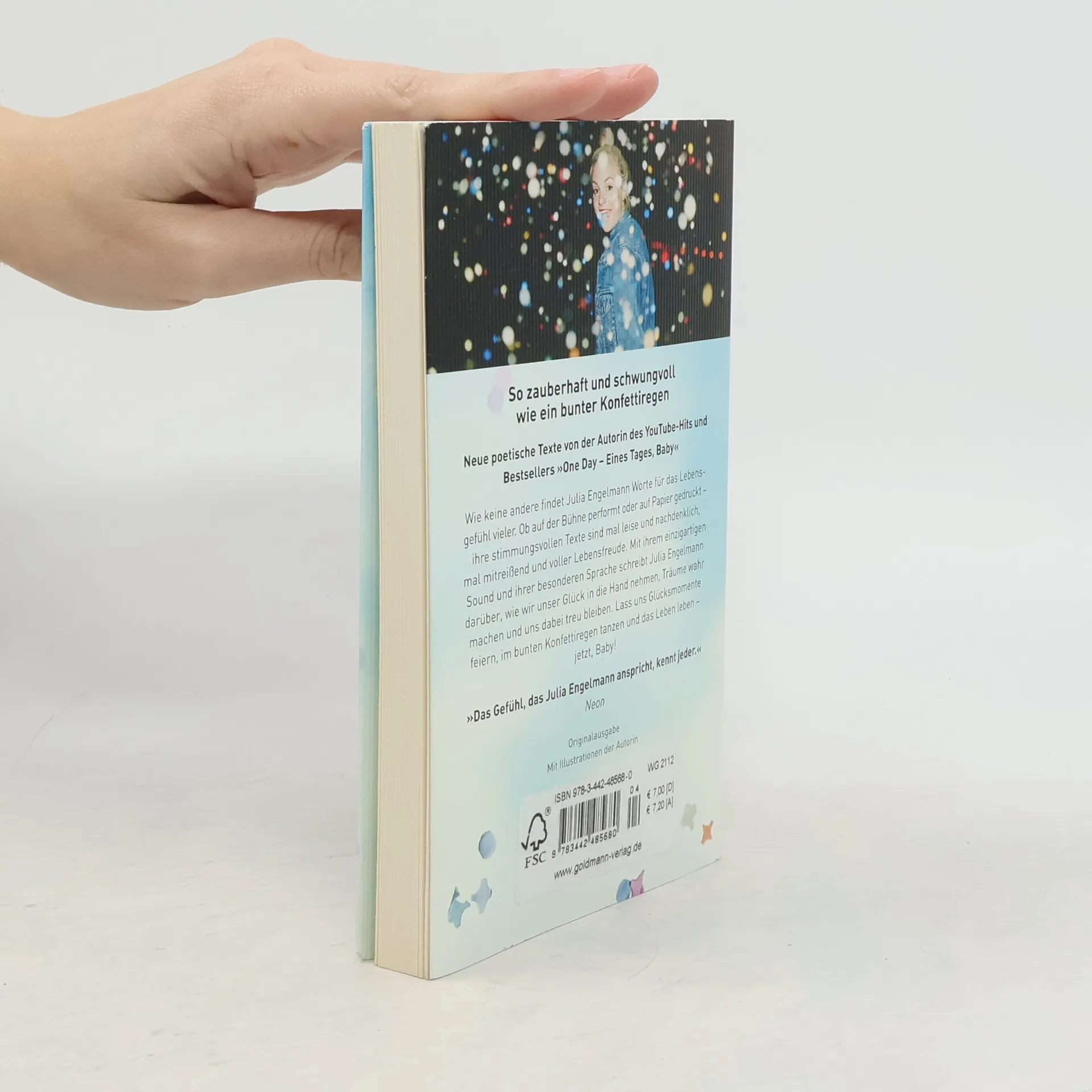 Seit ihr Slam „One Day“ ein sensationeller Interneterfolg wurde, fängt Julia Engelmann wie keine andere das Lebensgefühl einer ganzen Generation ein. Ob auf der Bühne performt oder auf Papier gedruckt – ihre Texte sind mitreißend, ehrlich und berührend. So auch in ihrem neuen Buch: Mit ihrem einzigartigen Sound und ihrer besonderen Sprache schreibt sie darüber, wie wir unser Glück in die Hand nehmen, Träume wahr machen und uns dabei treu bleiben. Lass uns Glücksmomente feiern, im bunten Konfettiregen tanzen und das Leben leben – jetzt, Baby! Ausstattung: mit farbigen Illustrationen