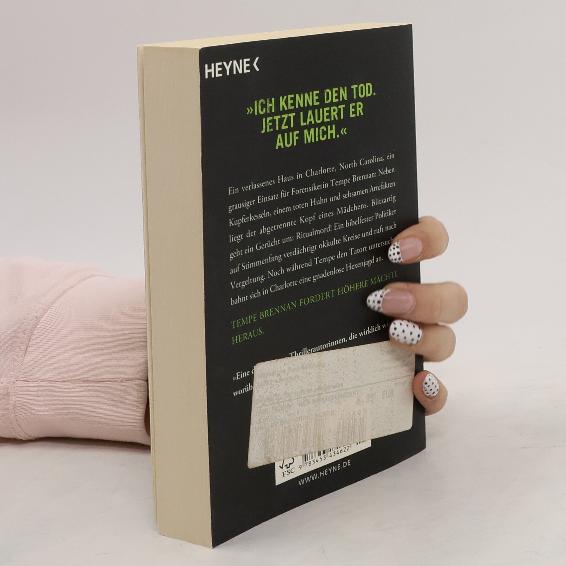 »Ich kenne den Tod. Jetzt lauert er auf mich.« Ein verlassenes Haus in Charlotte, North Carolina, ein grausiger Einsatz für Forensikerin Tempe Brennan: Neben Kupferkesseln, einem toten Huhn und seltsamen Artefakten liegt der abgetrennte Kopf eines Mädchens. Blitzartig geht ein Gerücht um: Ritualmord! Ein bibelfester Politiker auf Stimmenfang verdächtigt okkulte Kreise und ruft nach Vergeltung. Noch während Tempe den Tatort untersucht, bahnt sich in Charlotte eine gnadenlose Hexenjagd an.