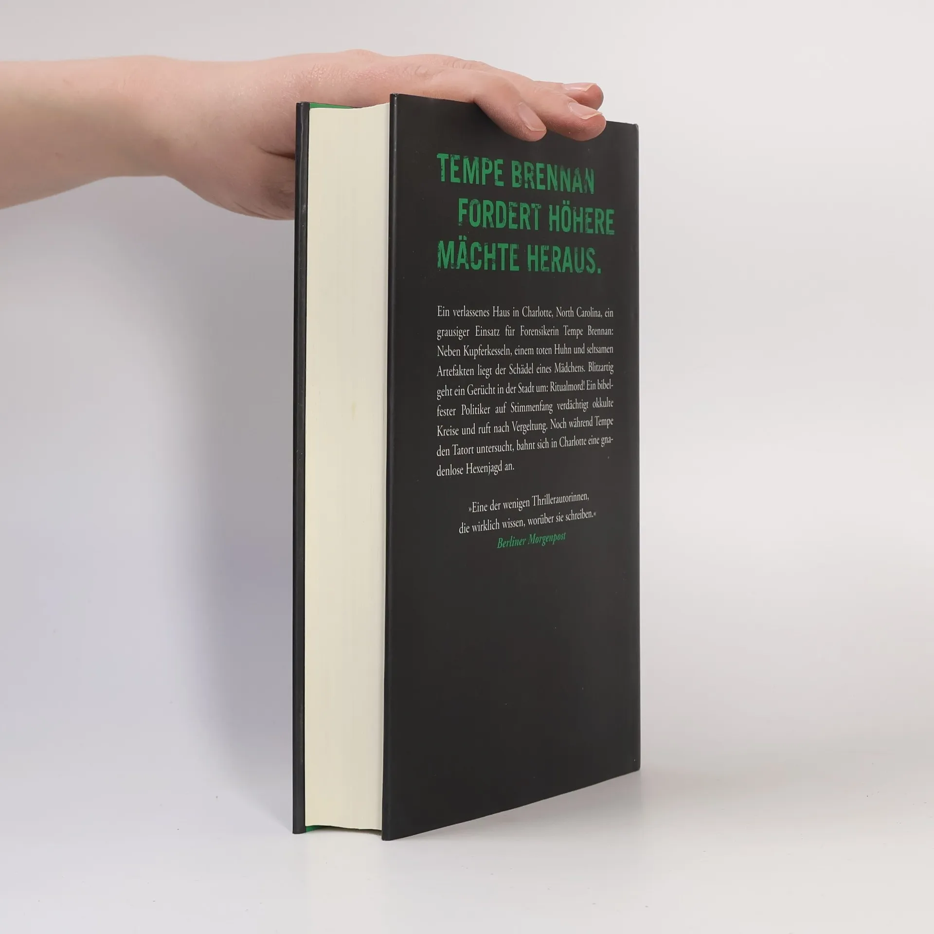 Sie werden ein Opfer bringen – Ihren Schlaf Ein verlassenes Haus in Charlotte, North Carolina, ein grausiger Einsatz für die Forensikerin Tempe Brennan: Neben Kupferkesseln und Vogelschnäbeln liegt der abgetrennte Kopf eines Mädchens. Blitzartig geht ein Gerücht um: Ritualmord! Ein bibelfester Politiker auf Stimmenfang verdächtigt okkulte Kreise und ruft nach Vergeltung. Noch während Tempe die Tatorte untersucht, bahnt sich in Charlotte eine gnadenlose Hexenjagd an. Wie und wo das junge Mädchen zu Tode kam, kann Tempe sich nicht erklären, als sie im Dunkel des Kellers kniet. Genauso wenig wie die Herkunft eines Männertorsos, der wenig später aus dem Catawba-River geborgen wird. Als der Öffentlichkeit einige außergewöhnliche Details von den Fundorten bekannt werden, geraten in North Carolina ansässige, religiöse Kulte in Verdacht: Santería, Wicca, Satanisten. Ein ehemaliger Prediger und wahlkämpfender Politiker denkt nicht daran, Brennans Ermittlungen abzuwarten. Er rät seinen Bürgern, das Gesetz selbst in die Hand zu nehmen. Und Tempe gerät zwischen die Fronten eines Kampfes zwischen höheren, finsteren Mächten.